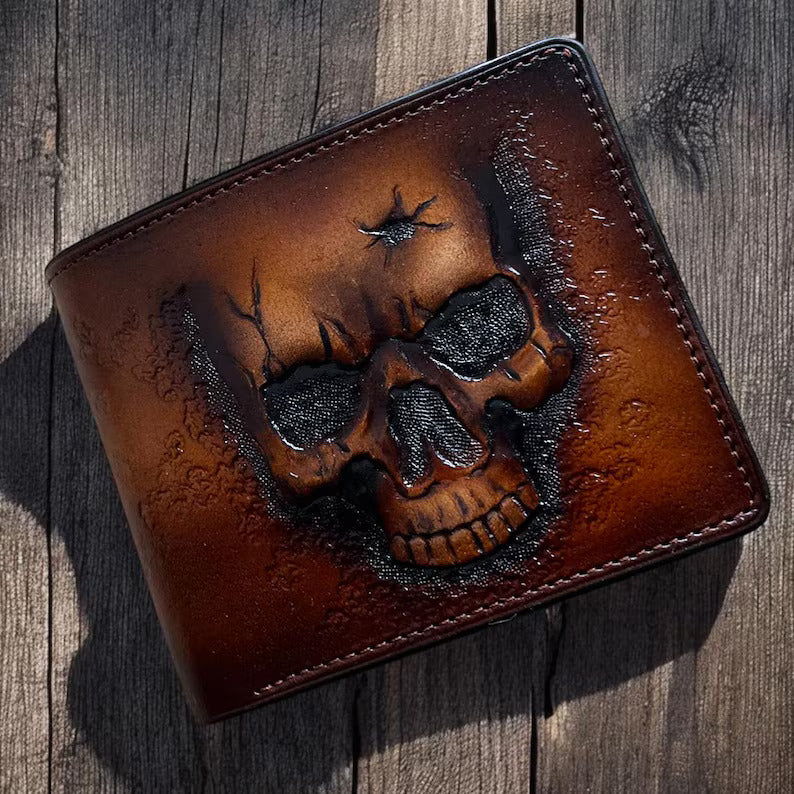 #034 Skull Leather Wallet, Harley Davidson Wallet, Moto Wallet, Bike Wallet, 3D Genuine Leather Wallet, Hand Carved Wallet, Biker Wallet, Embossed Wallet (Copy)
