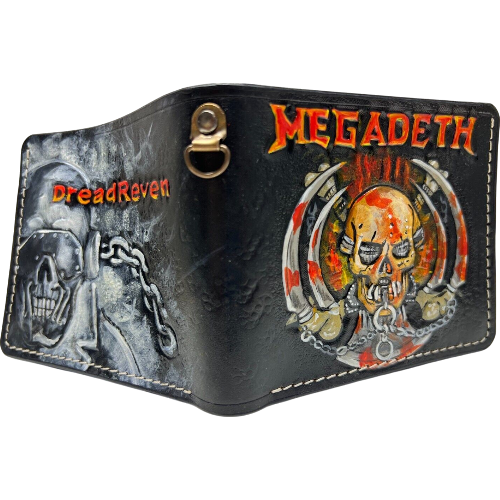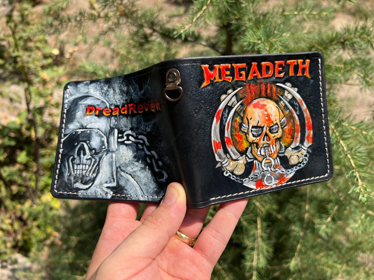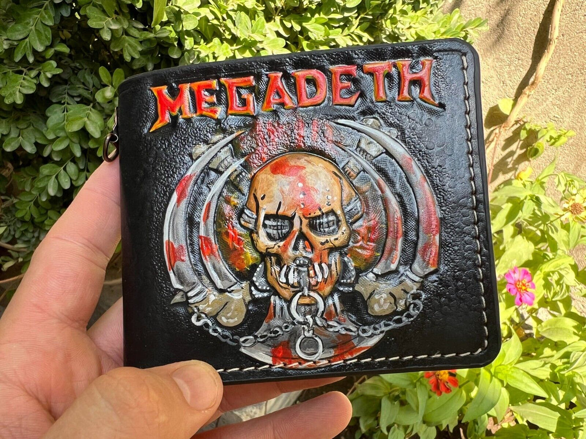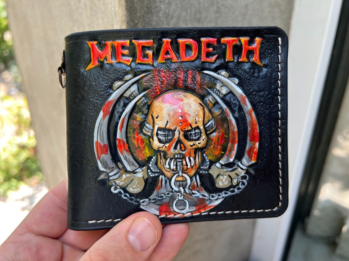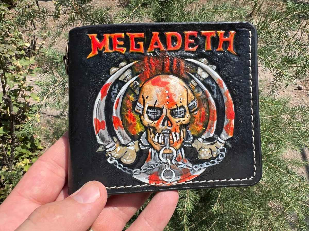 This high-quality bifold leather wallet features a bold, embossed Megadeth skull design, perfect for fans of the legendary heavy metal band. Crafted from durable, premium leather, this wallet combines style and functionality, offering plenty of space for cards and cash. Whether you're attending a concert or just showing off your love for Megadeth, this wallet is the ideal accessory. The edgy skull design adds a rock-inspired twist to a classic bifold wallet, making it a great gift for him. Practical, stylish, and built to last, this wallet is a must-have for metal music fans and collectors alike.