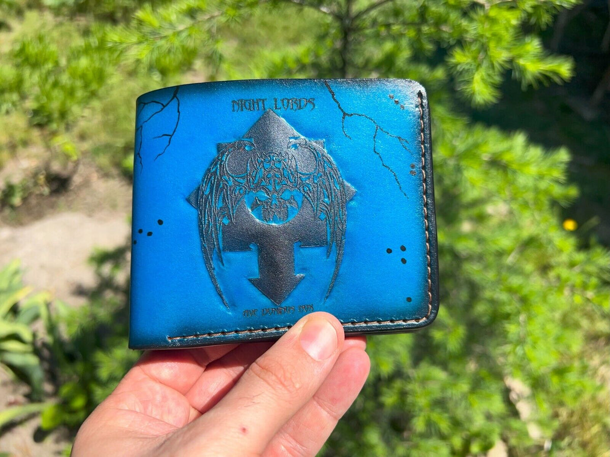 This premium bifold leather wallet features a bold embossed design of Haunter, the iconic symbol of the Night Lords from Warhammer 40K. Designed for fans of the dark and gritty universe of Warhammer 40K, this wallet combines high-quality leather with an intricate, war-torn aesthetic. Ideal for everyday use, it offers ample space for cards, cash, and ID, while showcasing your love for the Warhammer 40K universe. Whether you're looking to treat yourself or find the perfect gift for him, this wallet is a unique and functional accessory. With its durable construction and striking design, it's the perfect piece for any Warhammer 40K fan or collector.