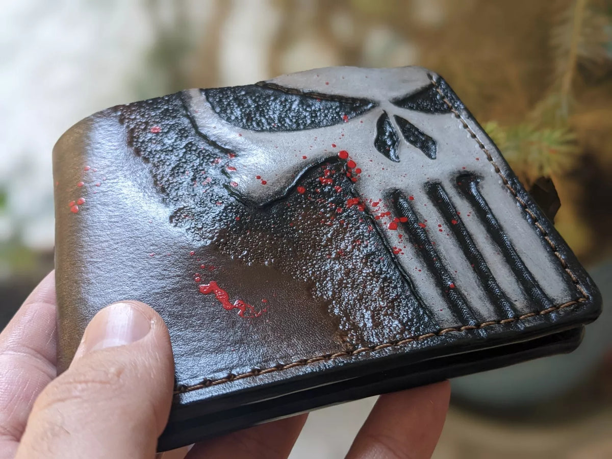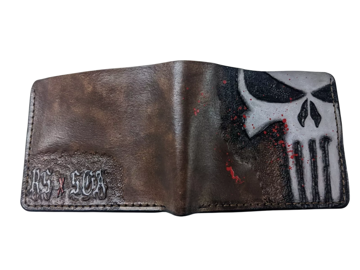 #029 Hand Tooled Blood Punisher Skull Leather Bifold Wallet – Embossed Biker Wallet, Unique Gift for Him