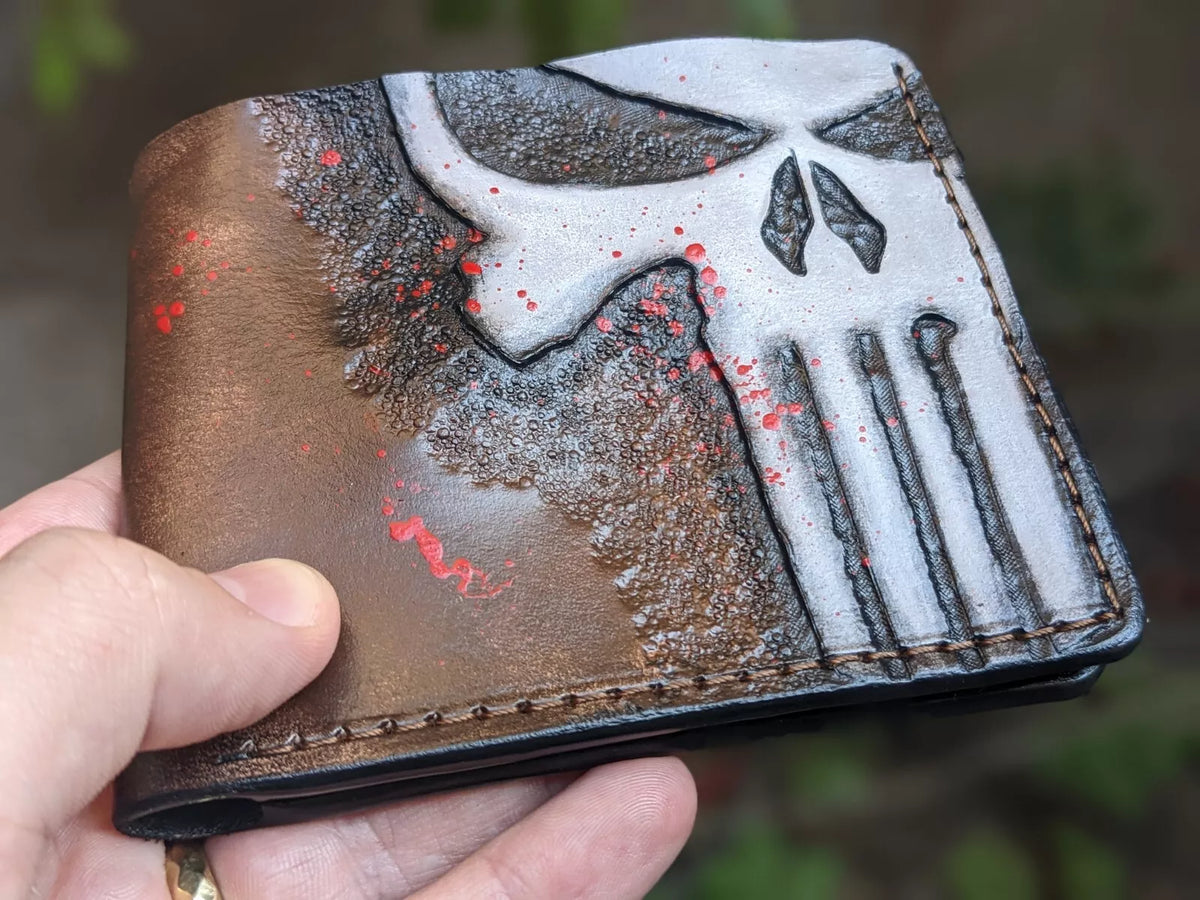 Unleash the power of the Punisher with this handmade, hand-tooled leather bifold wallet featuring an iconic Punisher skull design. Ideal for bikers, comic fans, and anyone who embraces bold, rebellious style, this wallet blends exceptional craftsmanship with a fierce design. The embossed Punisher skull stands out on premium leather, creating a rugged look that’s perfect for daily carry. With ample space for cards, cash, and ID, this wallet is as practical as it is striking. Whether you’re a Punisher fan or looking for a bold gift for him, this wallet is a statement piece that combines durability, style, and attitude.