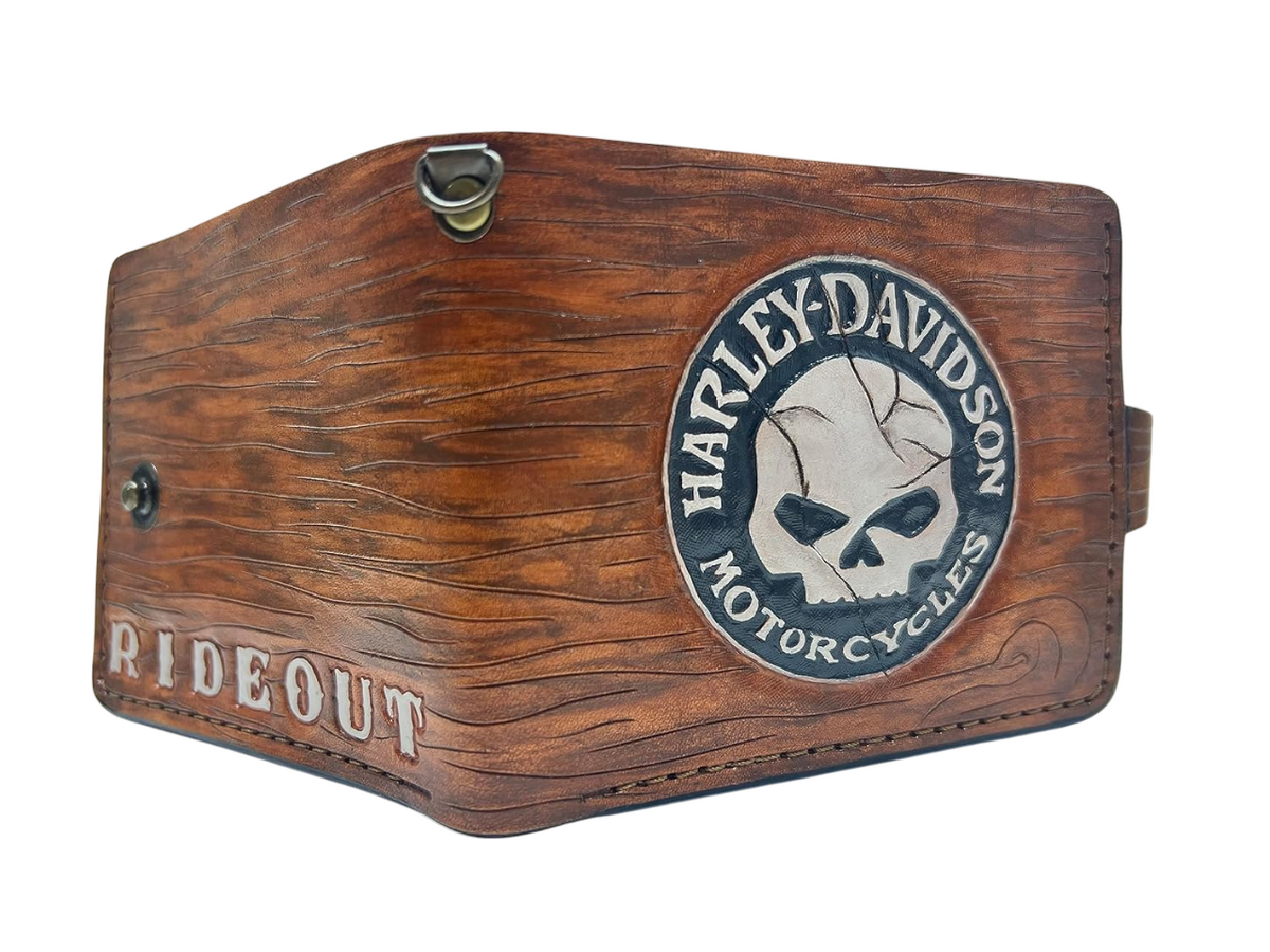 Explore our exclusive collection of handcrafted leather wallets, featuring bold skull designs, Harley Davidson-inspired bike wallets, and durable bifold holders. Each wallet is meticulously hand-tooled by skilled artisans, showcasing exceptional craftsmanship and attention to detail. Designed for motorcycle enthusiasts and those who appreciate distinctive, high-quality accessories, these wallets combine both style and functionality. Whether you're looking for a tough, stylish biker wallet, a sleek bifold holder, or a wallet that embodies the spirit of the open road, our leather wallets are made to last. Crafted from premium leather, they make the perfect gift or personal indulgence for anyone who loves moto culture.