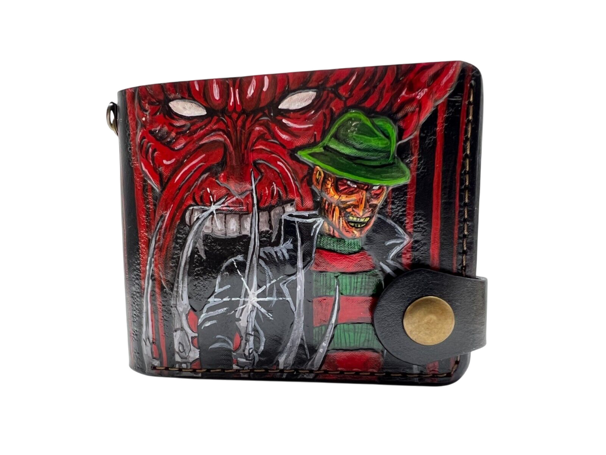 Step into the world of horror with our handcrafted Freddy Krueger wallets and A Nightmare on Elm Street-inspired designs. Each leather wallet is meticulously hand-tooled and embossed with terrifyingly detailed artwork that captures the essence of these iconic horror figures. Perfect for bikers and horror movie fans alike, these wallets combine style, durability, and a love for the macabre. The embossed Freddy Krueger and Nightmare designs give these wallets a unique edge, while the high-quality leather ensures they last for years. Whether you're looking for a distinctive biker wallet or a collector's piece, these wallets offer a perfect blend of craftsmanship and horror-inspired art.