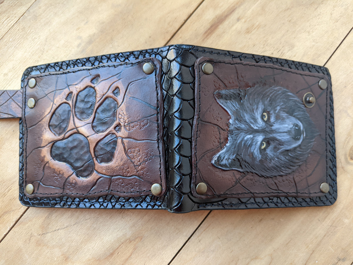 M1A15, Gray Wolf Paw Handmade Embossed Bifold Leather Wallet