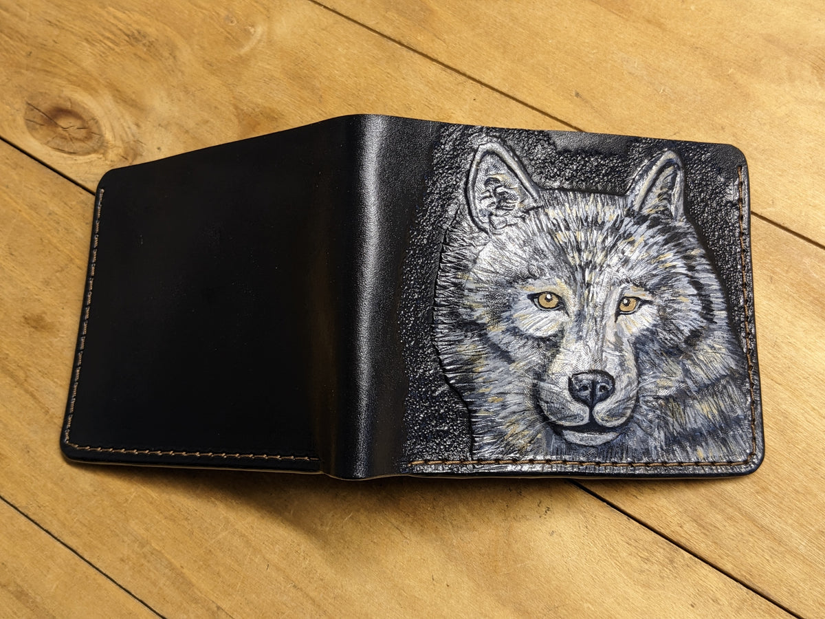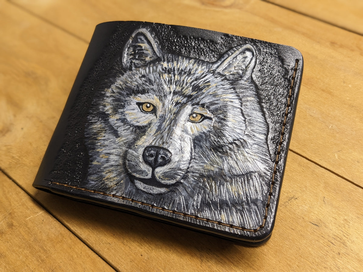 M1A19, Gray Wolf Handmade Embossed Bifold Leather Wallet
