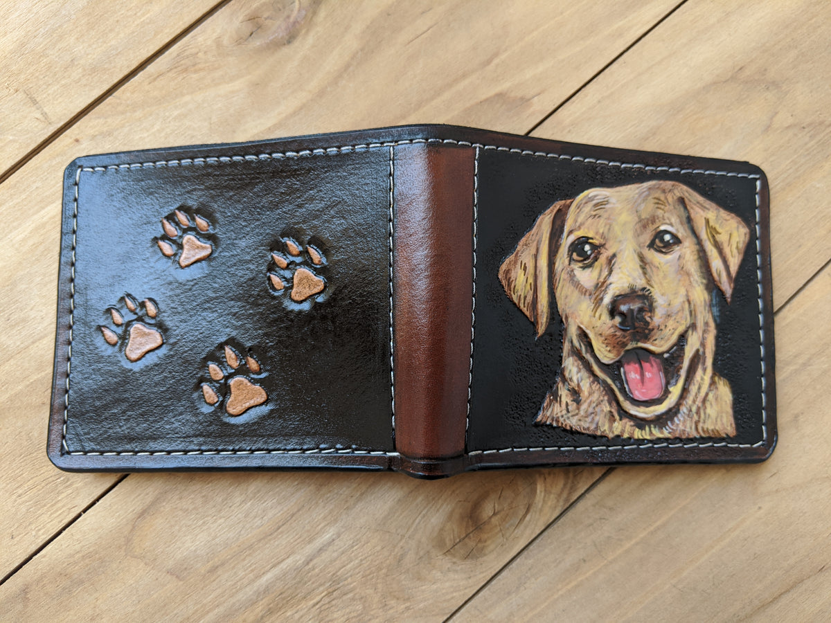 Celebrate your love for Labrador Retrievers with this handmade leather bifold wallet featuring an embossed and custom paw or pet portrait design. Perfect for dog lovers, this wallet combines artistic craftsmanship with everyday practicality. It’s equipped with RFID protection to keep your information secure and built with durable leather for long-lasting use. An ideal gift for pet owners, dog enthusiasts, or anyone who cherishes their furry friends—perfect for any special occasion.
