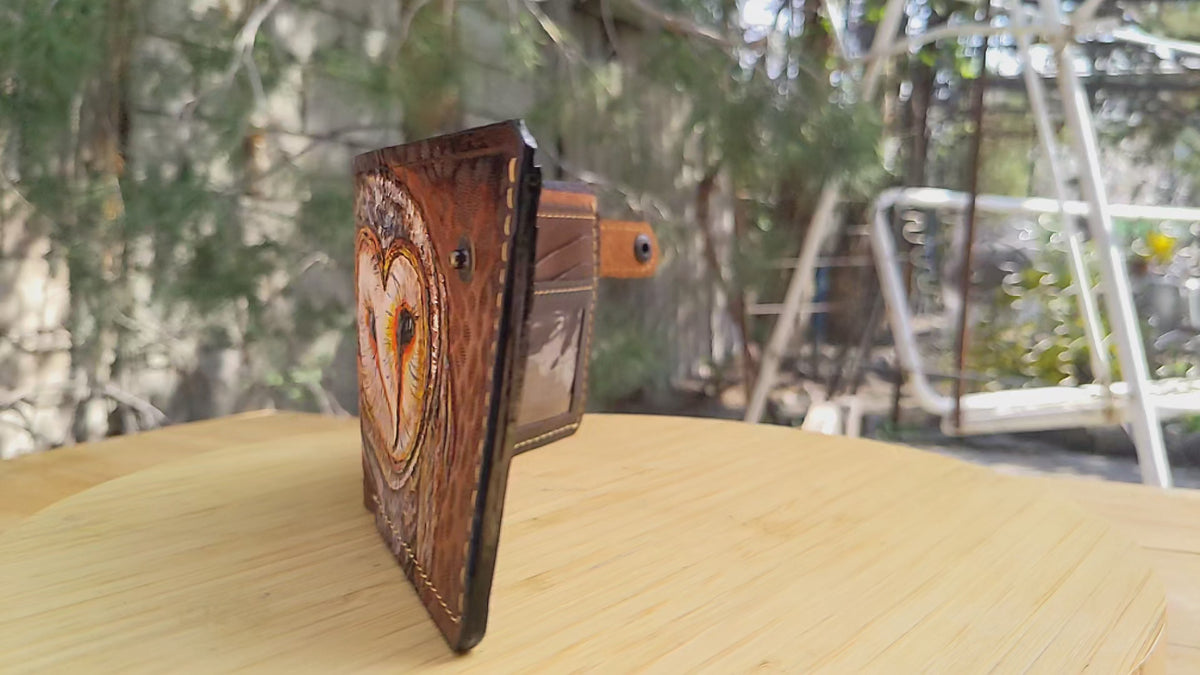 Experience the charm of nature with this handmade bifold leather wallet, featuring an intricately embossed and painted barn owl design. Inspired by the elegance of Tyto and great horned owls, this wallet captures the beauty of these majestic birds. Crafted with premium leather and equipped with RFID protection, it offers a blend of style, functionality, and security. Perfect as a biker wallet or a thoughtful gift for owl enthusiasts, this wallet is ideal for any occasion, including birthdays, Father’s Day, or as a unique keepsake for bird lovers.