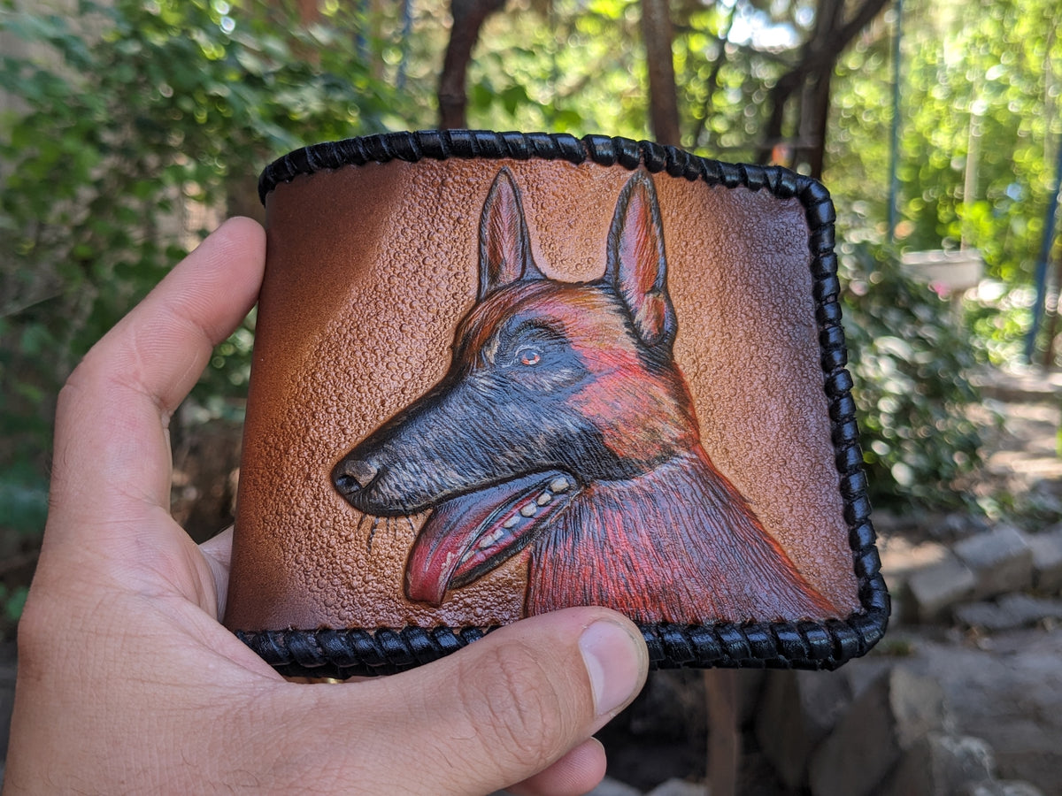 Celebrate your love for dogs with this handmade leather bifold wallet featuring an embossed and painted German Shepherd design. Perfect for pet lovers, this biker wallet is crafted for durability and includes RFID protection to keep your personal information safe. Whether you're a proud owner of a German Shepherd or looking for a unique gift for a dog lover, this wallet offers a blend of artistry and functionality. Ideal for Father's Day, birthdays, or any special occasion, it’s a thoughtful and stylish pet lover's gift.