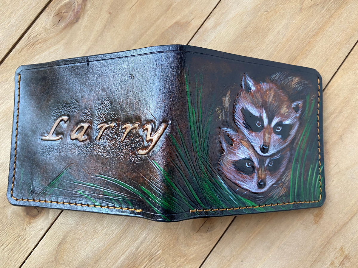 This handmade leather bifold wallet, featuring an intricately embossed and painted raccoon design, is a perfect blend of craftsmanship and functionality. Ideal for coonhunters, hunters, and outdoor enthusiasts, it includes RFID protection to keep your personal information safe. Designed as a biker wallet, it embodies durability and style. A thoughtful gift for raccoon lovers and hunters, it’s perfect for Valentine's Day, Father's Day, or any special occasion. Celebrate the adventurous spirit of hunting with this unique wallet that combines artistry and practicality.