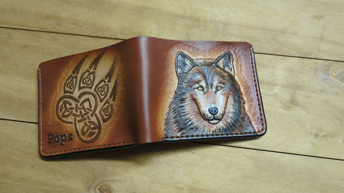 Celebrate the beauty of nature with this handmade gray wolf bifold leather wallet, featuring embossed claw and paw designs paired with intricate Celtic knot patterns. This artisan-crafted wallet offers RFID protection and a unique footprint art style, making it both functional and stylish. Perfect for hunters, outdoor enthusiasts, and wolf lovers. Ideal as a thoughtful gift for him, a Valentine’s Day surprise, or any special occasion.