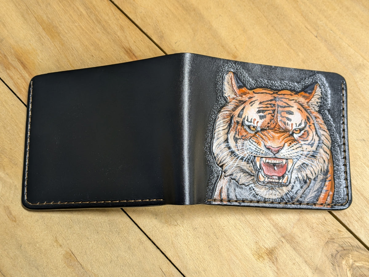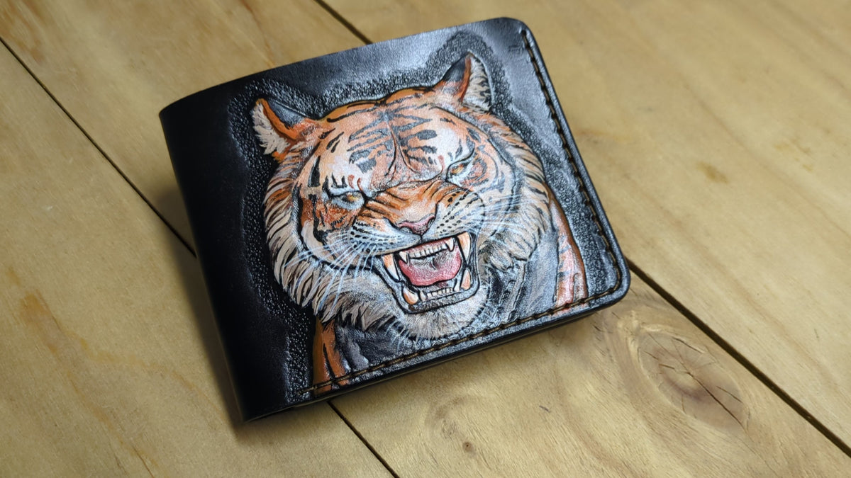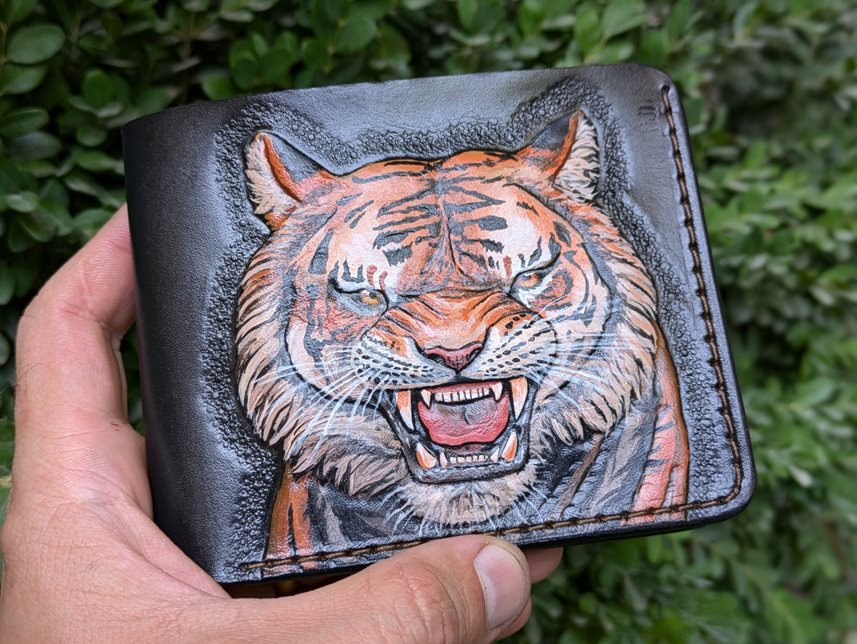 Experience the wild spirit of the jungle with this handmade leather bifold wallet featuring a stunning embossed Bengal tiger design. Meticulously crafted with carved and painted details, this wallet offers RFID protection for secure use. Perfect for bikers, big cat enthusiasts, and anyone who admires majestic wildlife. A unique tiger gift for him, ideal for Valentine’s Day, birthdays, or any special occasion.