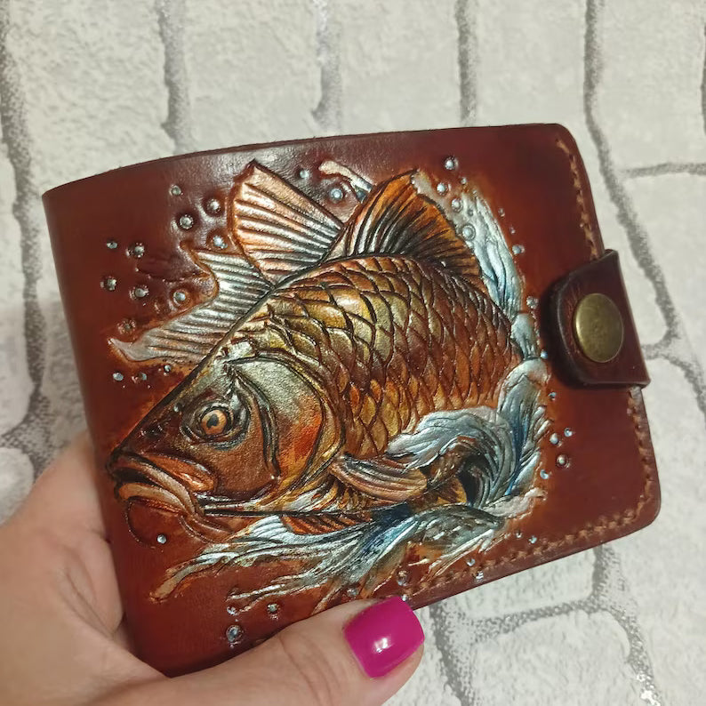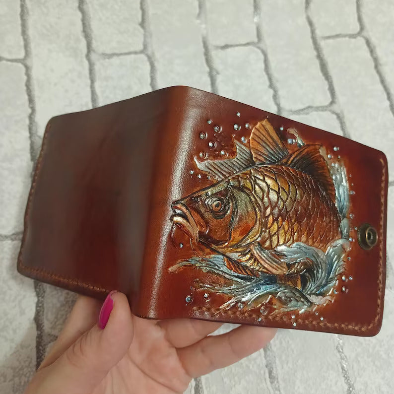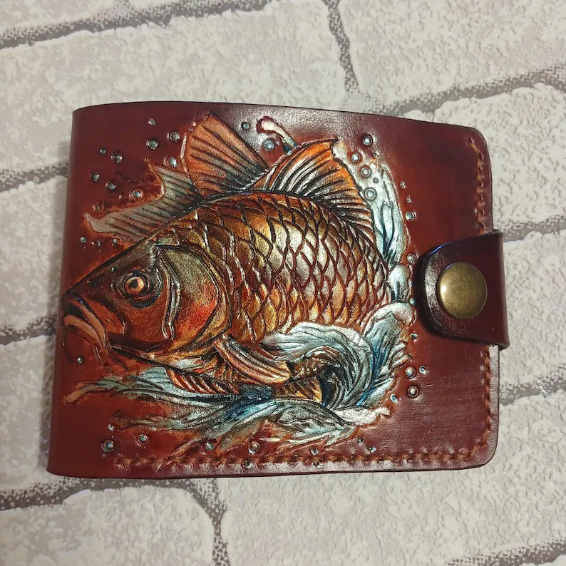 Handmade leather bifold wallet featuring an embossed bass fishing and carp design, perfect for anglers and fishing enthusiasts. This durable and stylish wallet comes with RFID protection and is ideal for bikers and outdoorsmen. A thoughtful gift for him, perfect for Father’s Day or any special occasion celebrating a love for fishing and the outdoors.