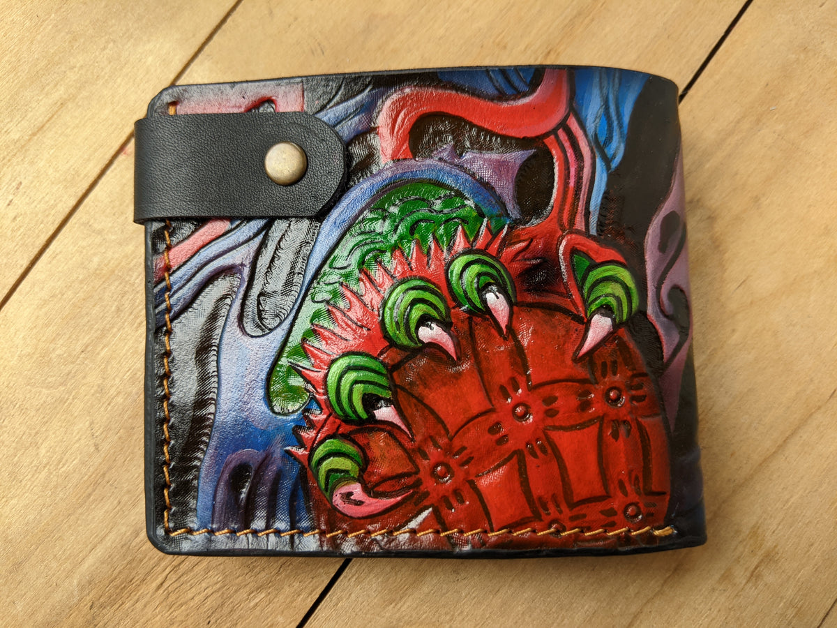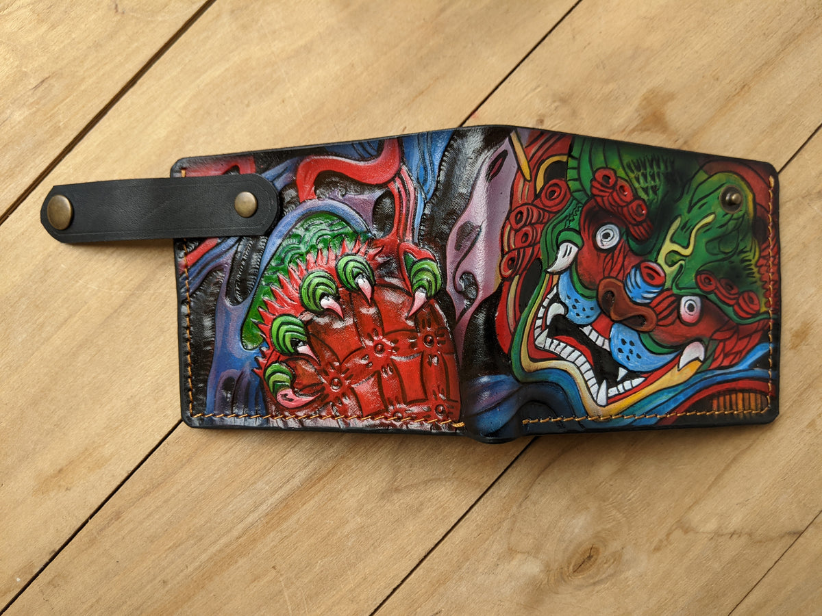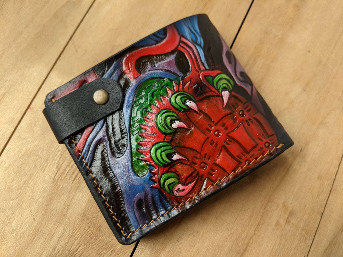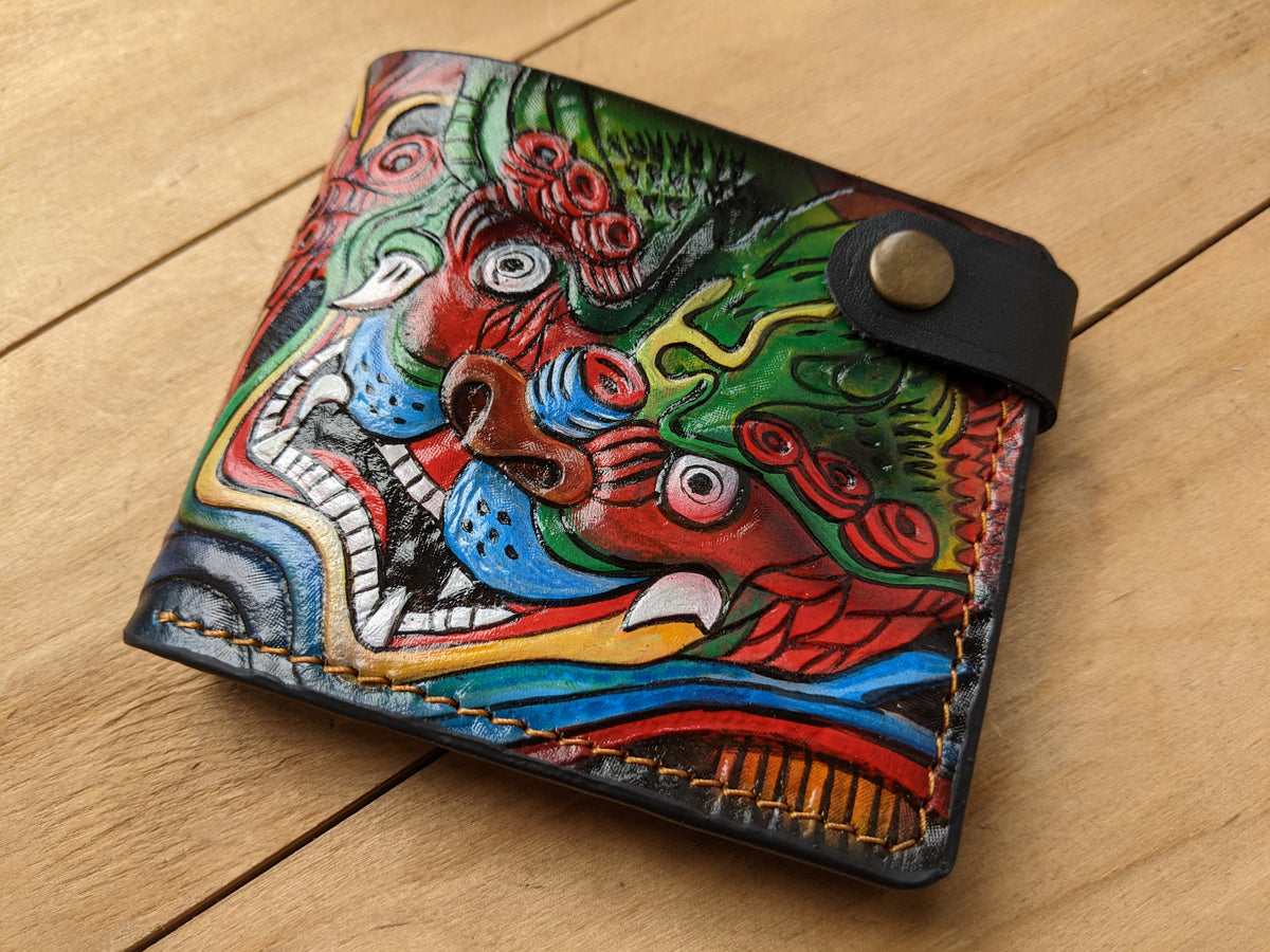 Our exquisite handmade Genuine leather wallet, crafted from high-quality Full Grain Vegetable Tanned Leather. This unique wallet features stunning hand-tooled and hand-painted designs, making it a true work of art.
