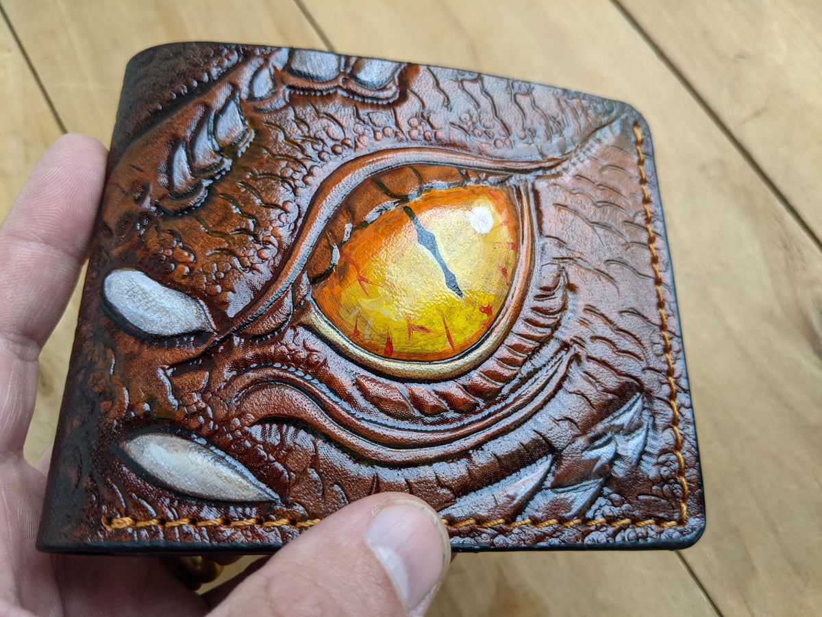 Unleash the mystique of mythical creatures with this Dragon Eye bifold leather wallet, featuring an intricately embossed design of a fiery dragon's gaze inspired by Smaug. Handmade with exceptional craftsmanship, this wallet boasts flaming dragon details, bold textures, and RFID protection for modern security. Perfect for bikers, fantasy lovers, or as a unique Valentine's Day or Chinese-inspired gift, it’s a stunning accessory for him.