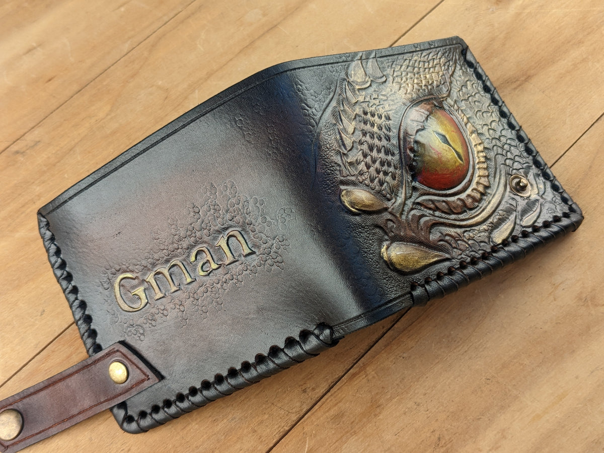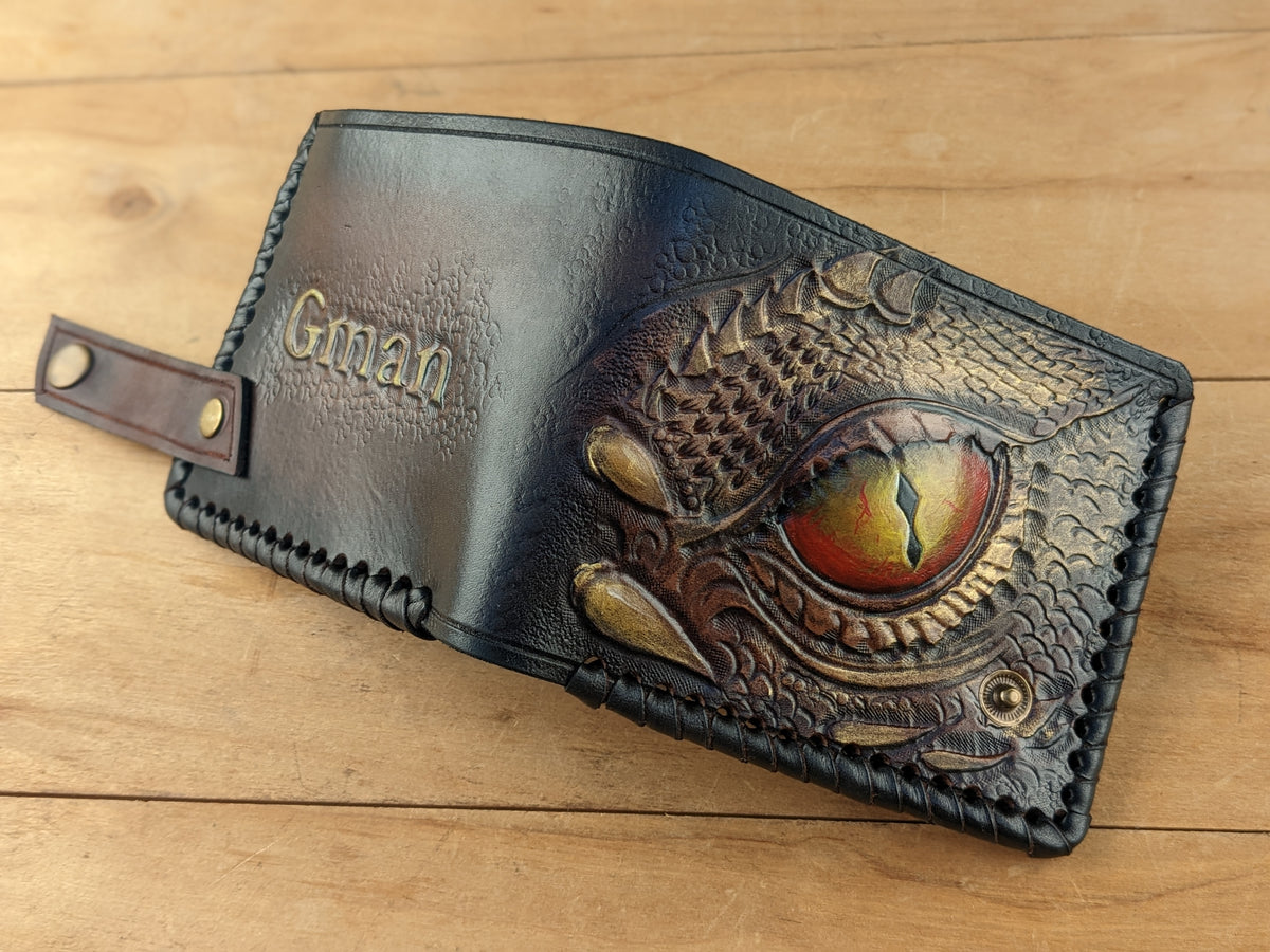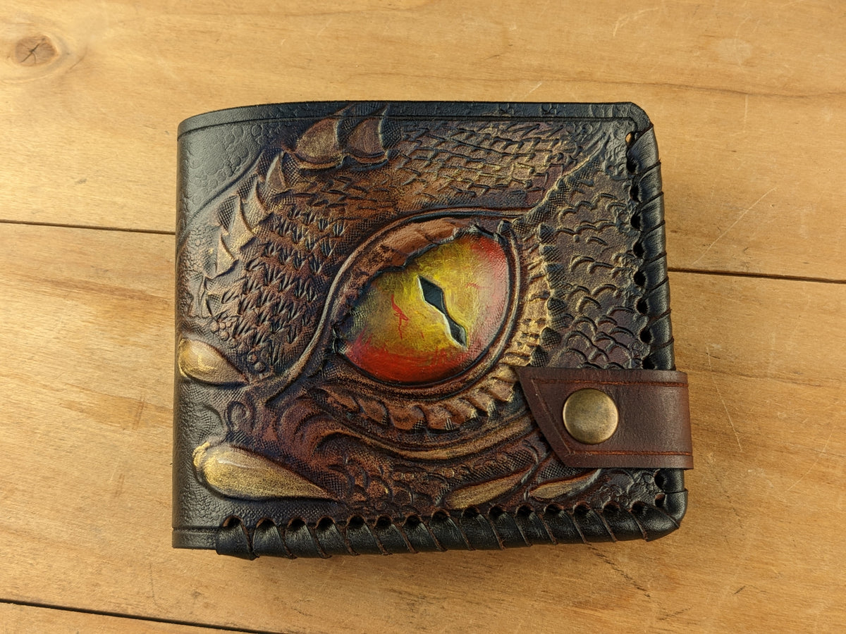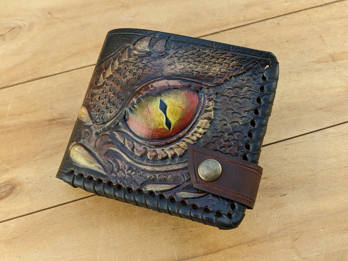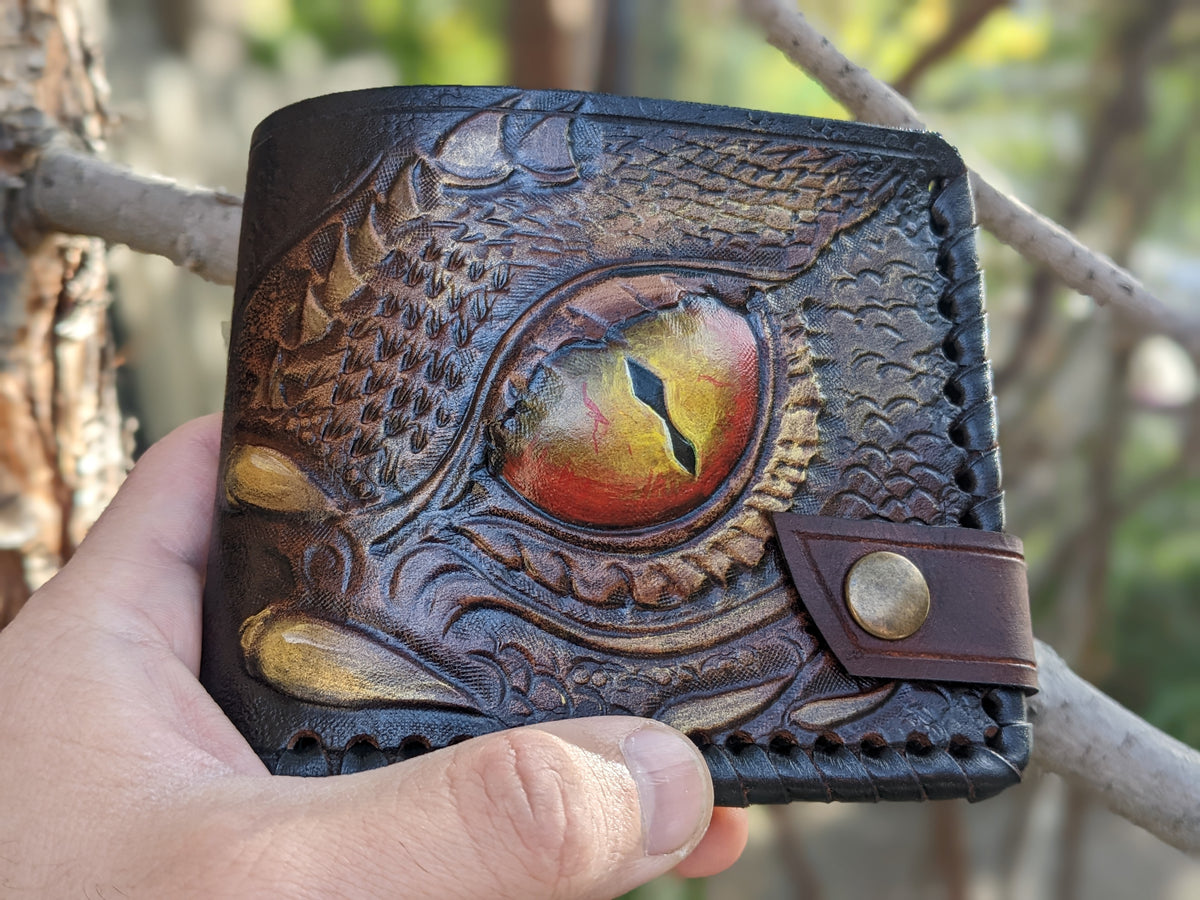 Unleash the mystique of mythical creatures with this Dragon Eye bifold leather wallet, featuring an intricately embossed design of a fiery dragon's gaze inspired by Smaug. Handmade with exceptional craftsmanship, this wallet boasts flaming dragon details, bold textures, and RFID protection for modern security. Perfect for bikers, fantasy lovers, or as a unique Valentine's Day or Chinese-inspired gift, it’s a stunning accessory for him.