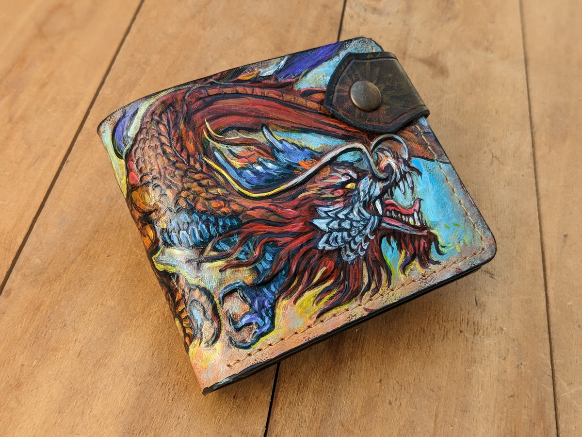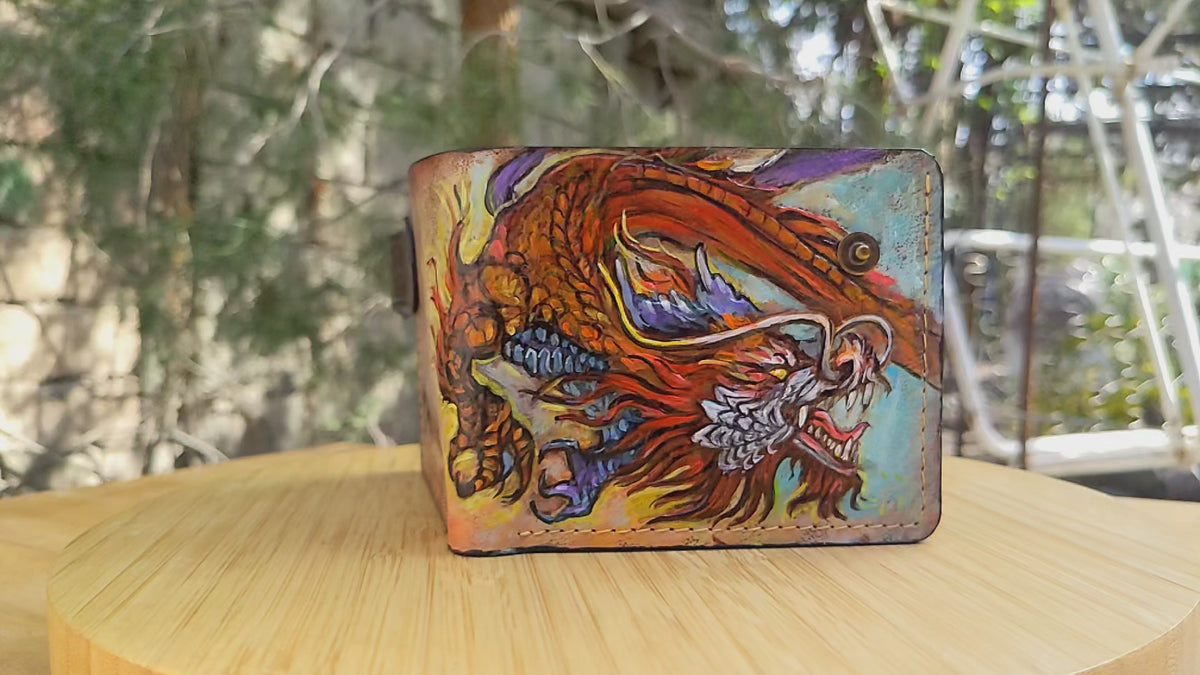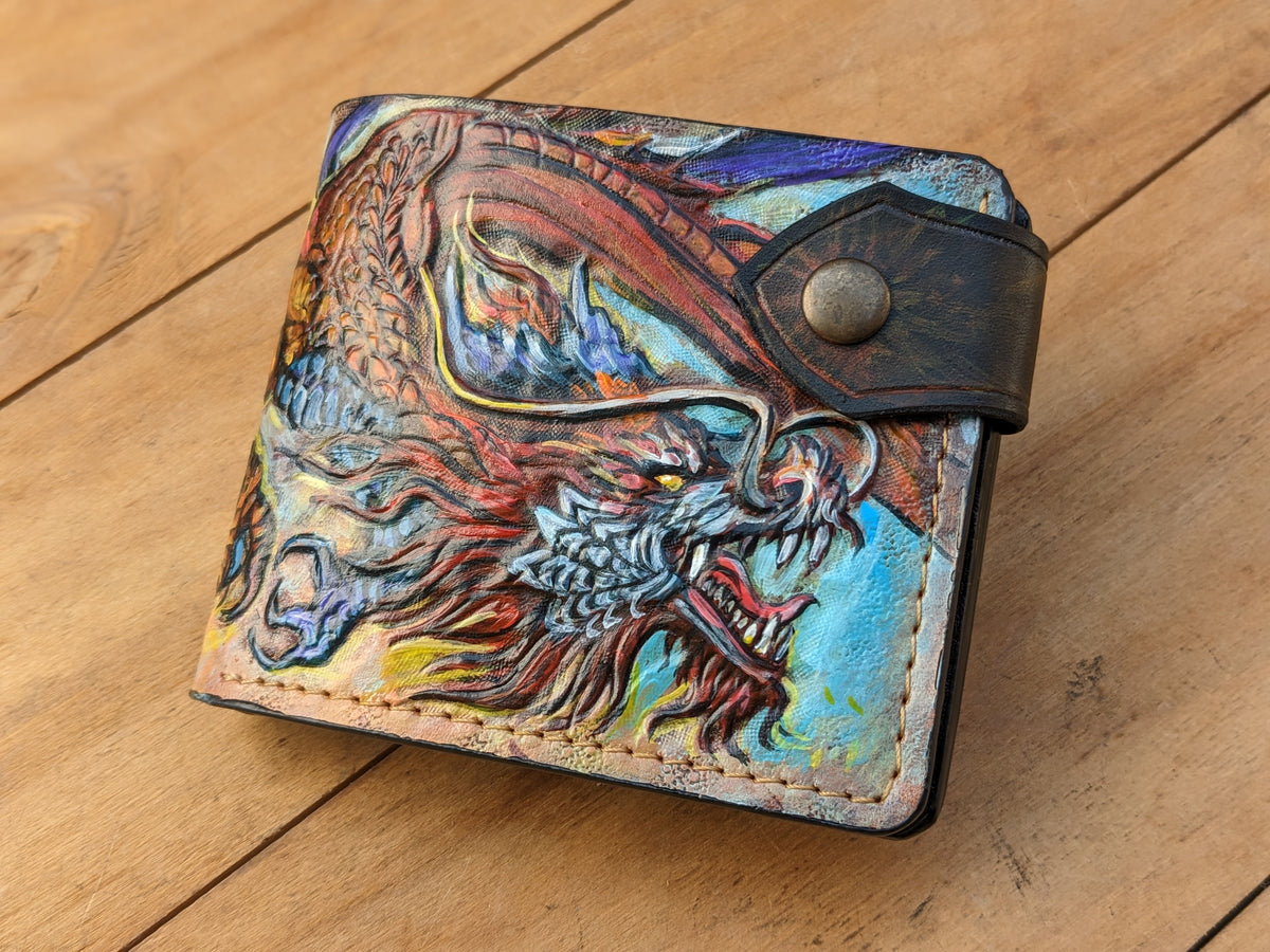 Celebrate the majesty of Chinese mythology with this handmade bifold leather wallet, featuring an embossed and painted design of a fiery Chinese dragon in flight, inspired by Smaug. This wallet blends intricate craftsmanship with RFID protection for modern convenience. Perfect for bikers, fantasy enthusiasts, or as a thoughtful Valentine’s Day or Chinese-themed gift for him, it’s a stunning tribute to the legendary flaming dragon.