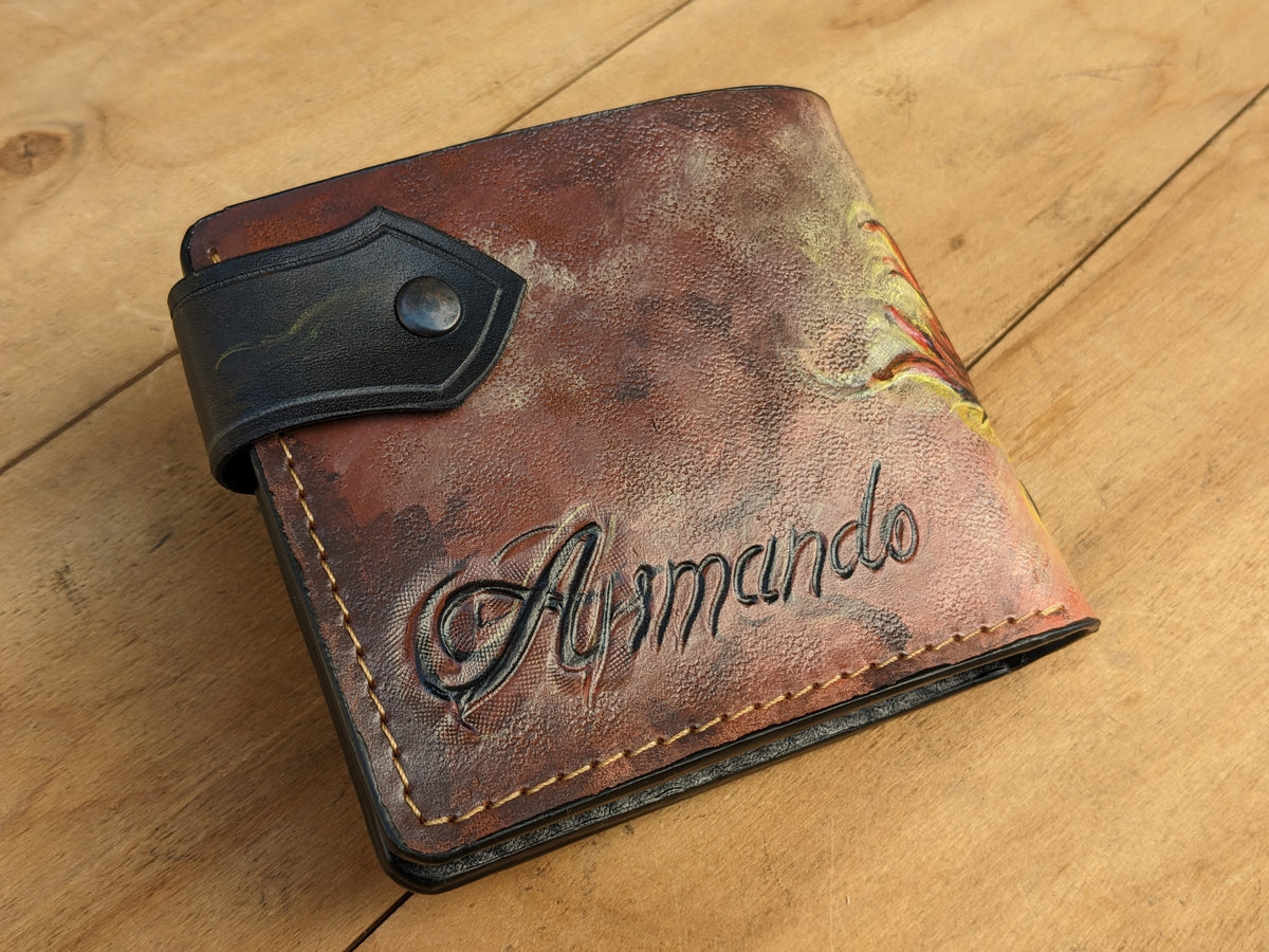 Our exquisite handmade Genuine leather wallet, crafted from high-quality Full Grain Vegetable Tanned Leather. This unique wallet features stunning hand-tooled and hand-painted designs, making it a true work of art.