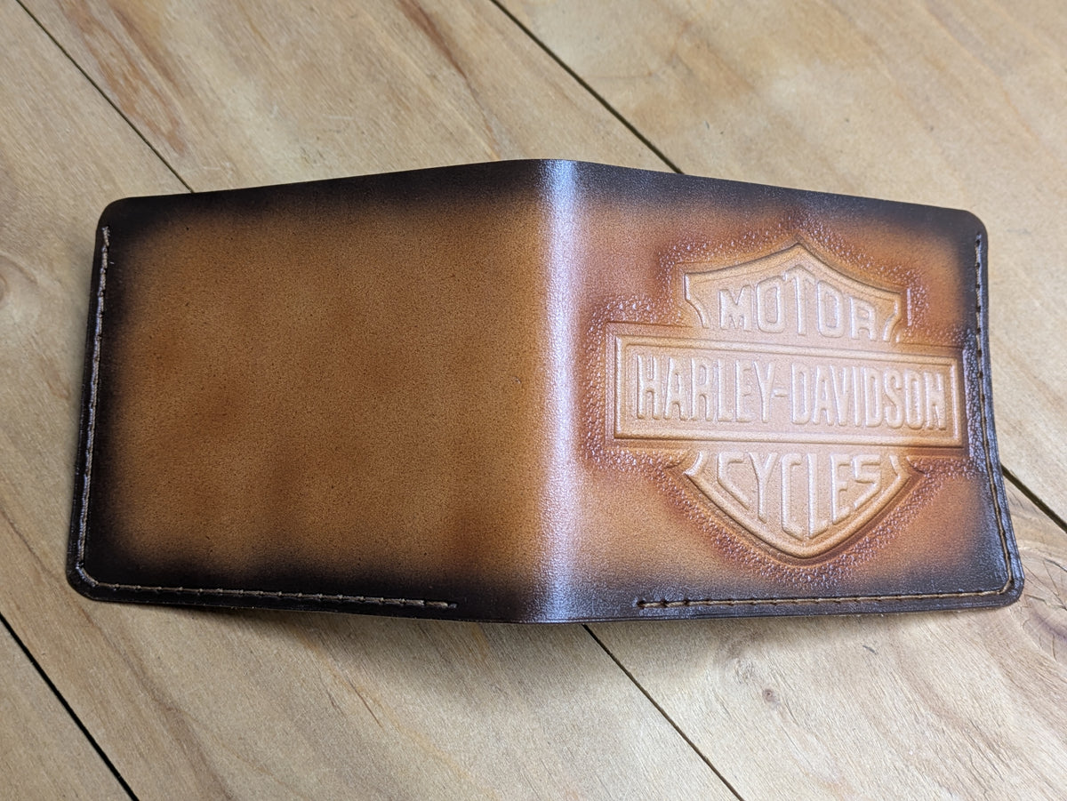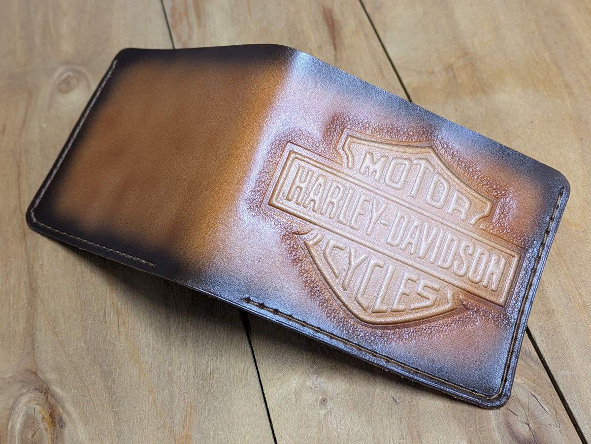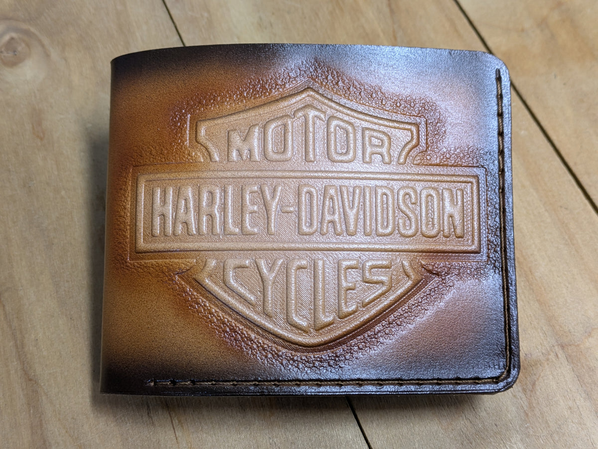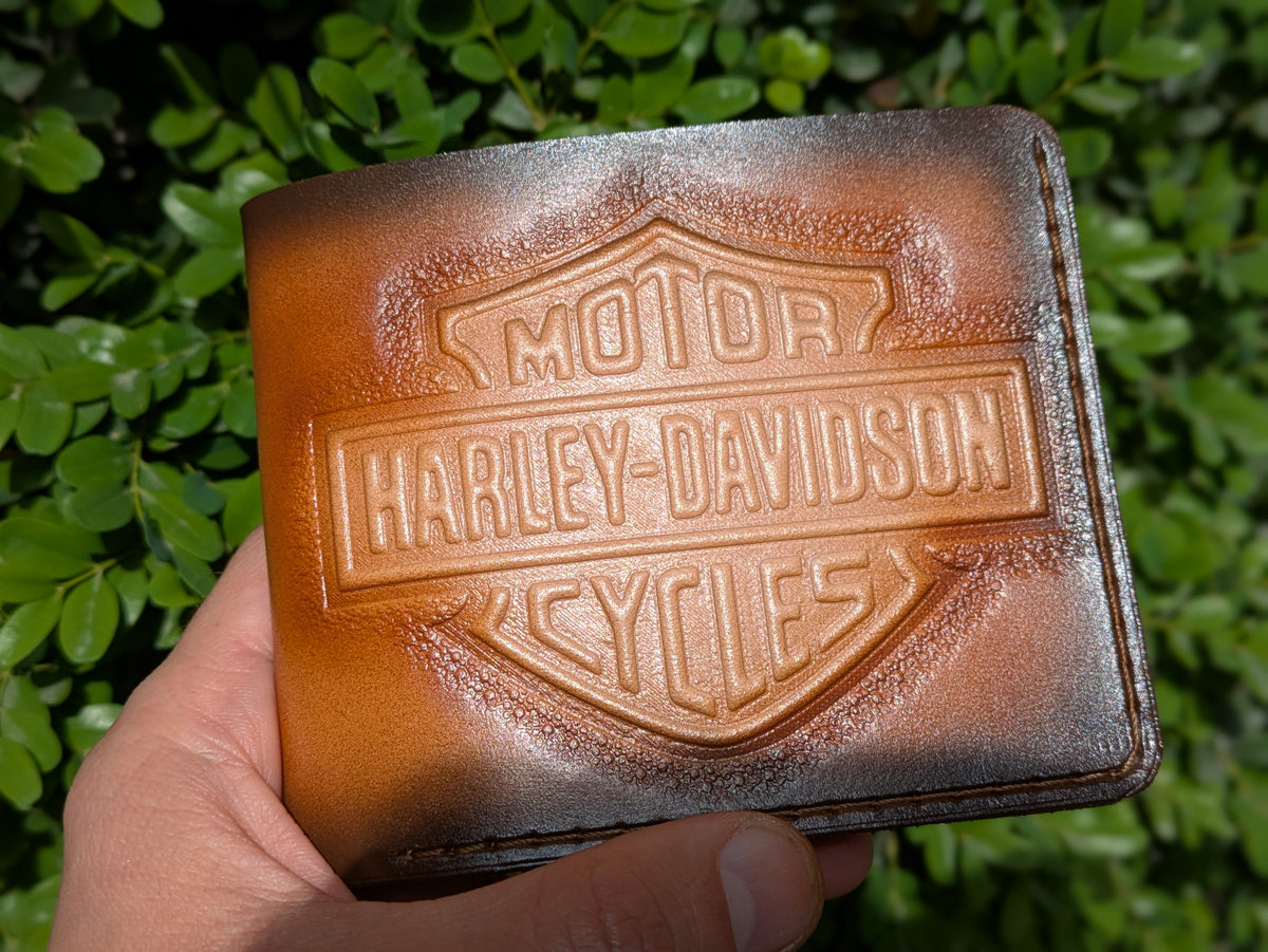 Ride in style with this handmade Harley Davidson-inspired bifold leather wallet. Featuring a detailed motorcycle and biker design, it's crafted from genuine leather for durability and rugged appeal. Perfect for Harley riders, motorcycle enthusiasts, and lovers of classic American freedom. This wallet offers multiple compartments for cards and cash, combining functionality with bold biker spirit. A must-have gift for anyone who lives to ride.
