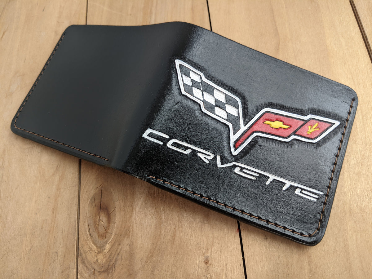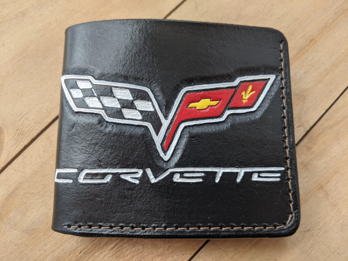 Celebrate the legacy of Chevrolet Corvette with this handmade embossed bifold leather wallet. Featuring the iconic Corvette crossed flag logo, this premium leather wallet is crafted from high-quality materials and offers RFID protection for security. A perfect gift for Corvette enthusiasts, sports car lovers, and Chevy fans. Whether it's a C2, C6, or C8 fan, this wallet makes an excellent Corvette gift for him on birthdays, Valentine's Day, or any special occasion.