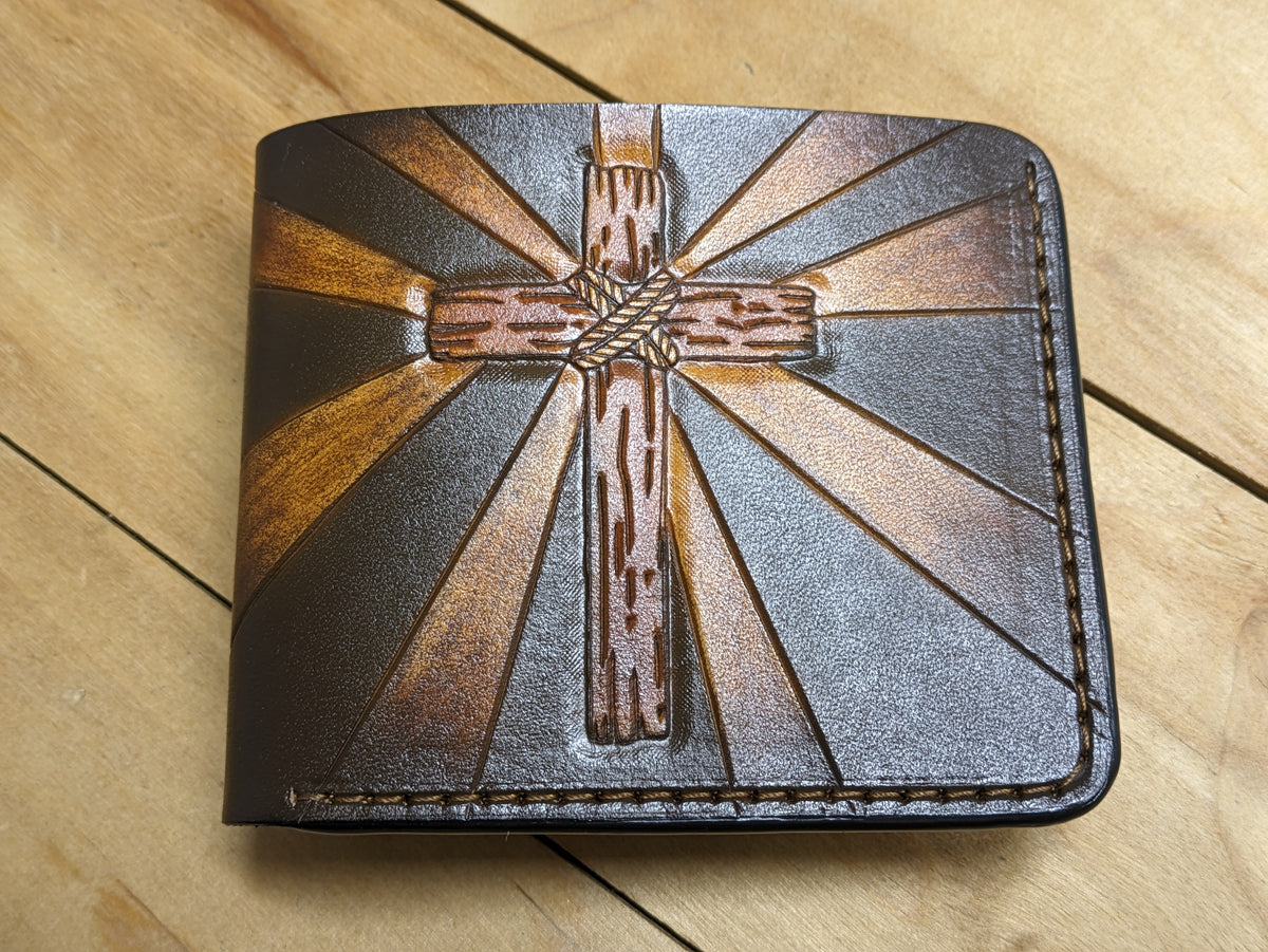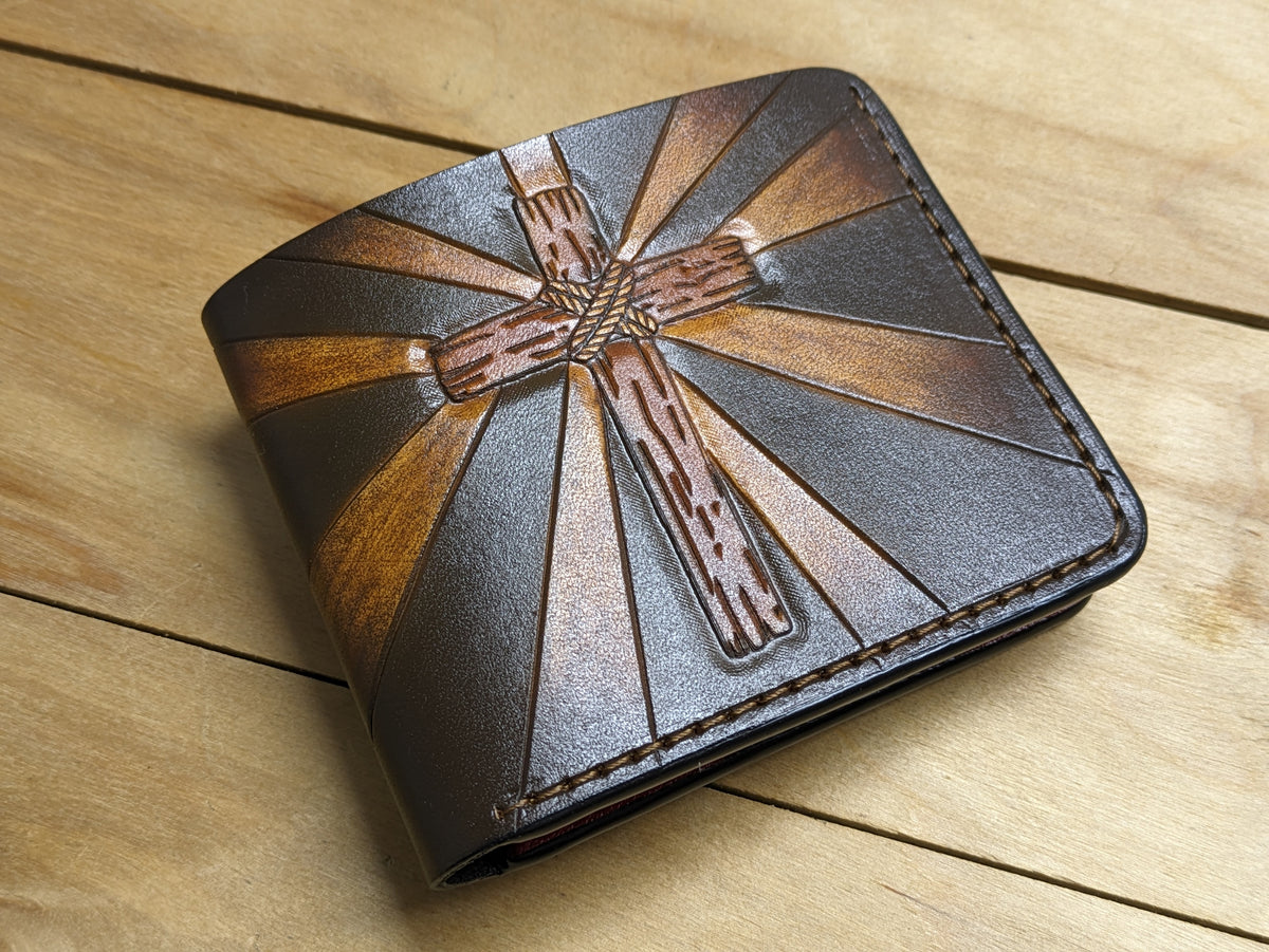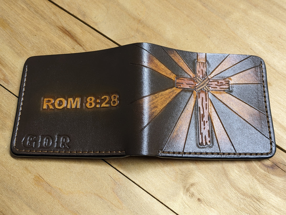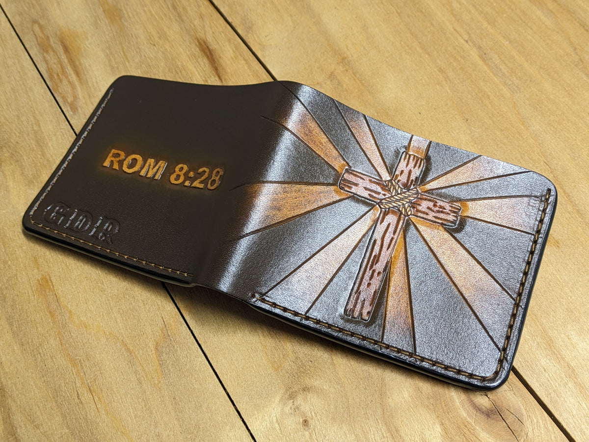 M1G4, Romans 8:28, Wooden Christian Cross Leather Wallet