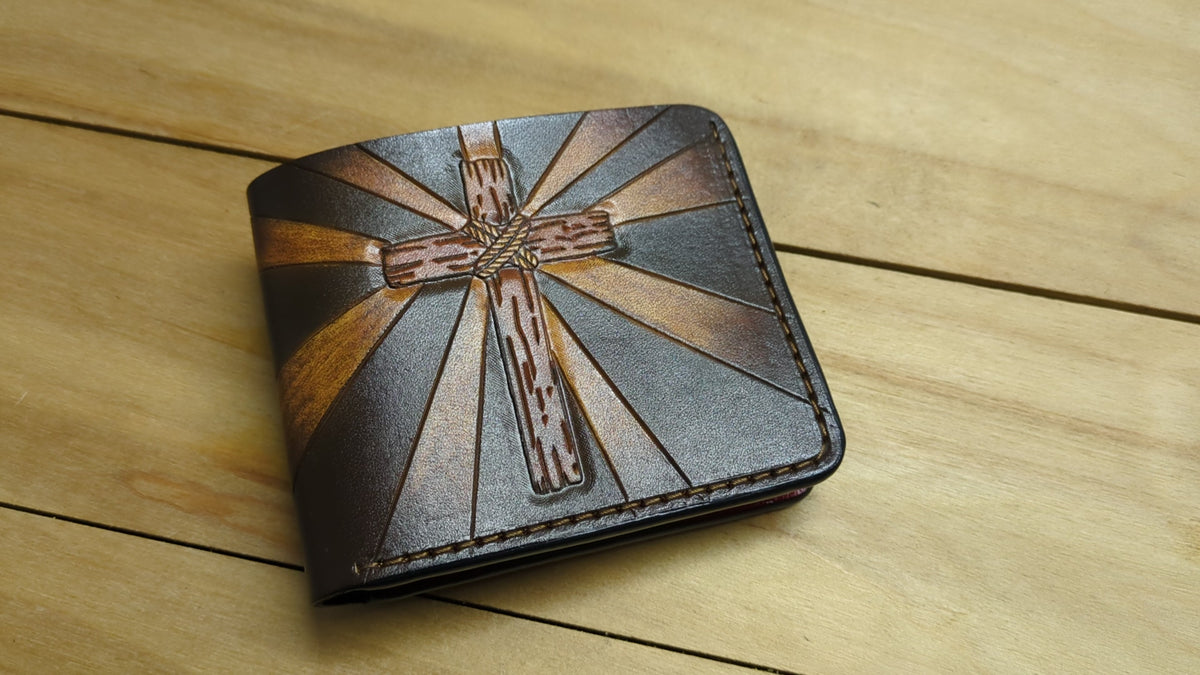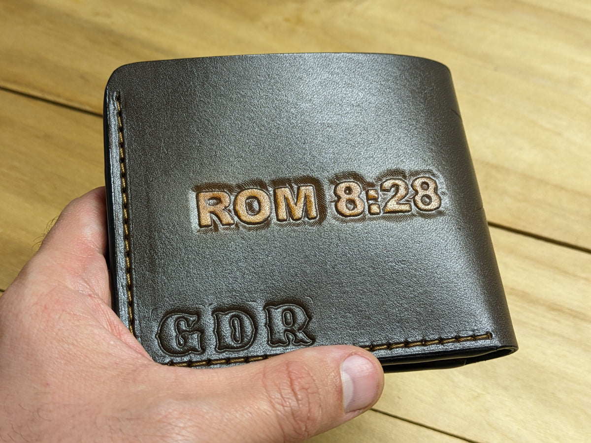 Carry your faith with you wherever you go with this handmade leather bifold wallet, featuring an embossed Christian cross and the inspiring Romans 8:28 verse. Crafted from high-quality full-grain leather, this wallet offers durability, elegance, and RFID protection for added security. The embossed wooden cross design enhances its spiritual significance, making it a meaningful Christian gift for men. Perfect for bikers, believers, and those seeking a faith-inspired accessory, this wallet is an ideal gift for Christmas, birthdays, or any special occasion.