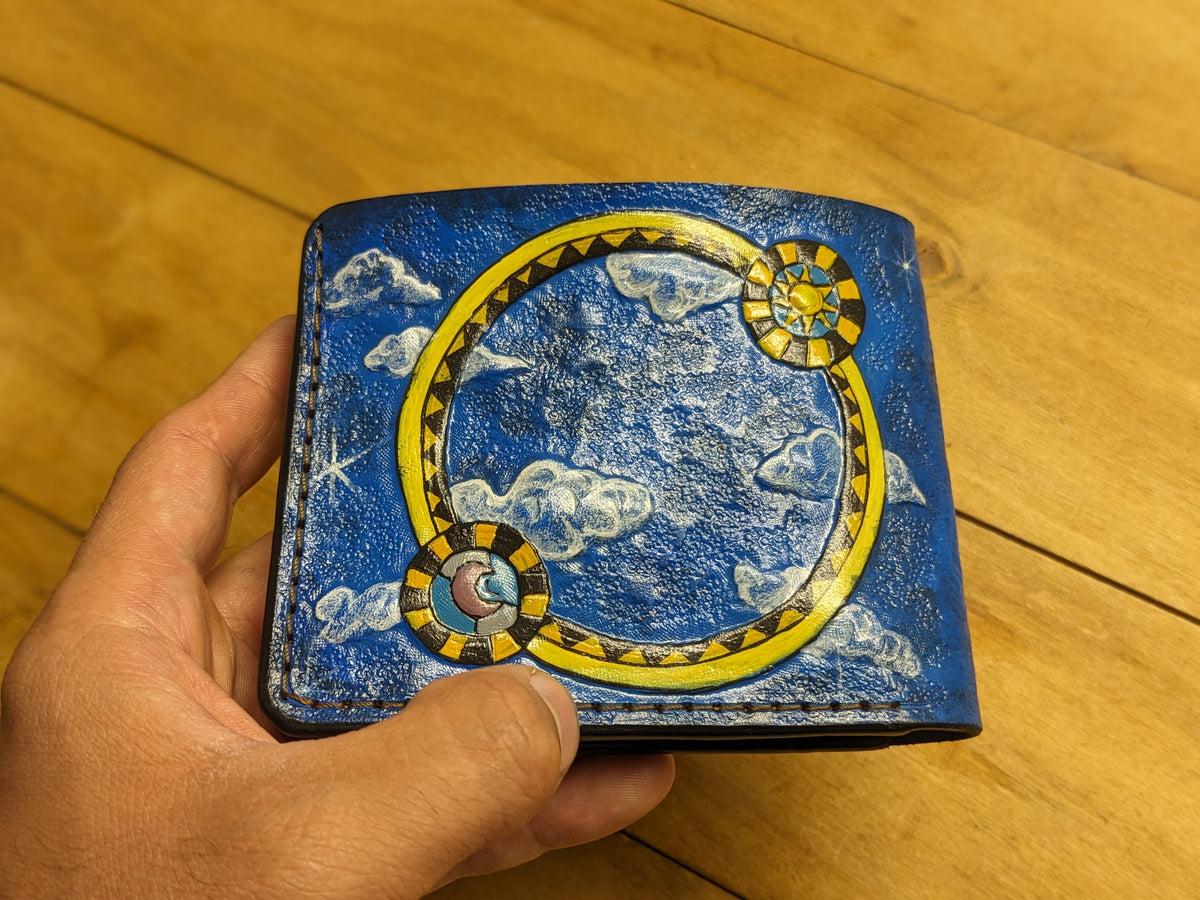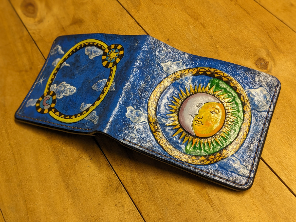 Our exquisite handmade Genuine leather wallet, crafted from high-quality Full Grain Vegetable Tanned Leather. This unique wallet features stunning hand-tooled and hand-painted designs, making it a true work of art.