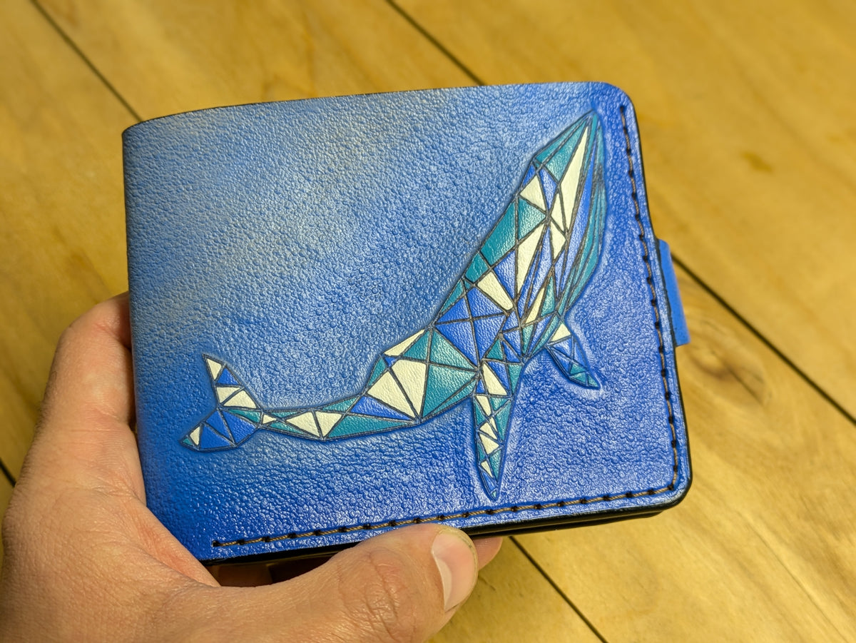 This handmade leather bifold wallet features a stunning embossed design of a polygonal blue whale, orca, and fish, making it a perfect gift for ocean and whale lovers. Crafted from premium leather, it offers RFID protection for security and durability. Ideal for marine enthusiasts, whale fans, and those who appreciate unique, nature-inspired designs. A great gift for birthdays, Father's Day, or any special occasion.