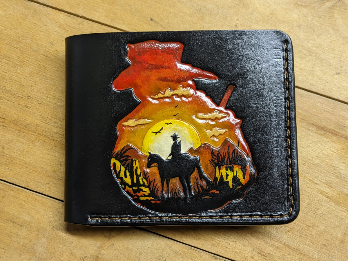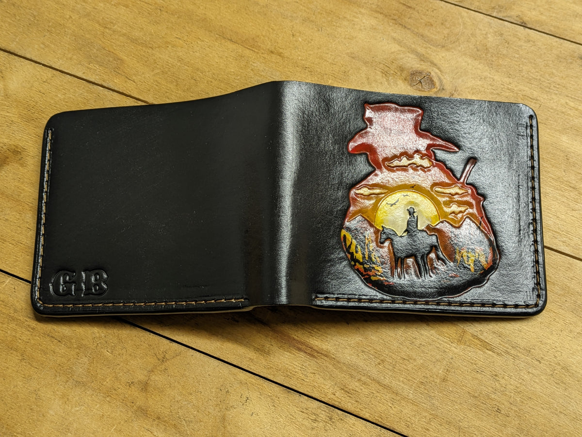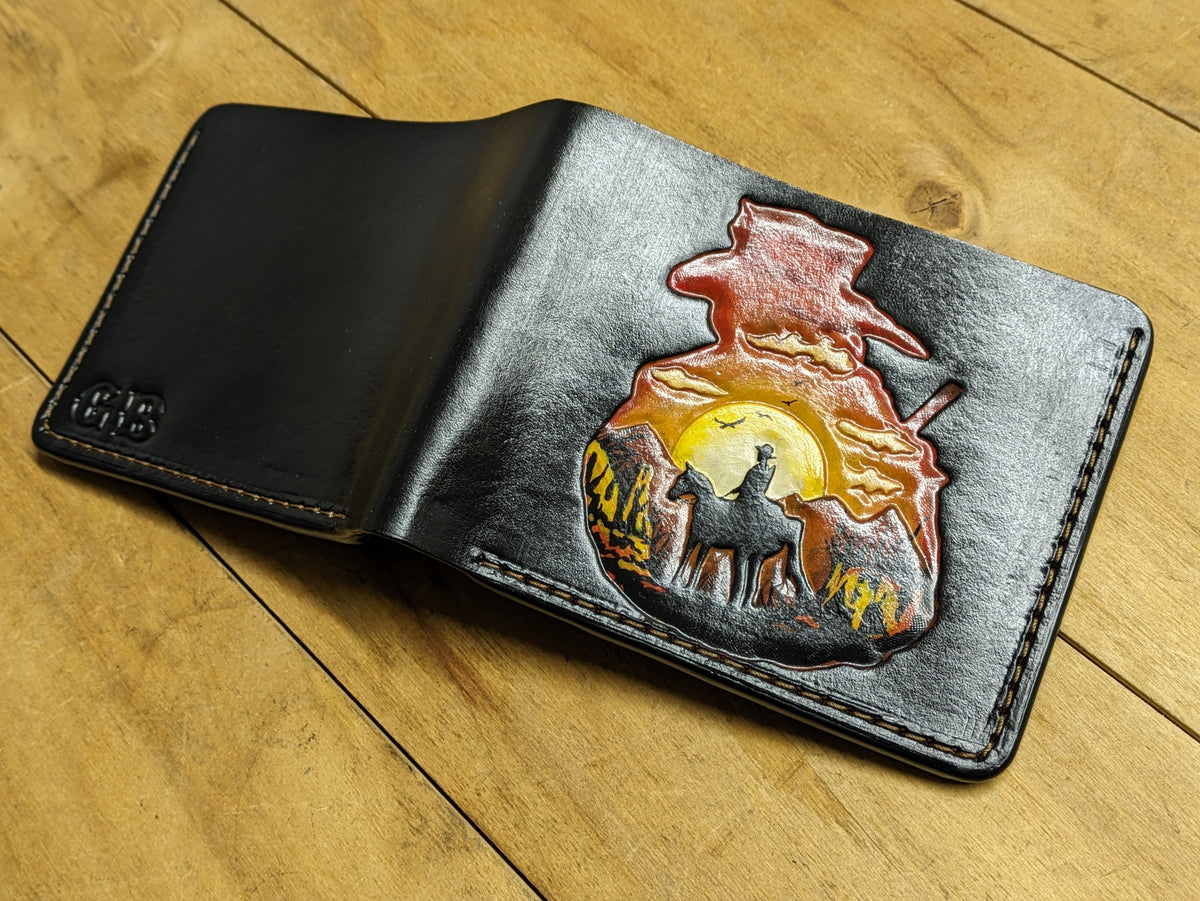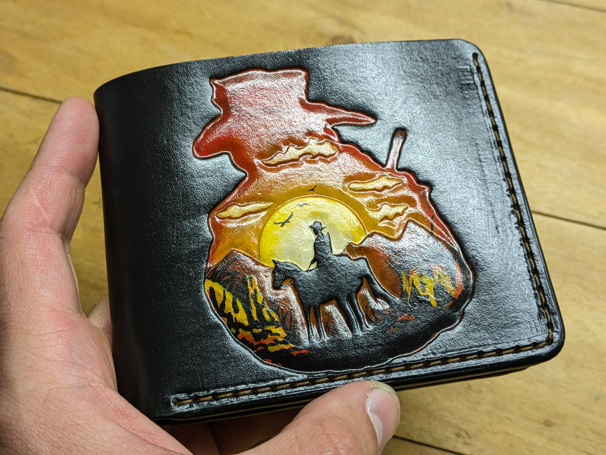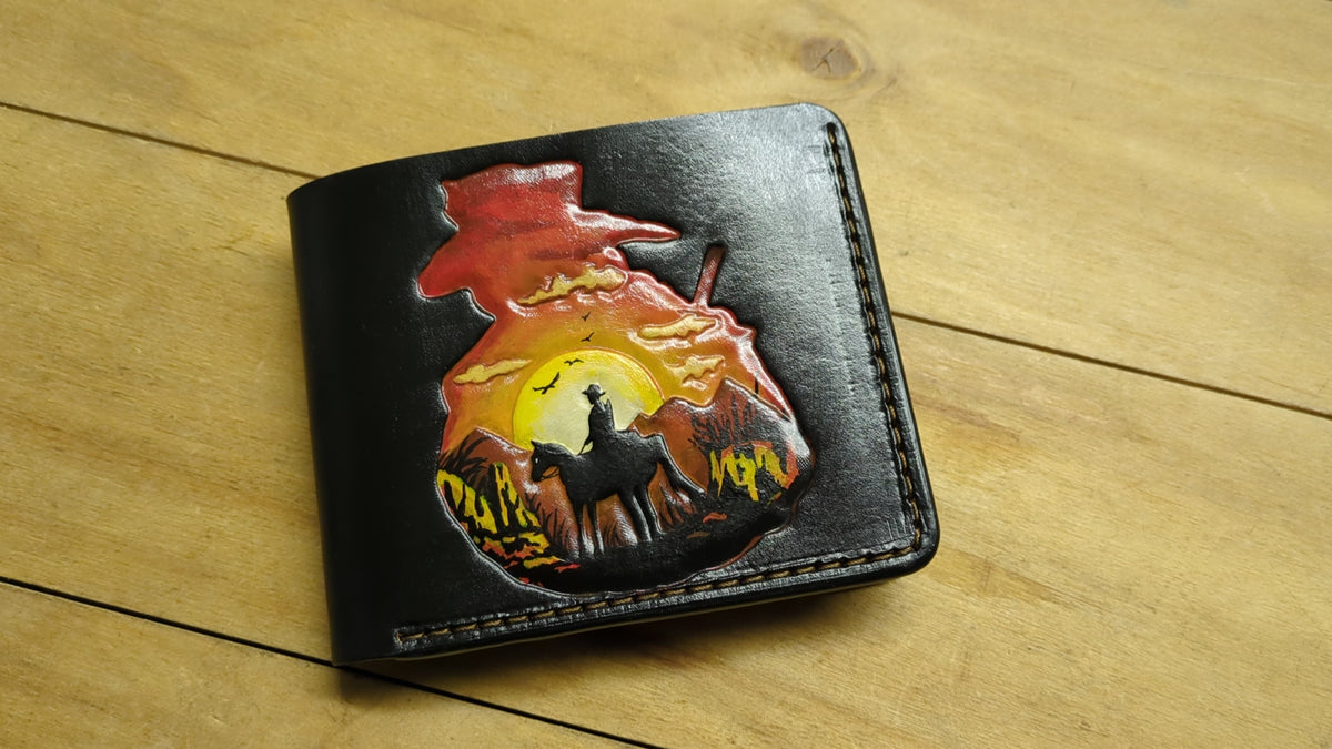 Our exquisite handmade Genuine leather wallet, crafted from high-quality Full Grain Vegetable Tanned Leather. This unique wallet features stunning hand-tooled and hand-painted designs, making it a true work of art.