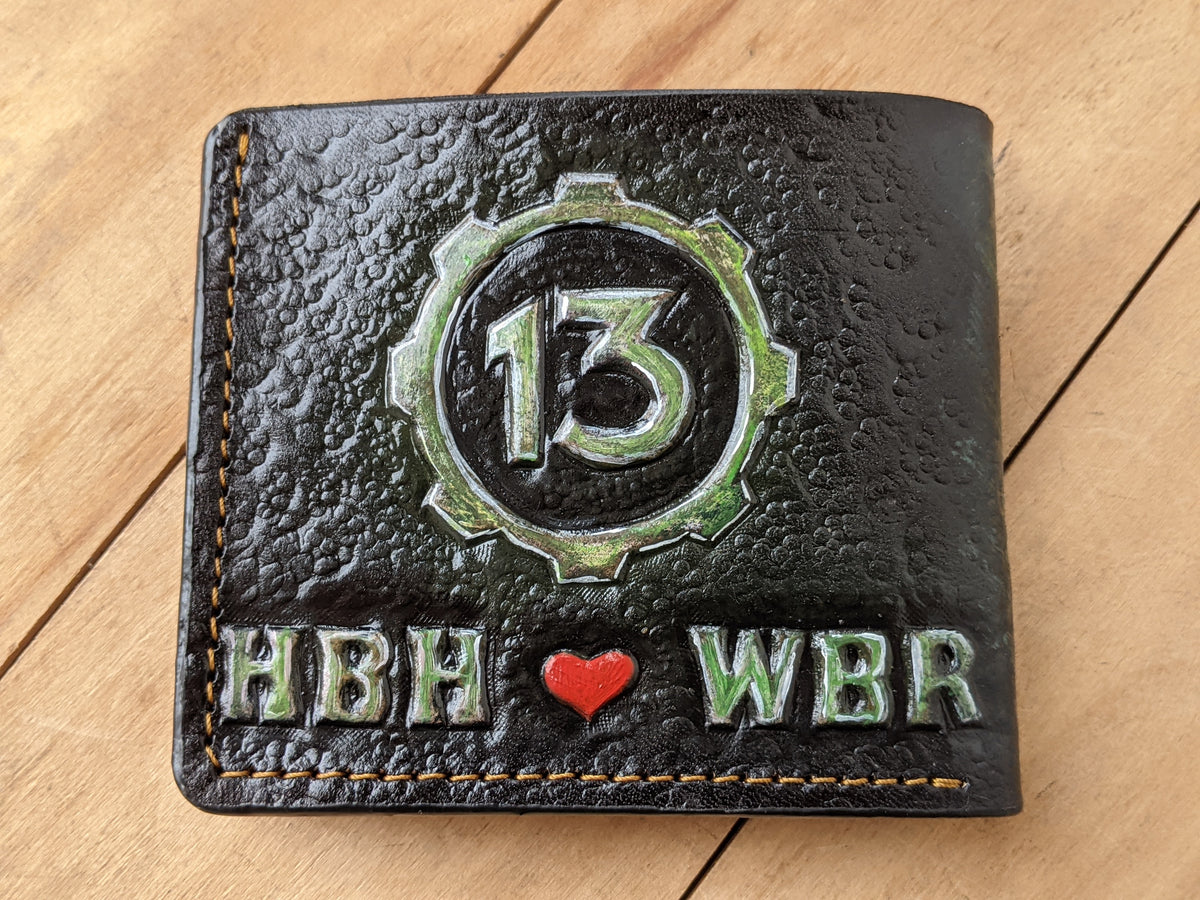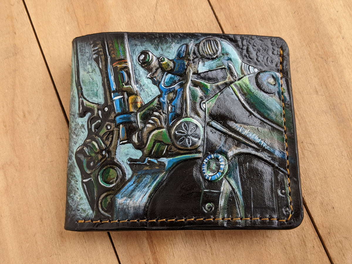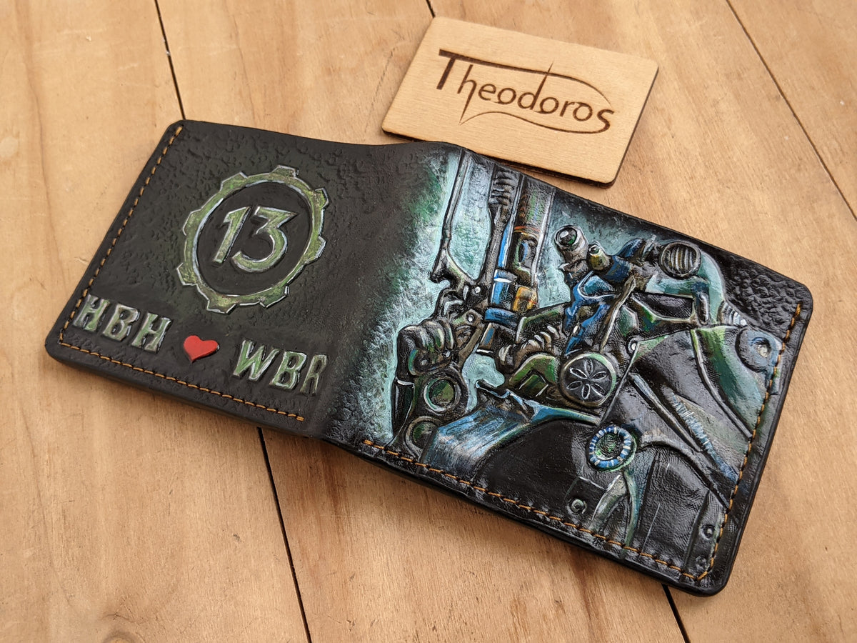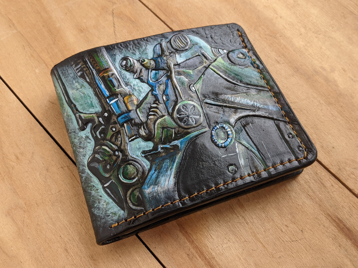 This handcrafted leather bifold wallet features an embossed design inspired by Fallout’s T-60 Power Armor, Vault 13, and the Brotherhood of Steel. Made from premium leather with RFID protection, it blends style and security for every Vault Dweller. Whether you're a fan of Fallout Shelter, Fallout 76, or the post-apocalyptic wasteland, this wallet makes the perfect gift for gamers and collectors. A must-have accessory for any Fallout fan!
