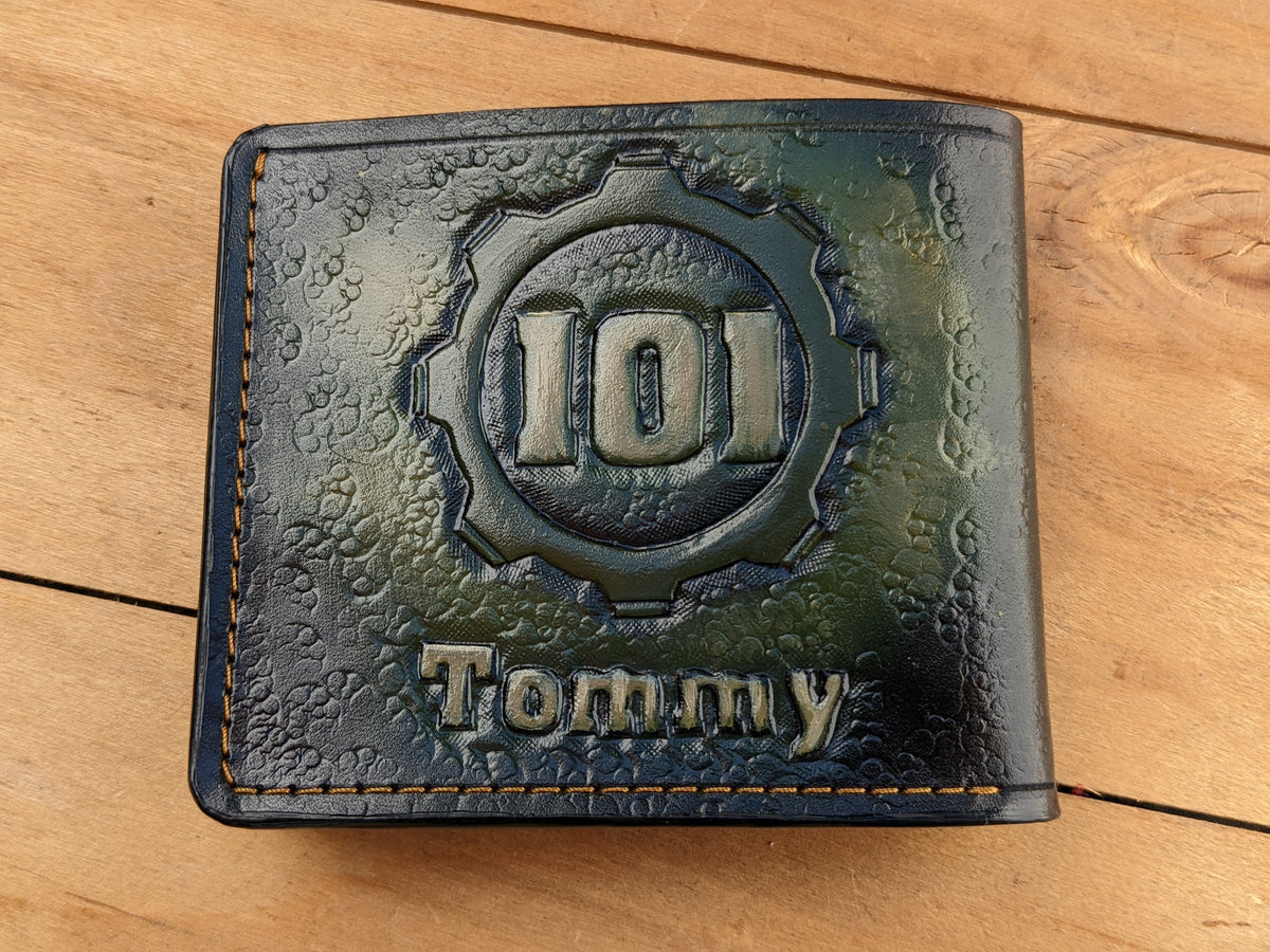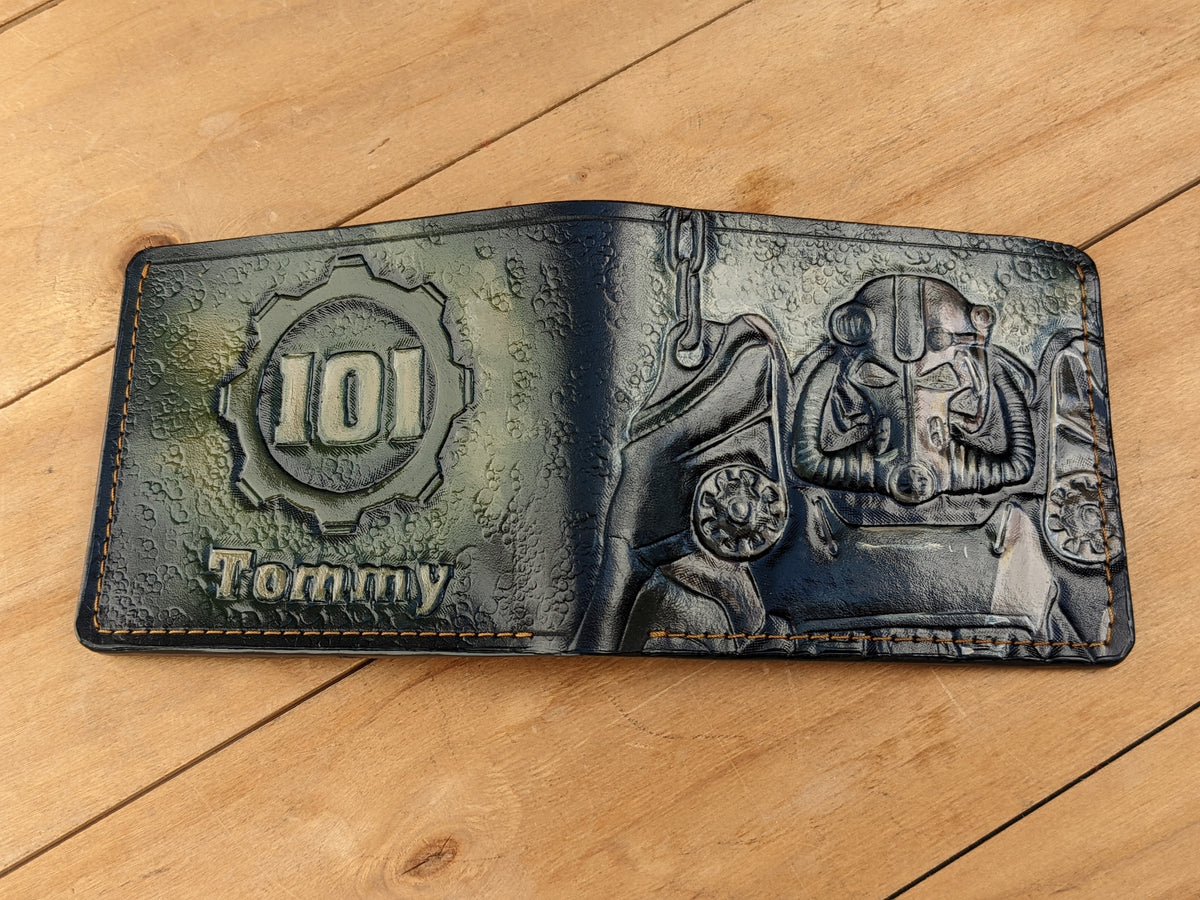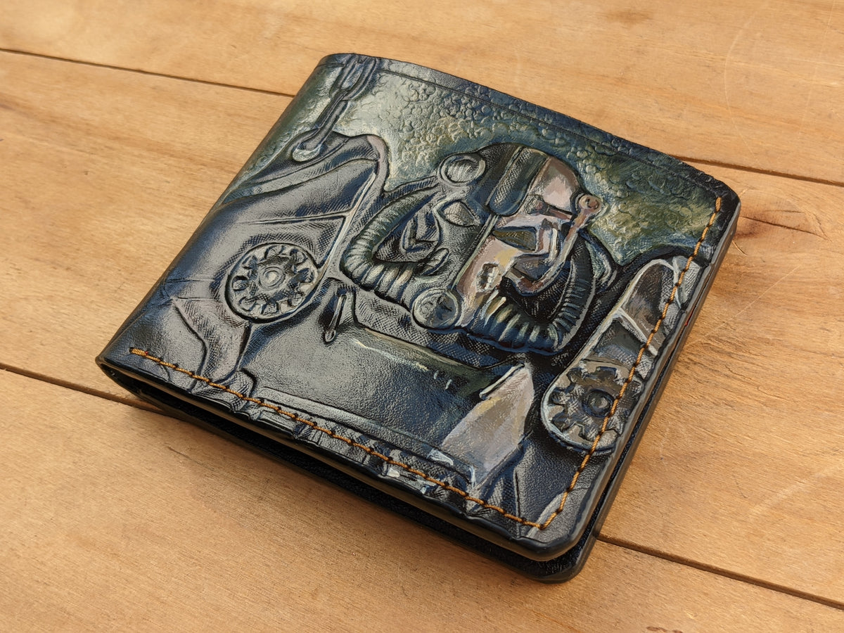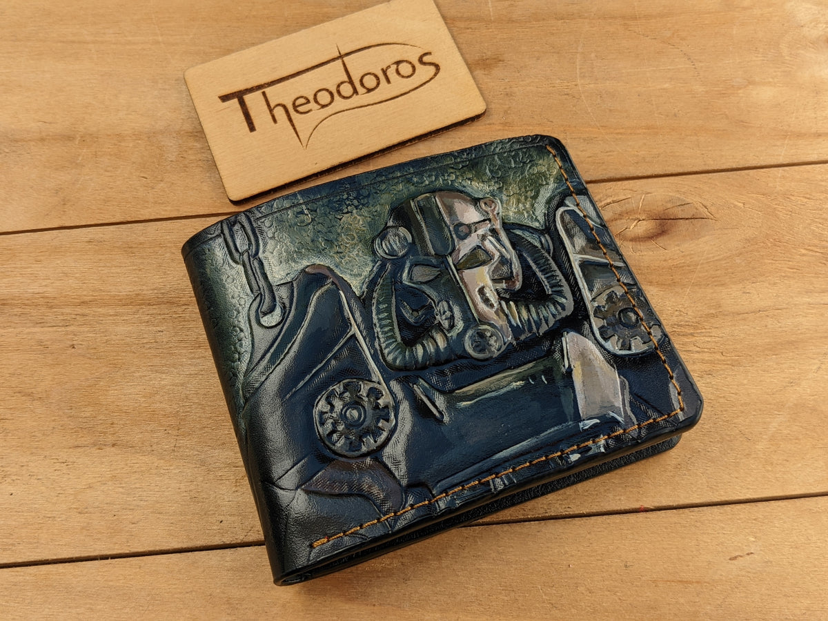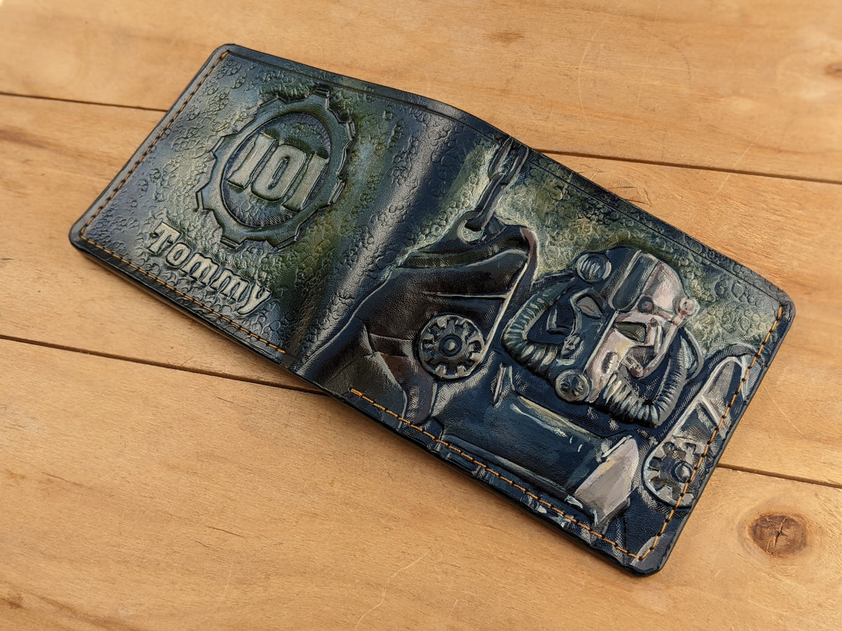 This handcrafted leather bifold wallet features an embossed design inspired by Fallout’s T-60 Power Armor, Vault 101, and the Brotherhood of Steel. Made from premium leather with RFID protection, it blends style and security for every Vault Dweller. Whether you're a fan of Fallout Shelter, Fallout 76, or the post-apocalyptic wasteland, this wallet makes the perfect gift for gamers and collectors. A must-have accessory for any Fallout fan!