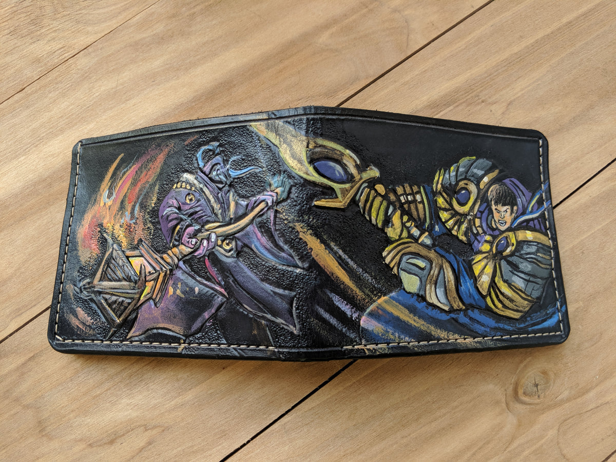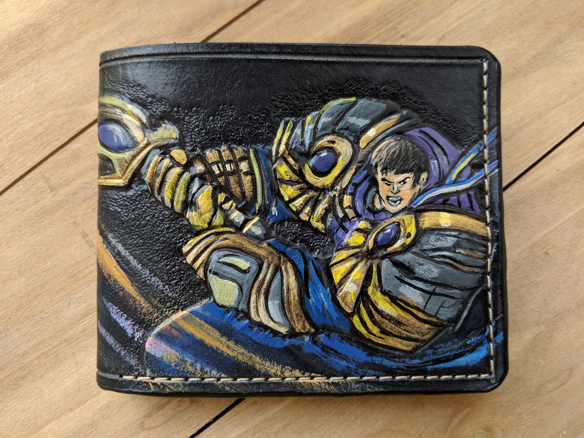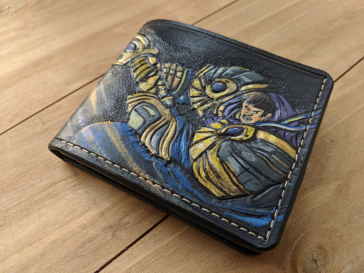 Unleash the power of Jax, the Grandmaster at Arms, and Garen, The Might of Demacia, with this handcrafted leather bifold wallet. Featuring embossed designs inspired by these iconic League of Legends champions, this wallet is made from premium vegetable-tanned leather with RFID protection for security and durability. A must-have for League of Legends fans, gamers, and those who appreciate fine craftsmanship.