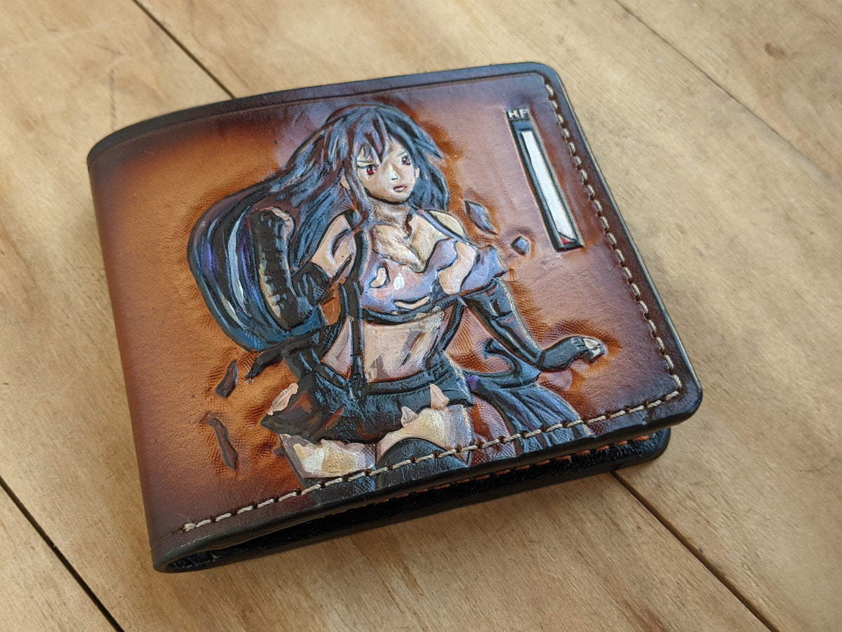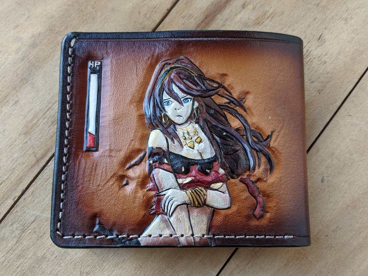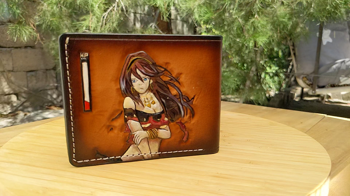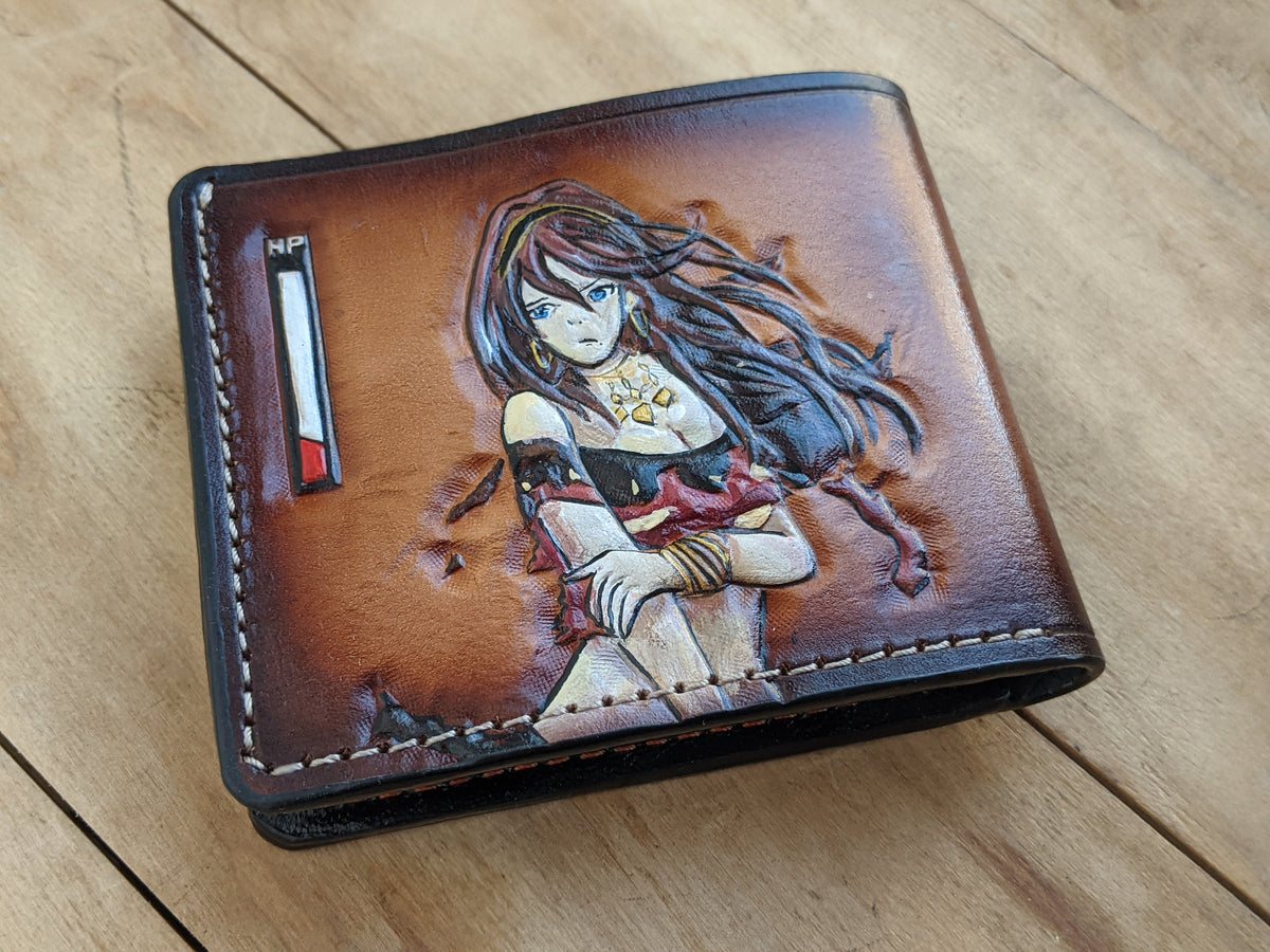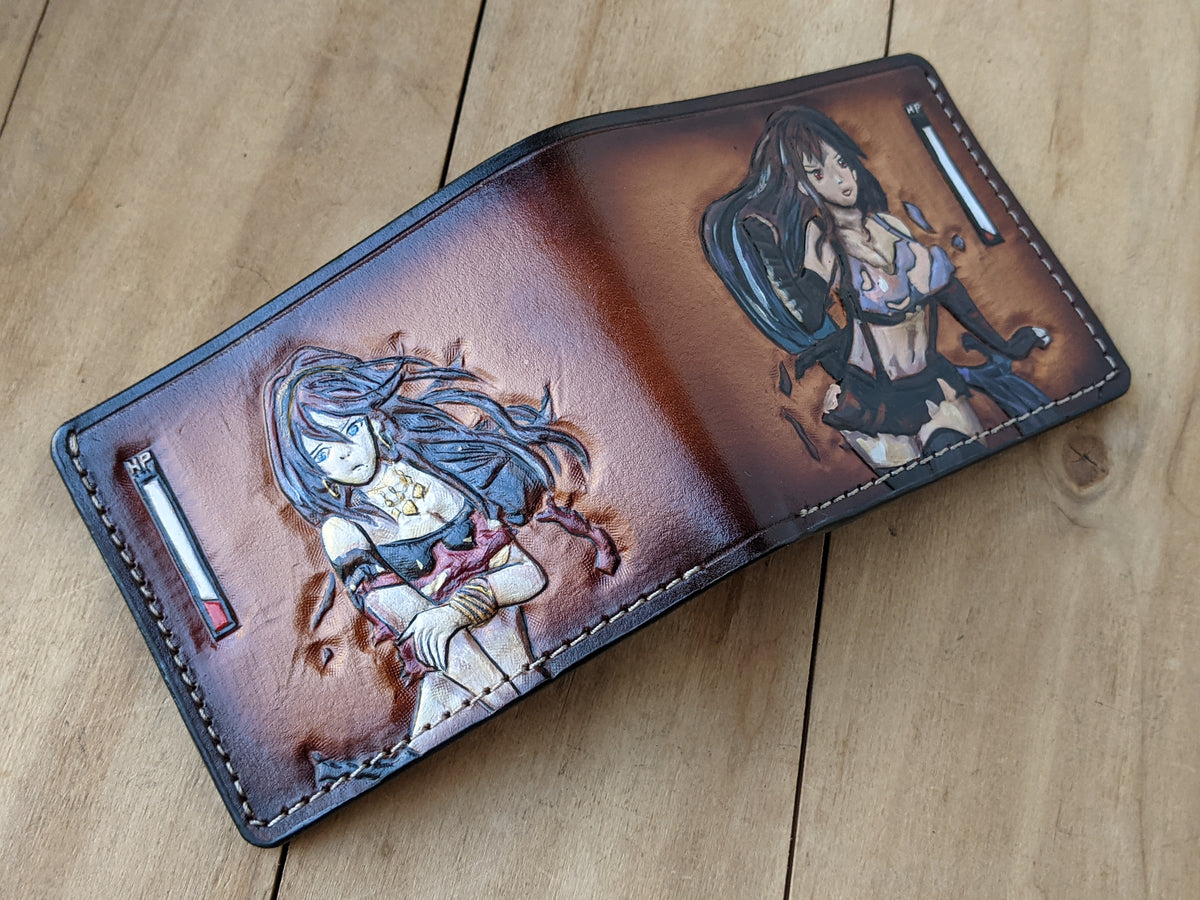 Celebrate the legendary heroines of Final Fantasy with this handcrafted leather bifold wallet, featuring an embossed design of Primrose Azelhart and Tifa Lockhart. Made from premium vegetable-tanned leather, this RFID-protected wallet is built to last. Whether you're a fan of Final Fantasy VII, Octopath Traveler, or the iconic characters of the series, this wallet is the perfect blend of craftsmanship and fandom. A unique and stylish gift for gamers, collectors, and Final Fantasy fans!
