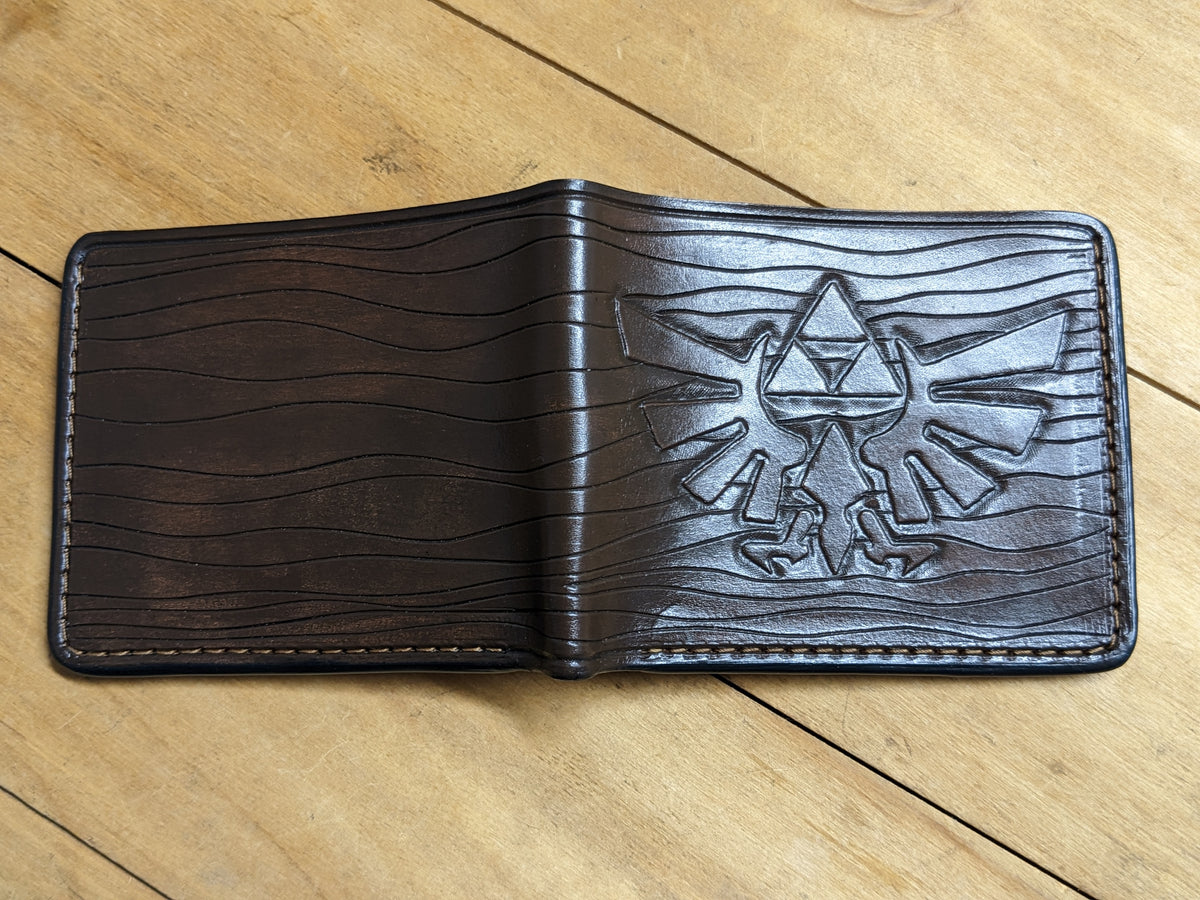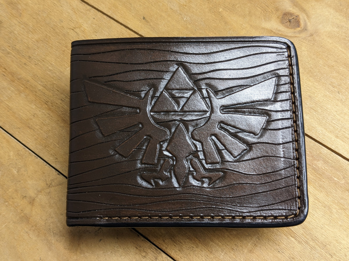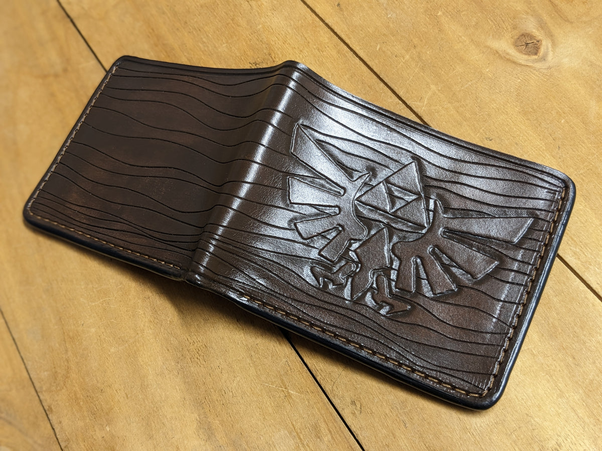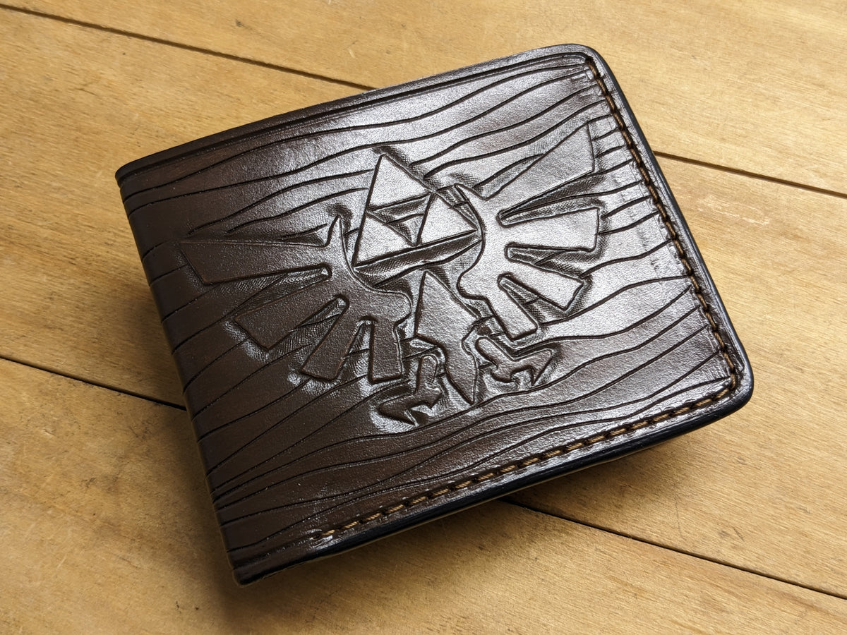 This handcrafted leather bifold wallet features an embossed Legend of Zelda design, showcasing the iconic Triforce, Hylian Crest, and elements from Hyrule. Made from high-quality leather with RFID protection, it’s perfect for fans of Link, Princess Zelda, Majora’s Mask, and the legendary Hylian Shield. Whether you're an adventurer, gamer, or collector, this wallet is a must-have tribute to the beloved series and an ideal gift for any Zelda fan.