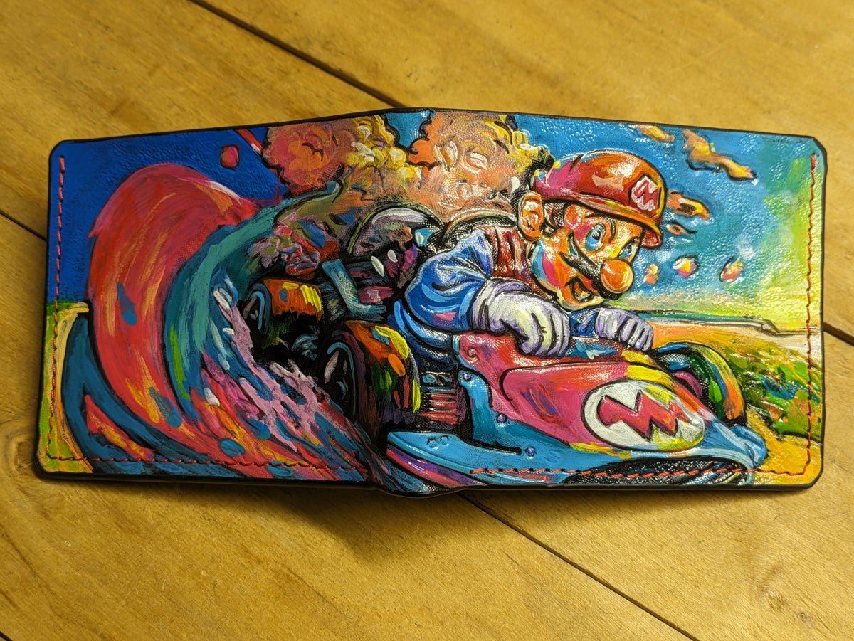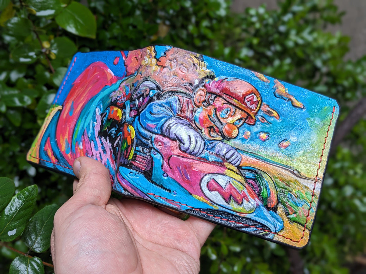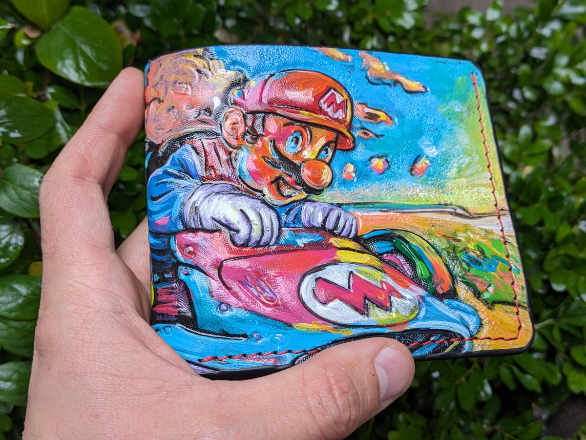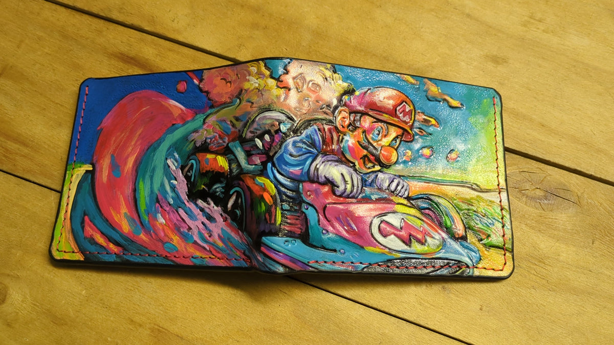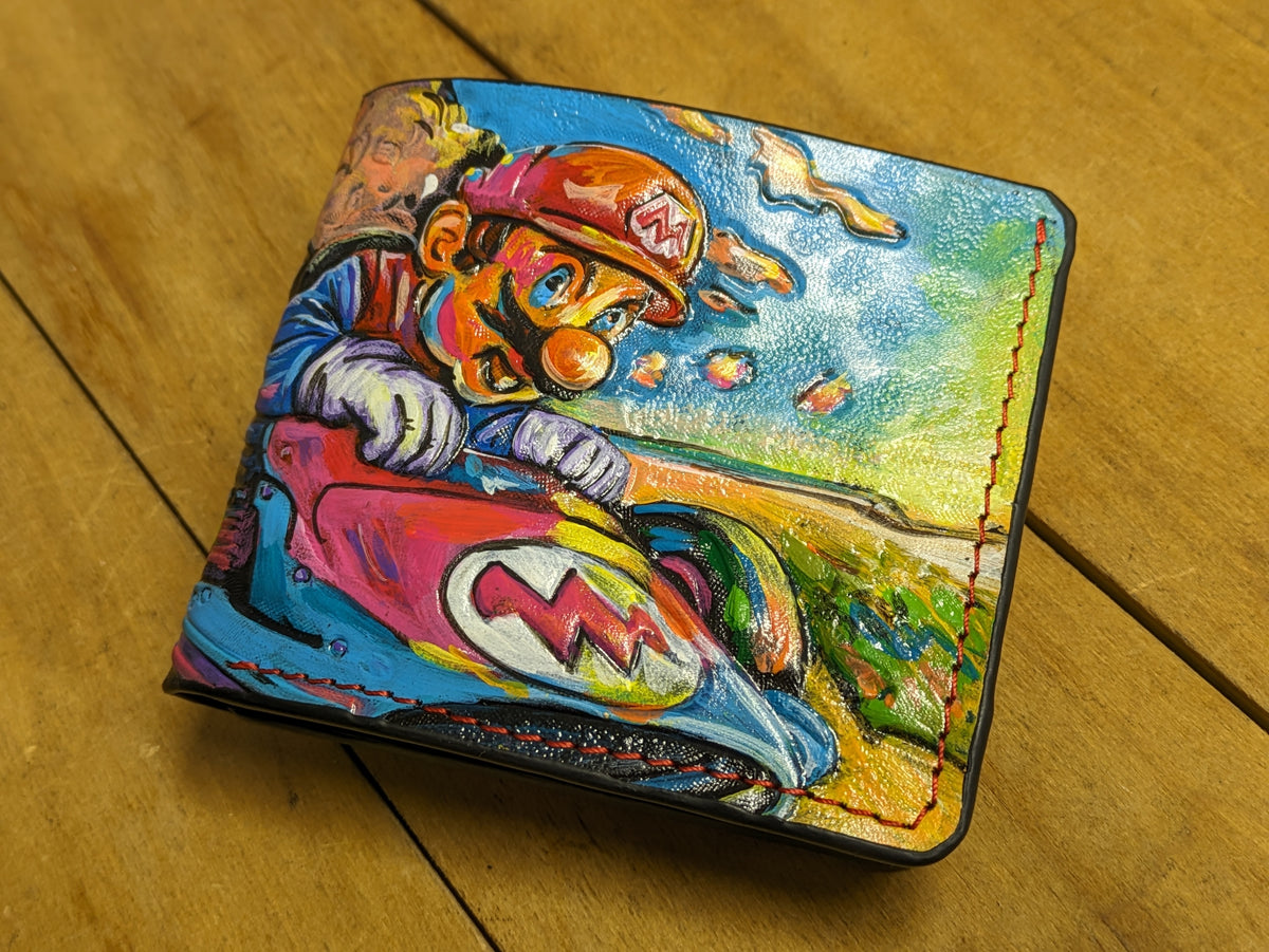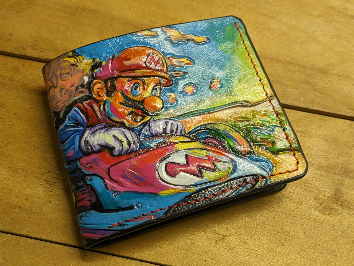 Celebrate the world of Super Mario with this handcrafted 3D genuine leather wallet, featuring a beautifully tooled and hand-painted design of Princess Peach, Bowser, and Mario Kart elements. Made from premium vegetable-tanned leather, this bifold wallet is built for durability and style. Whether you're a devoted Mario fan or looking for the perfect personalized gift, this custom wallet is a must-have. A great choice for gamers, collectors, and those who appreciate artisan craftsmanship.