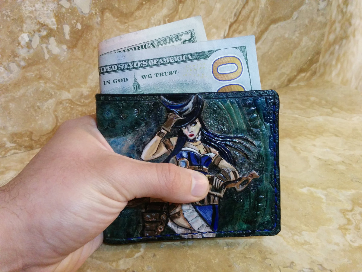 This handcrafted leather bifold wallet features an embossed League of Legends design, inspired by Caitlyn Kiramman, the Sheriff of Piltover. Made from premium leather with RFID protection, this stylish and durable wallet is perfect for LOL players and fans who admire Caitlyn’s sharpshooting skills and Piltover’s law enforcement. Whether you're a dedicated gamer, collector, or looking for the perfect gift, this wallet is an excellent tribute to the League of Legends universe.