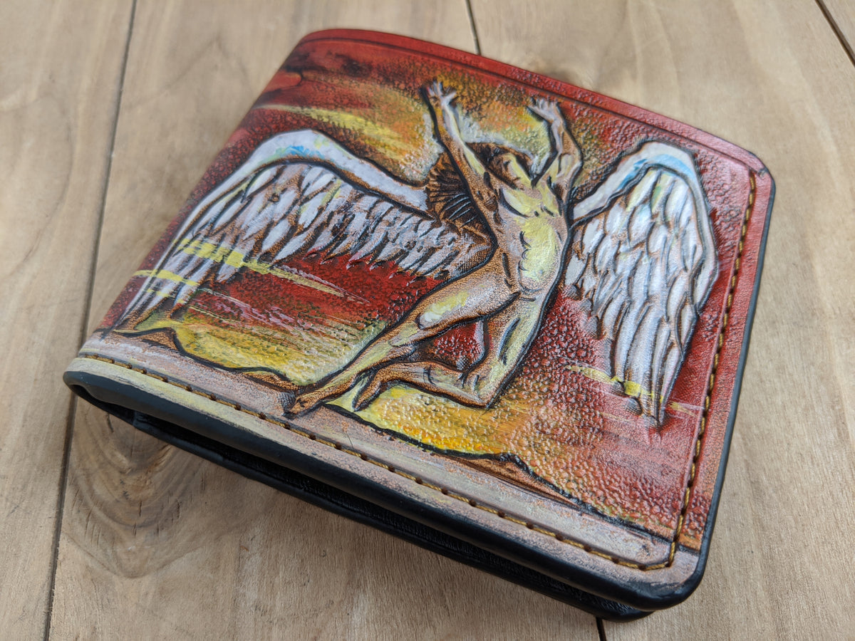 Our exquisite handmade Genuine leather wallet, crafted from high-quality Full Grain Vegetable Tanned Leather. This unique wallet features stunning hand-tooled and hand-painted designs, making it a true work of art.