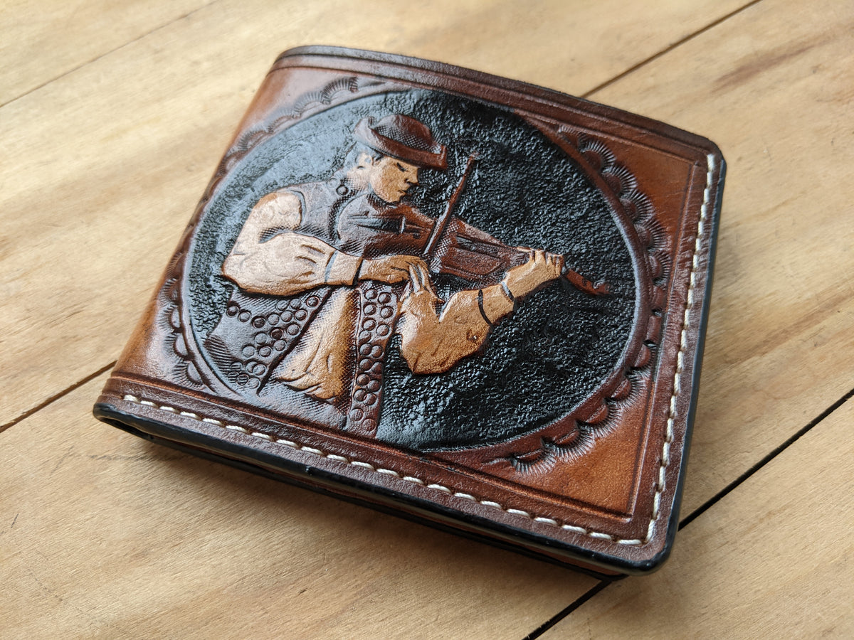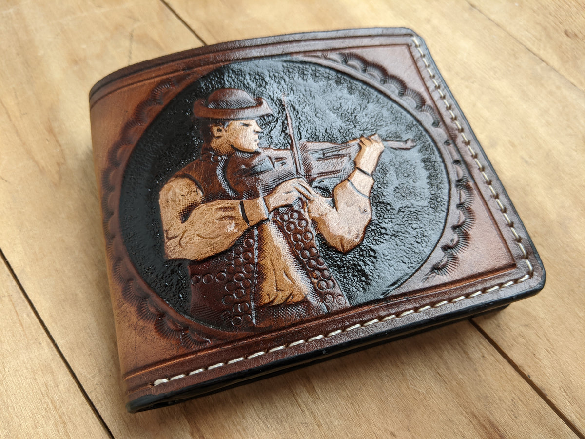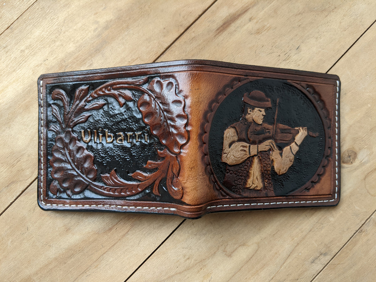 Celebrate the beauty of music with this handcrafted violin-themed leather bifold wallet, featuring a stunning Sheridan-style floral pattern. Made from premium vegetable-tanned leather, this RFID-protected wallet is embossed, hand-tooled, and built to last. A perfect gift for violinists, viola players, and music lovers, this wallet is a unique blend of artistry and craftsmanship. Whether you're looking for a gift for a violin teacher, a music student, or a professional musician, this wallet makes a timeless statement.