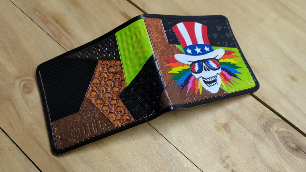 Celebrate your love for the Grateful Dead with this handmade bifold leather wallet. Featuring iconic patchwork designs like Psychedelic Sam with lightning bolt glasses, the US Blues Skeleton, Uncle Sam, and a vibrant American flag, this wallet is crafted for fans of the legendary band. Durable, stylish, and uniquely artistic, it’s perfect for everyday use or as a thoughtful gift for music lovers. Made from genuine leather with impeccable craftsmanship, this wallet combines functionality with timeless Grateful Dead imagery.