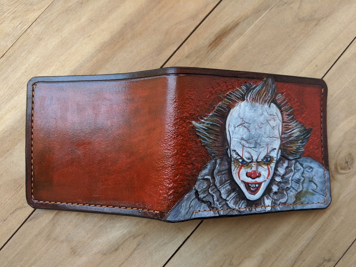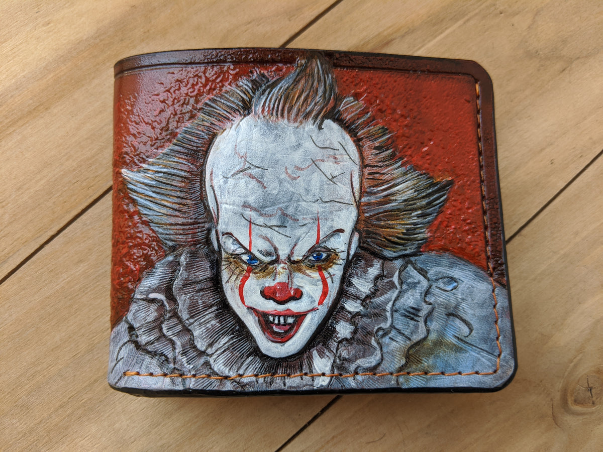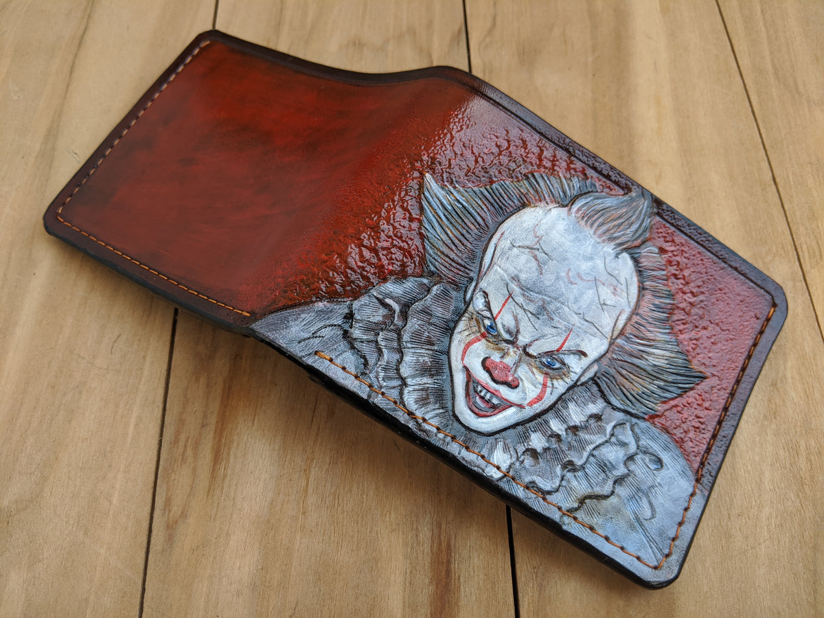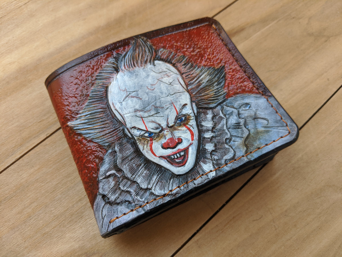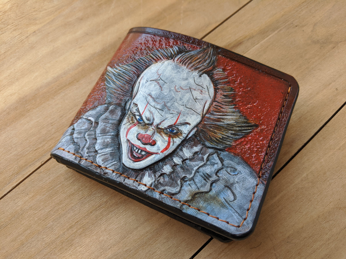 Step into the eerie world of horror with this handcrafted leather bifold wallet, featuring an embossed clown design inspired by It. Made from premium vegetable-tanned leather, this hand-tooled and hand-painted wallet is built to last. With RFID protection to keep your cards safe, it's both stylish and functional. Whether you're a fan of horror movies, Pennywise, or creepy clowns, this wallet is the perfect way to showcase your love for the genre. A must-have gift for horror fans, movie lovers, and collectors!