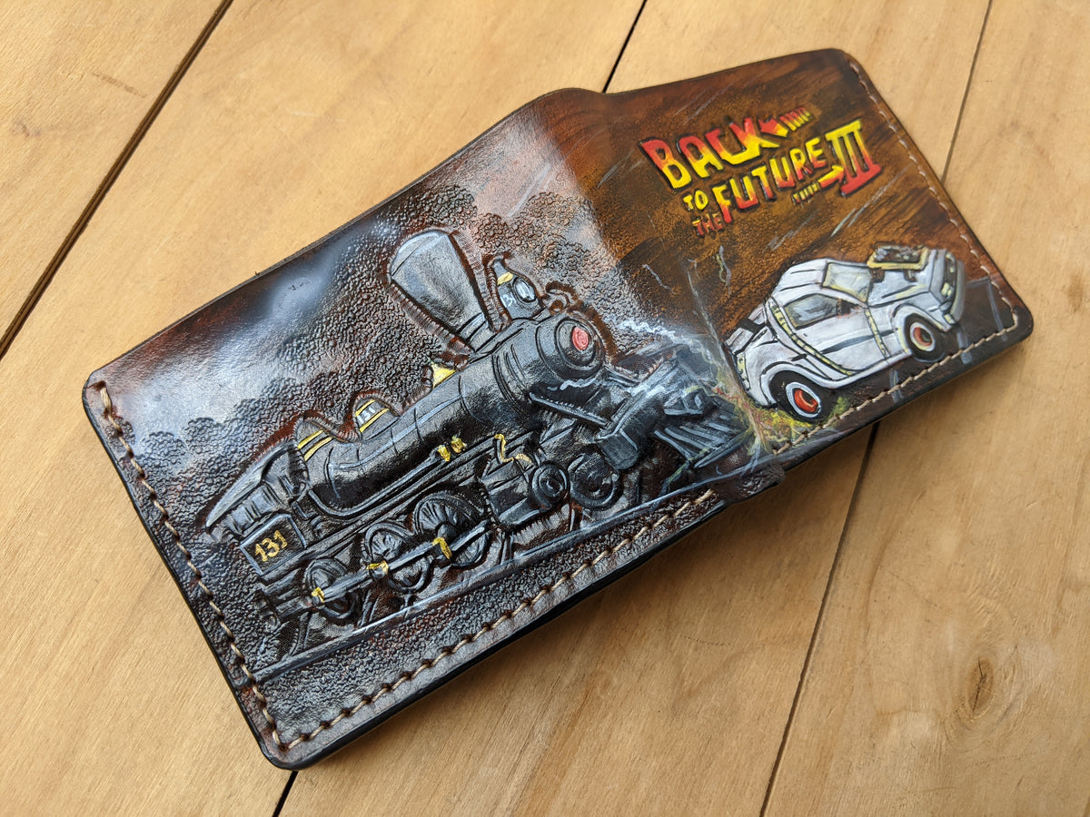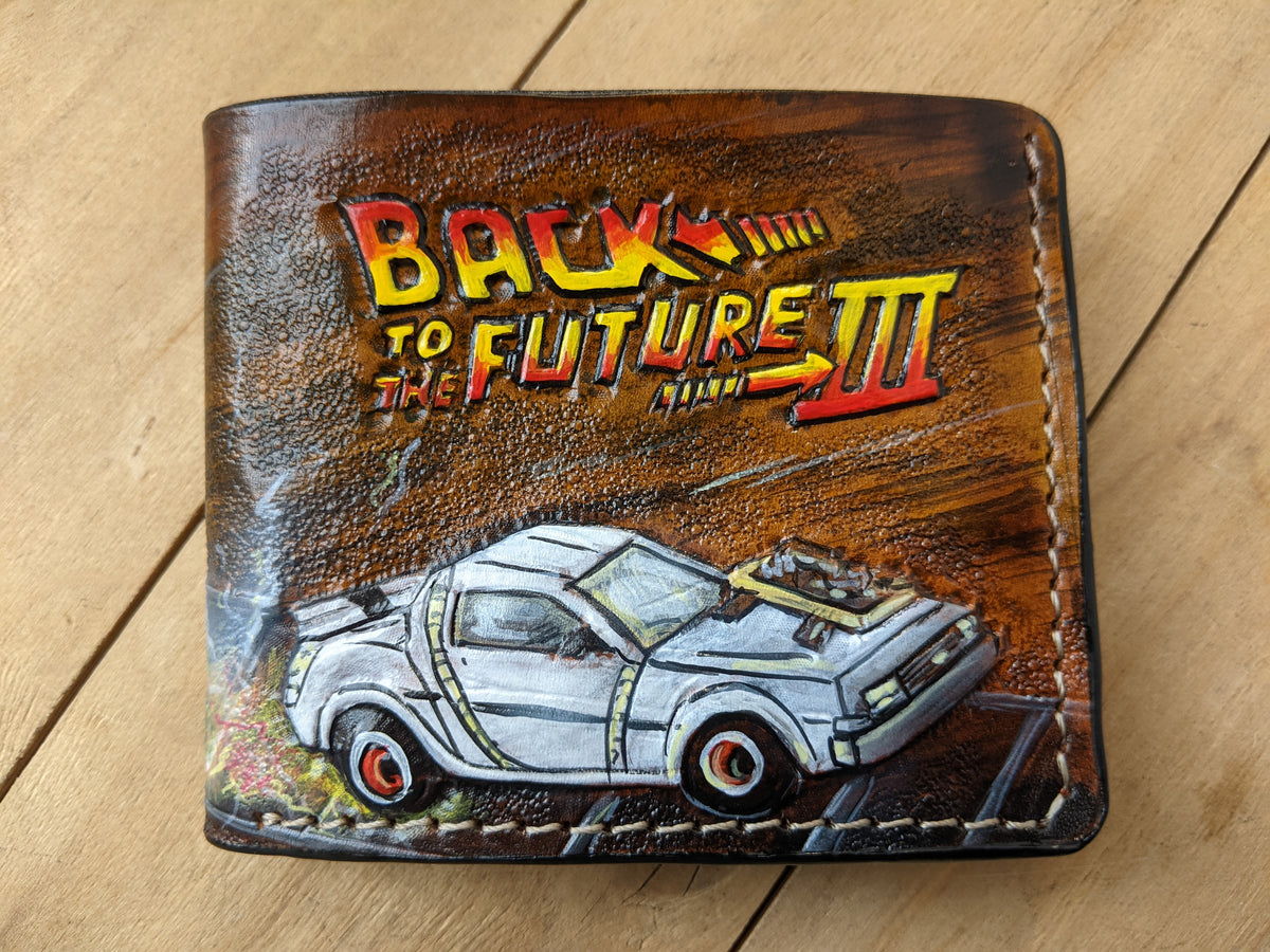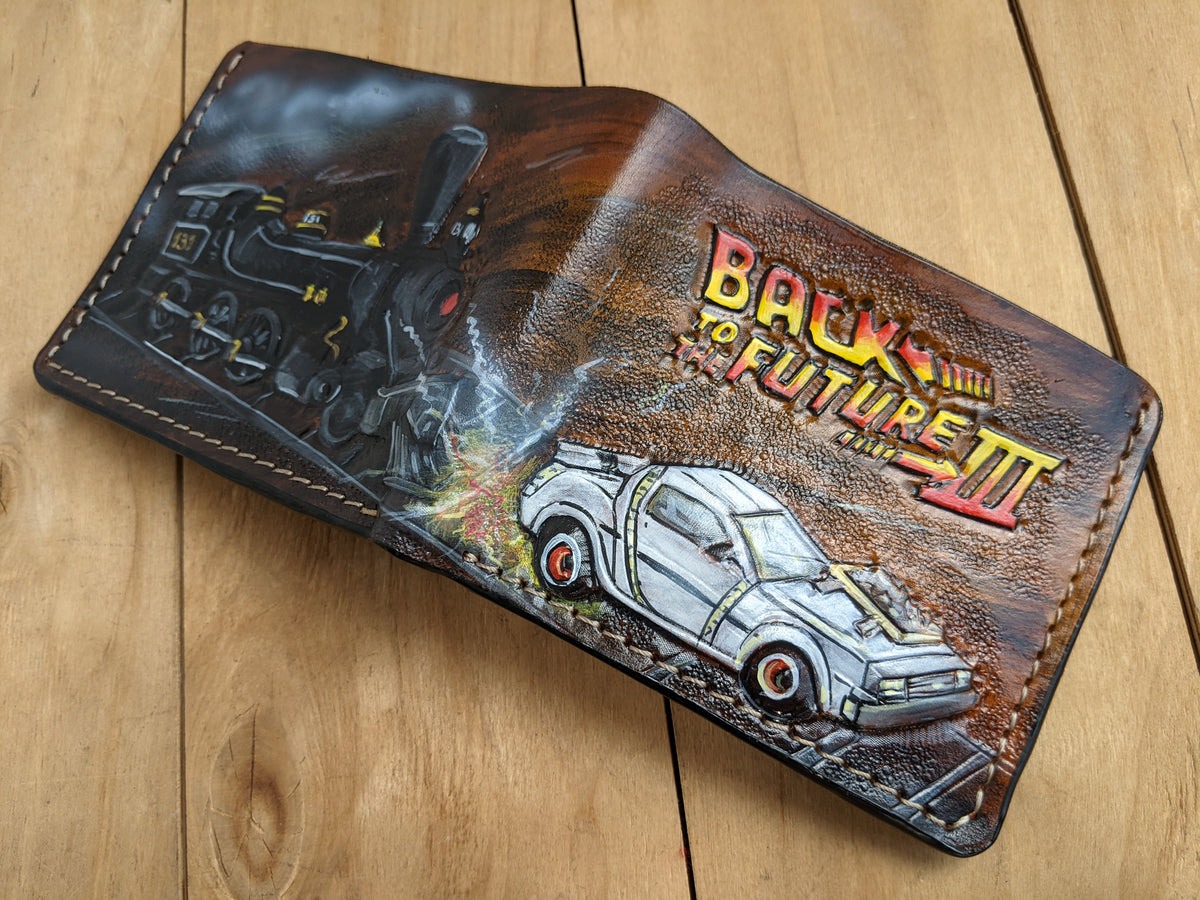 Travel back in time with this handcrafted leather bifold wallet, featuring an embossed DeLorean Time Machine and Train 131 design inspired by Back to the Future. Made from premium vegetable-tanned leather, this hand-tooled and hand-painted wallet is built for durability and style. With RFID protection to keep your cards safe, it’s perfect for fans of Marty McFly, Dr. Emmett Brown, and the legendary DMC DeLorean. A must-have collectible and an ideal gift for Back to the Future fans, movie lovers, and sci-fi enthusiasts!