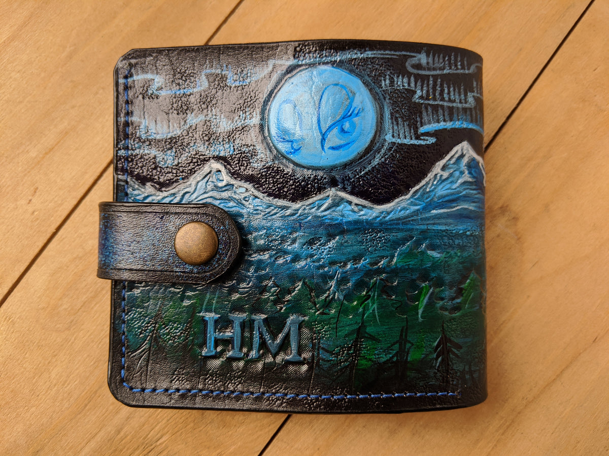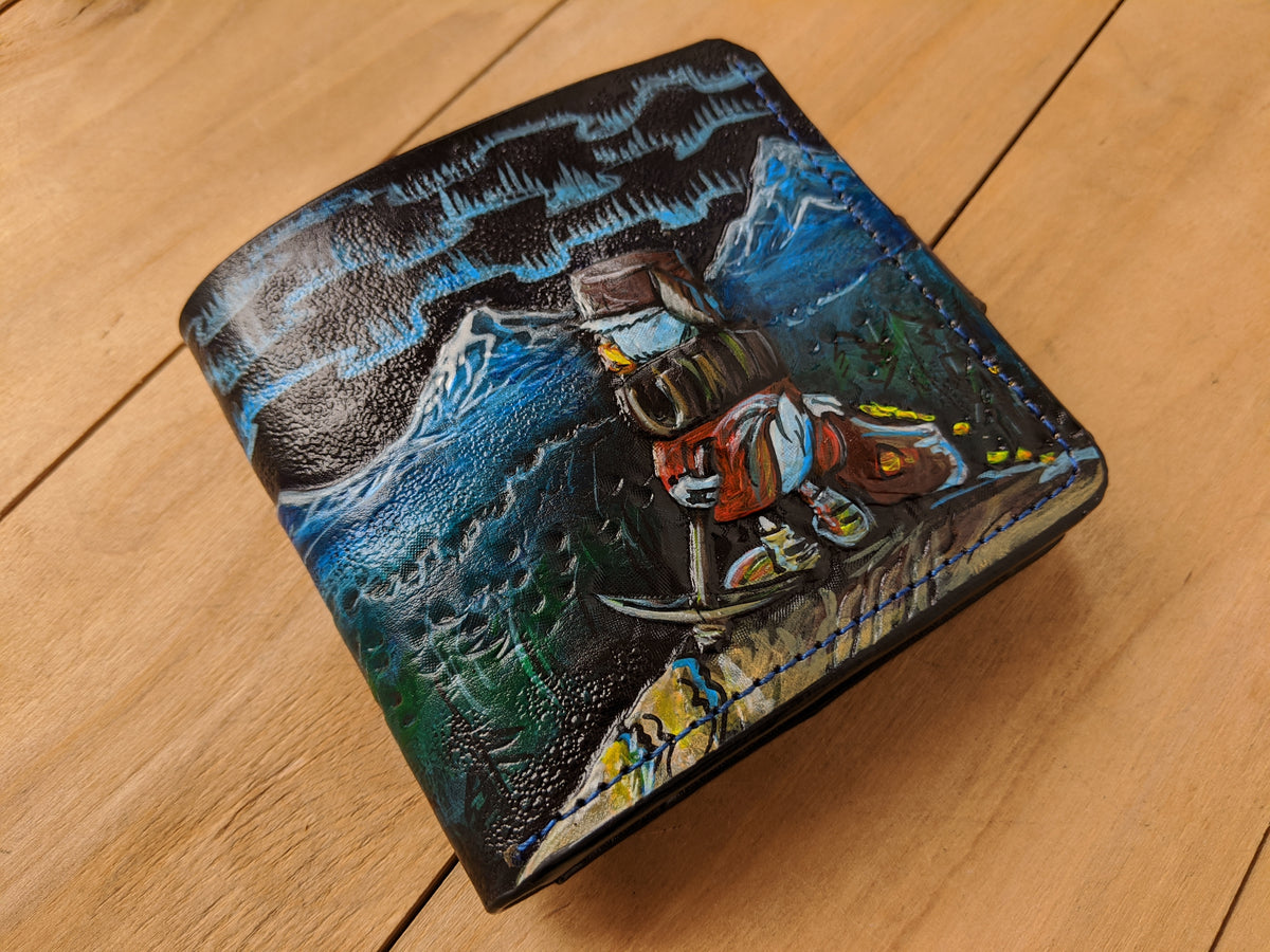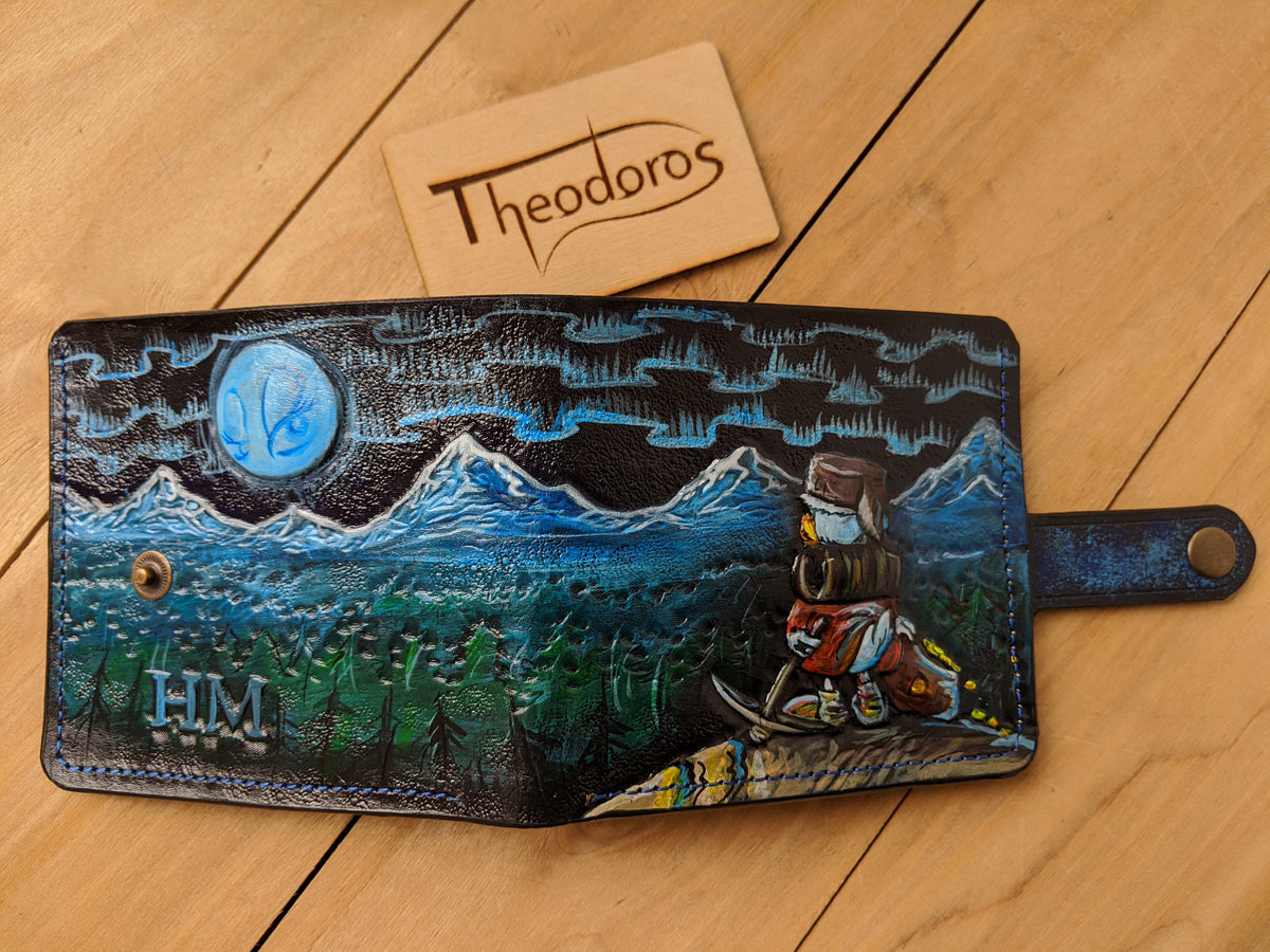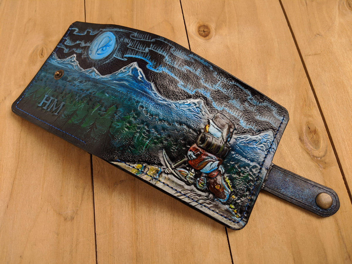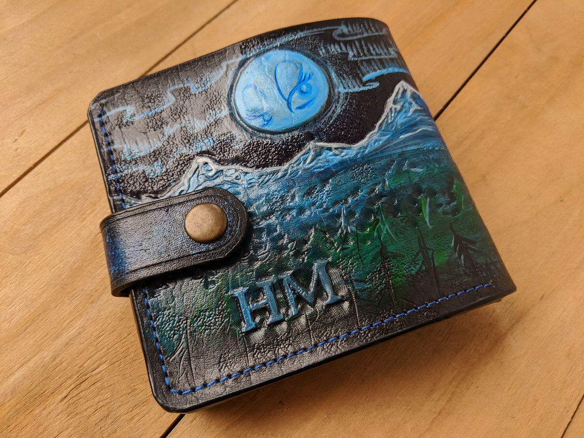 Our exquisite handmade Genuine leather wallet, crafted from high-quality Full Grain Vegetable Tanned Leather. This unique wallet features stunning hand-tooled and hand-painted designs, making it a true work of art.