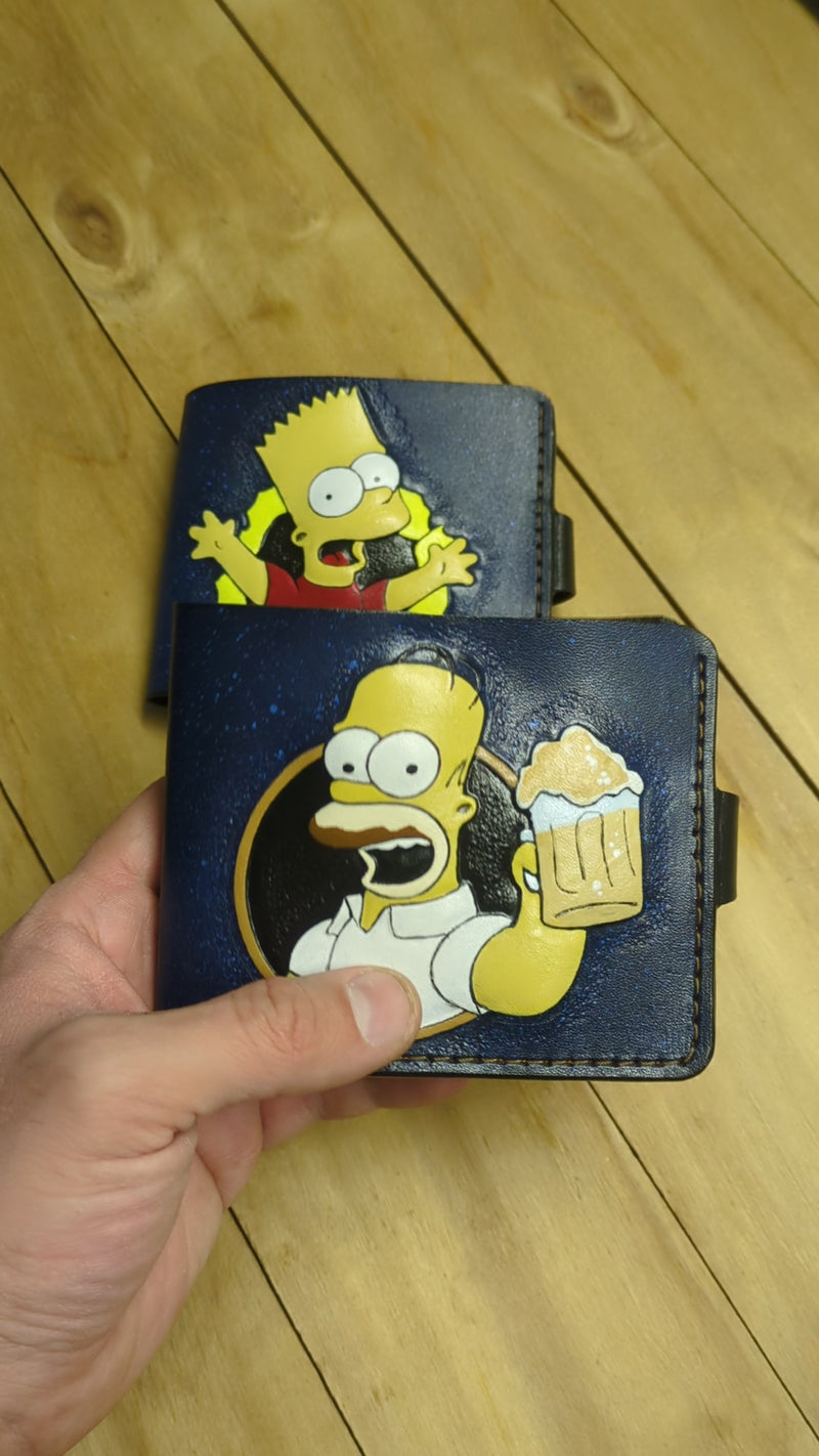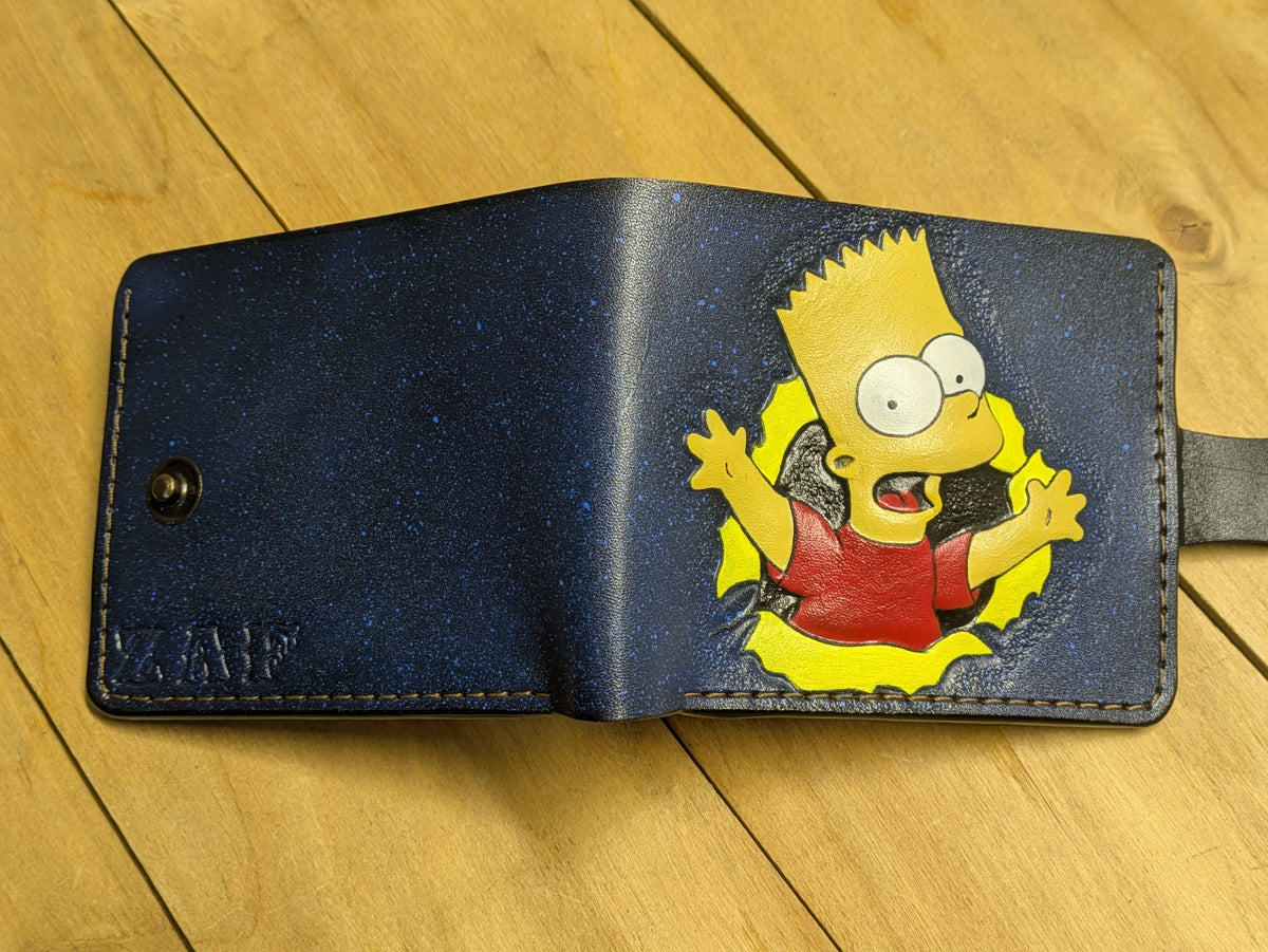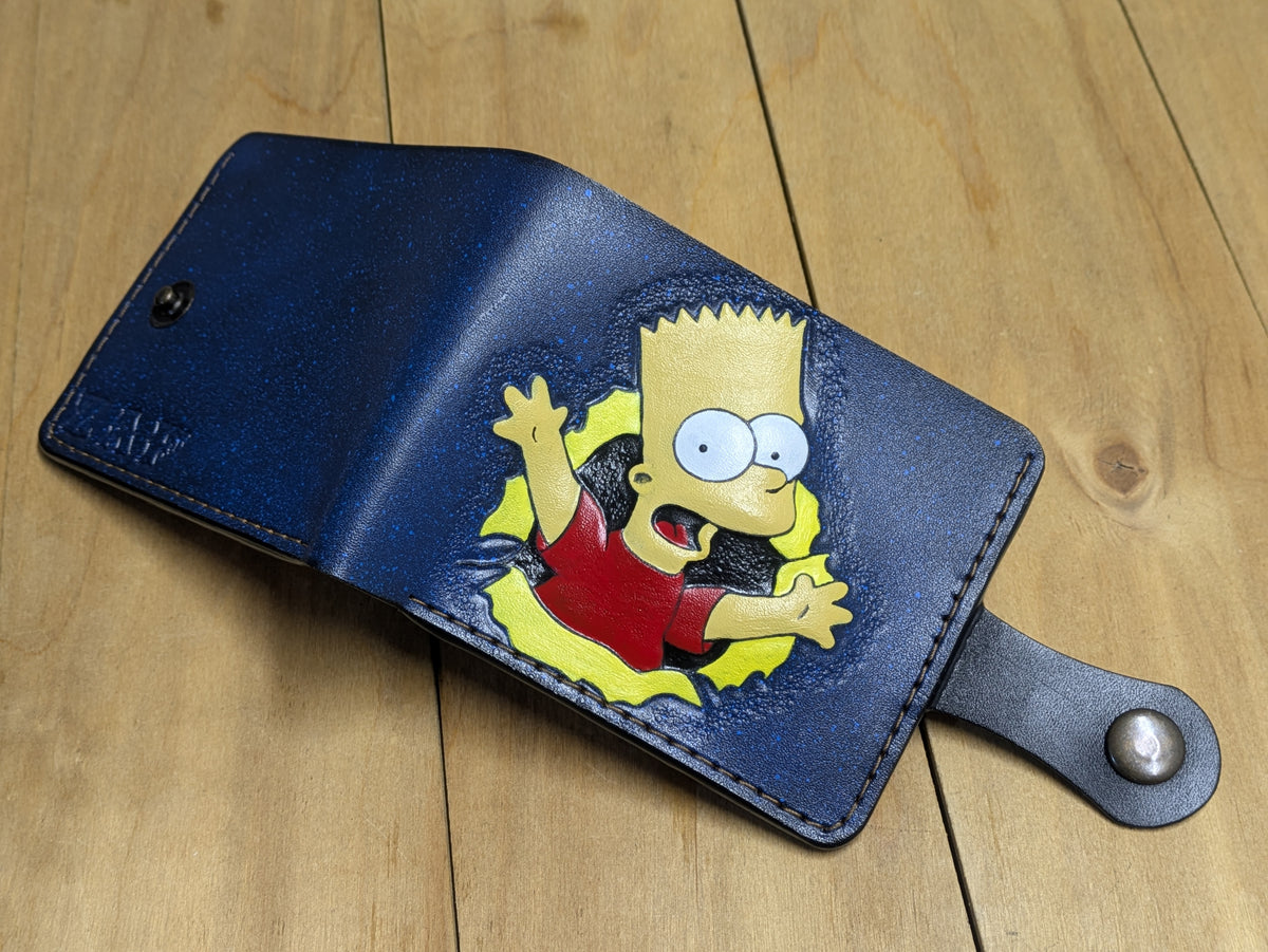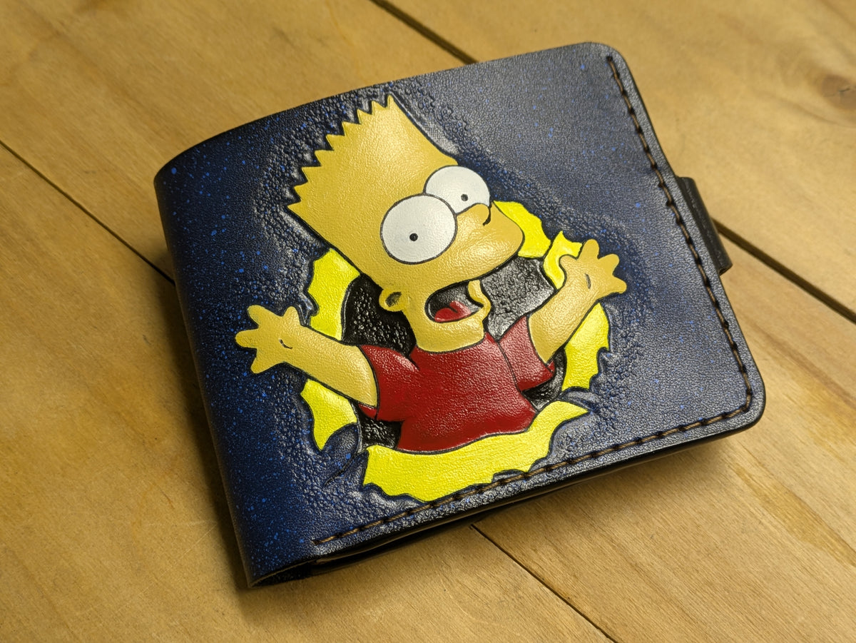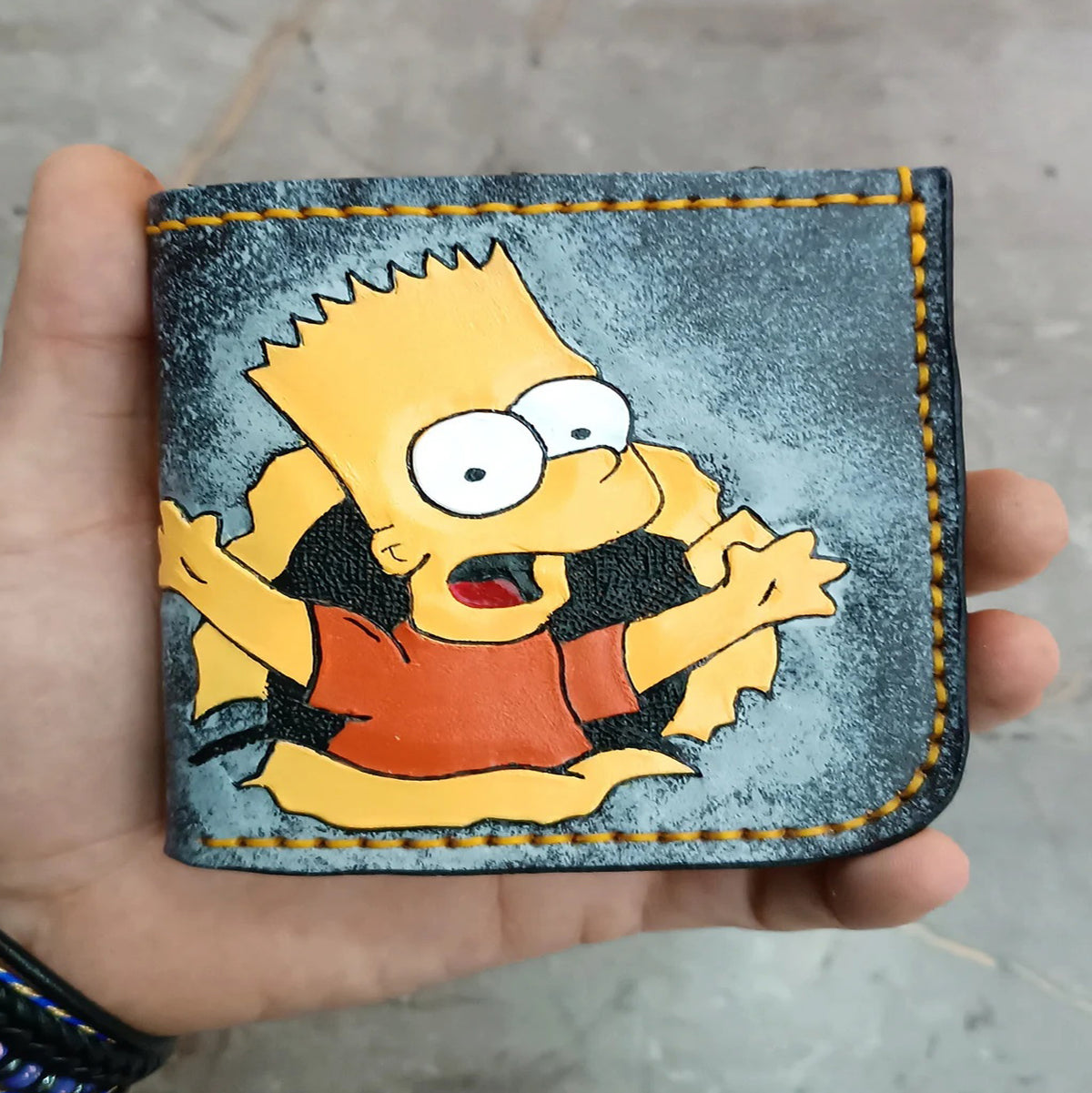 This handmade bifold leather wallet features a stunning embossed and painted design of Bart Simpson, making it a must-have for fans of The Simpsons. Crafted with precision and durability, this biker wallet combines artistic detail with practical functionality. A unique and thoughtful gift for him, perfect for anyone who loves The Simpsons or appreciates handmade, high-quality wallets.