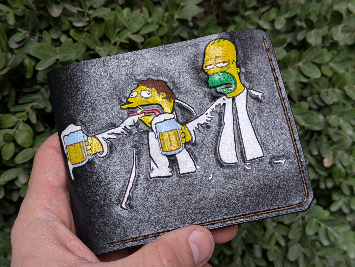 Elevate your style with this handmade leather bifold wallet featuring the iconic "Bad Mother Fucker" design, inspired by Pulp Fiction and the Simpsons. Crafted with premium materials, this wallet offers RFID protection and biker-friendly durability. Perfect for fans of Jules Winnfield, Vincent Vega, and Mia Wallace, it’s a must-have for movie buffs and collectors. An ideal gift for him, Simpsons enthusiasts, or anyone who loves unique Pulp Fiction-inspired accessories.