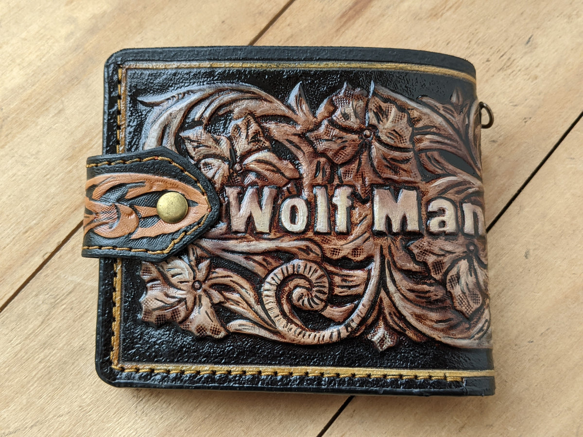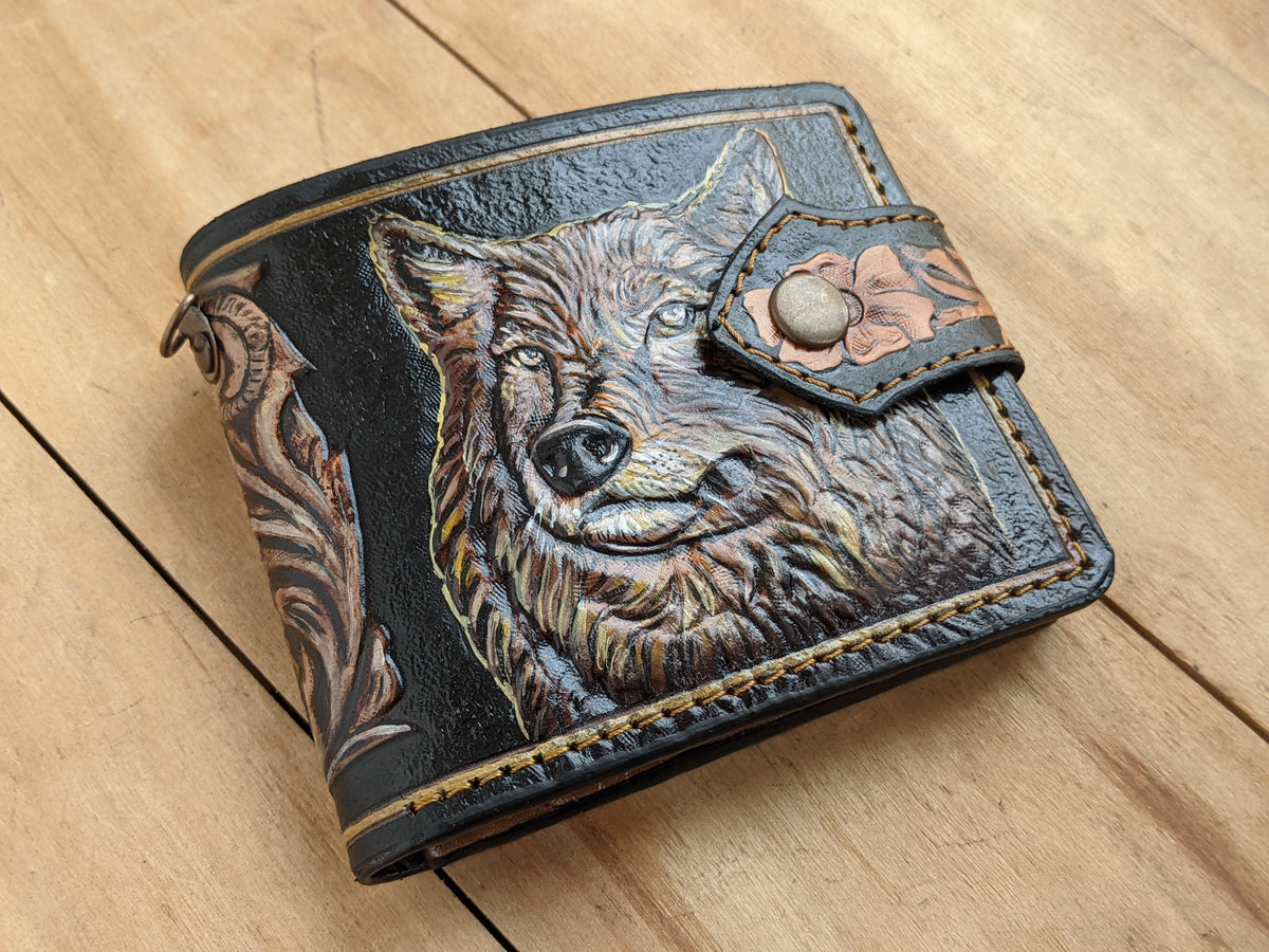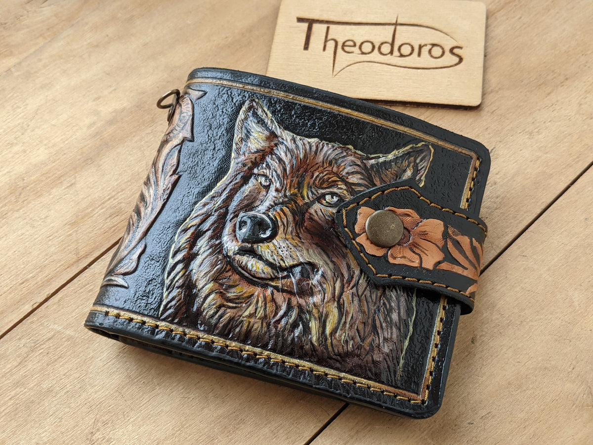 Our exquisite handmade leather wallet, crafted from high-quality vegetable-tanned leather. This unique wallet features stunning hand-tooled and hand-painted designs, making it a true work of art.
