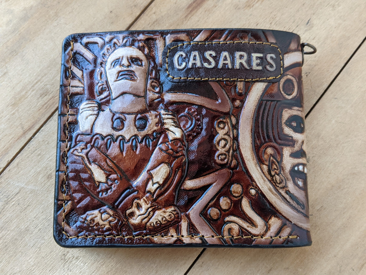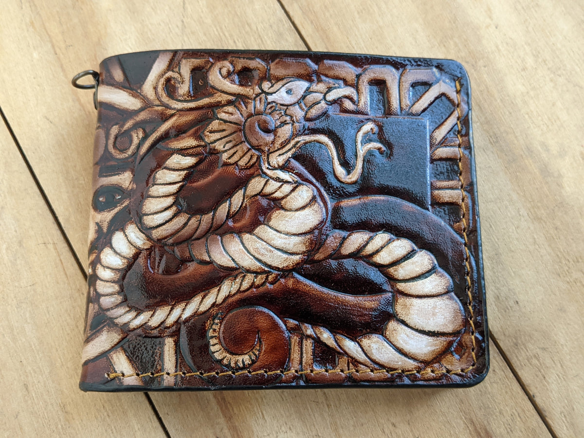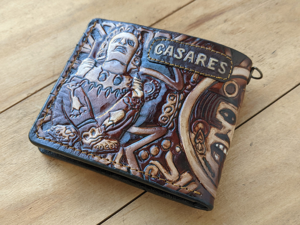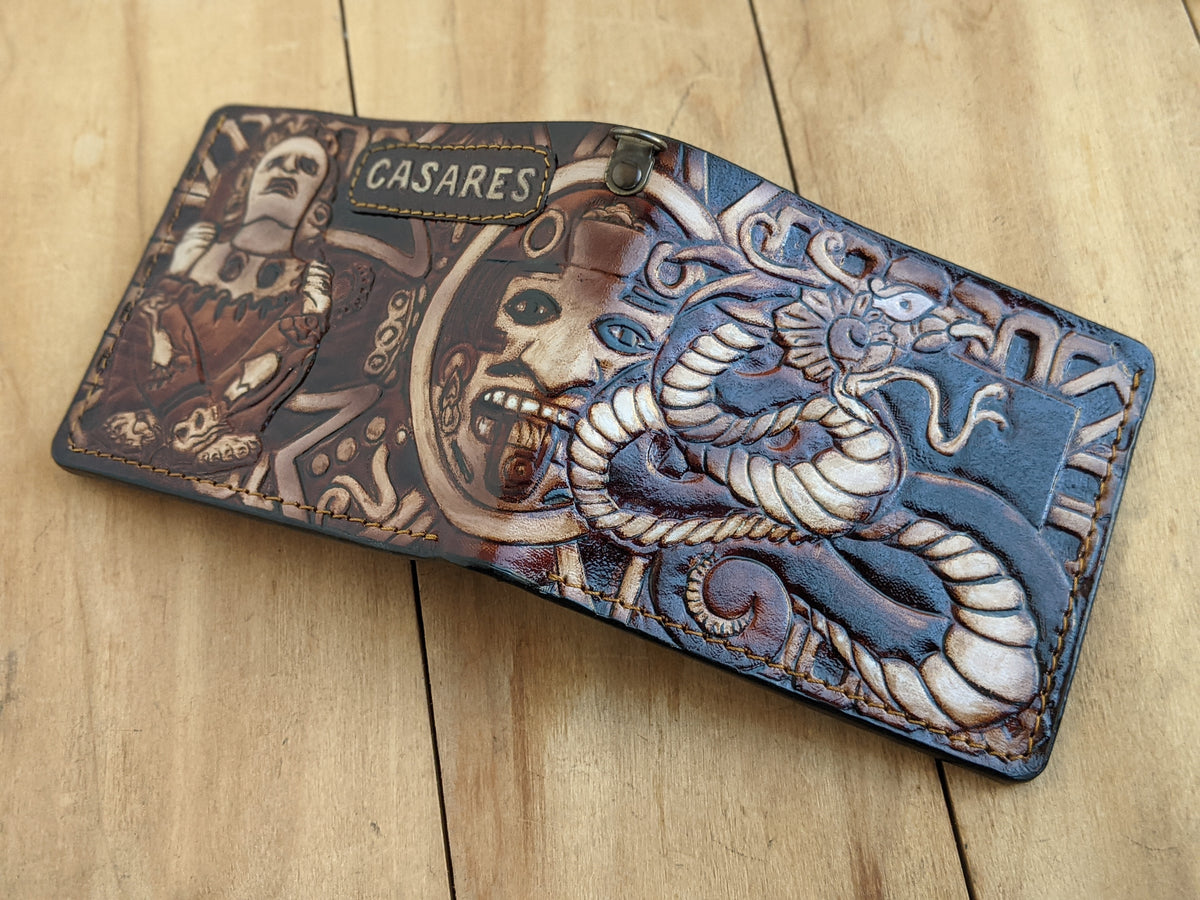 Our exquisite handmade leather wallet, crafted from high-quality vegetable-tanned leather. This unique wallet features stunning hand-tooled and hand-painted designs, making it a true work of art.