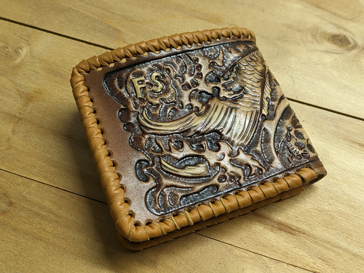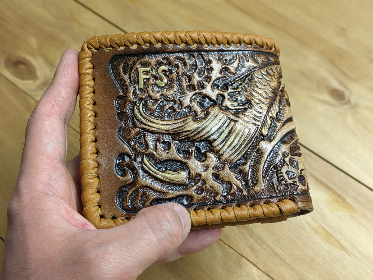 Our exquisite handmade leather wallet, crafted from high-quality vegetable-tanned leather. This unique wallet features stunning hand-tooled and hand-painted designs, making it a true work of art.
