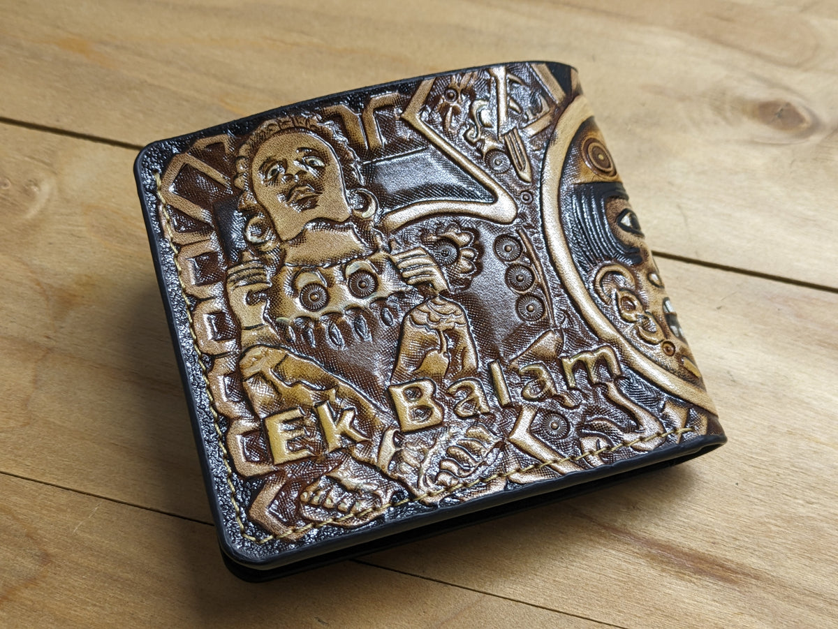 Our exquisite handmade leather wallet, crafted from high-quality vegetable-tanned leather. This unique wallet features stunning hand-tooled and hand-painted designs, making it a true work of art.