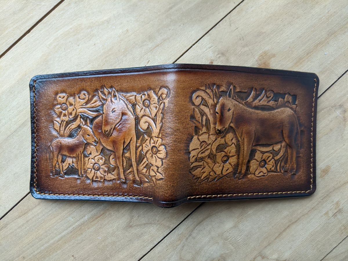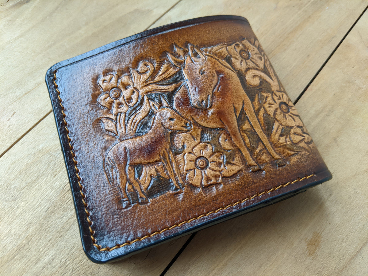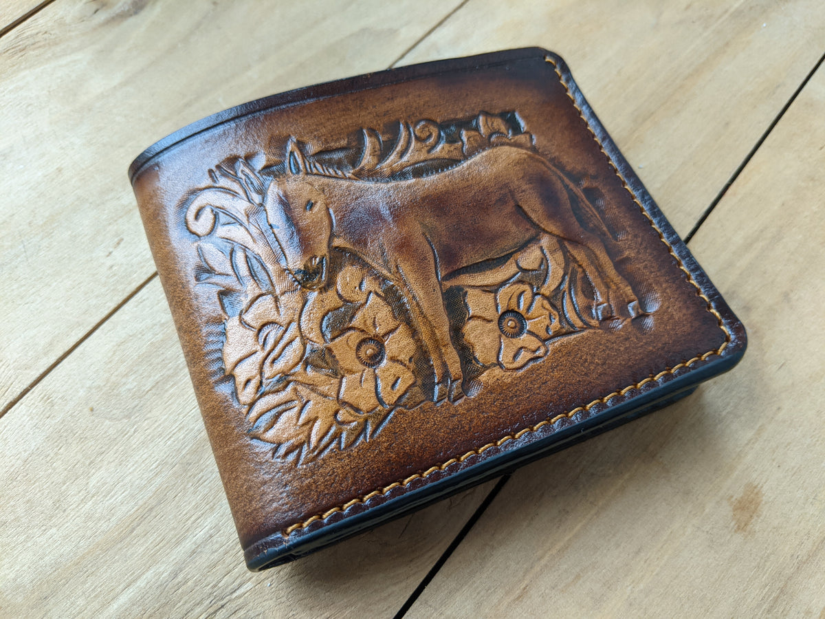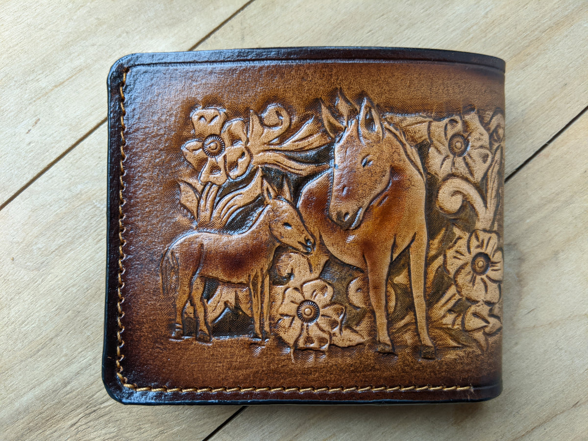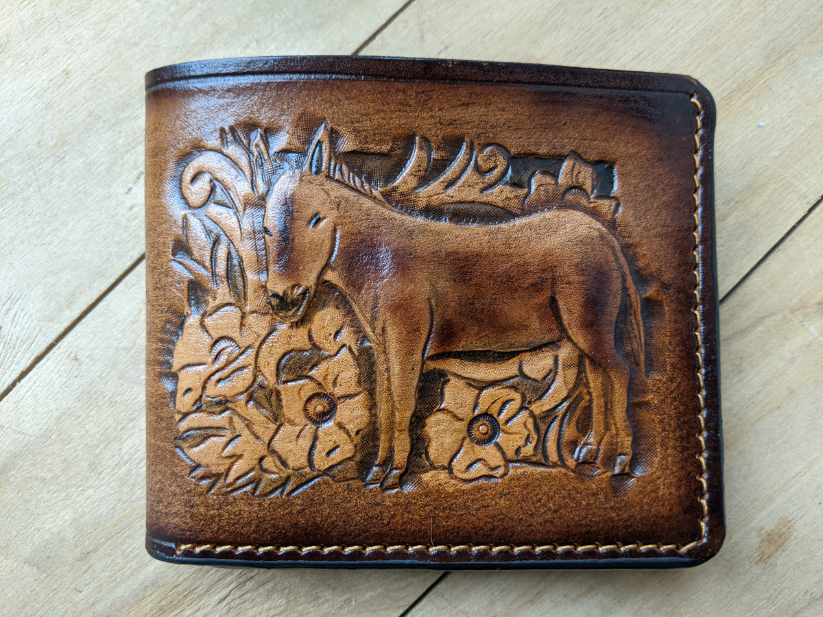 This handcrafted bifold leather wallet features a unique combination of a finely embossed donkey and intricate floral patterns in classic Sheridan Western style. Made from high-quality leather with RFID protection, this wallet offers both artistic flair and functional design. Perfect for Western style enthusiasts, animal lovers, and anyone looking for a rustic yet elegant handmade gift.