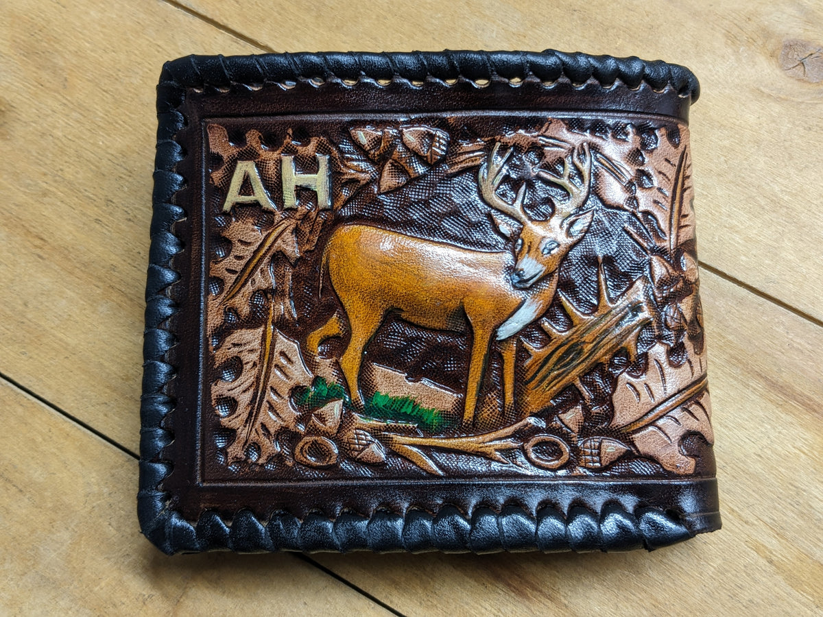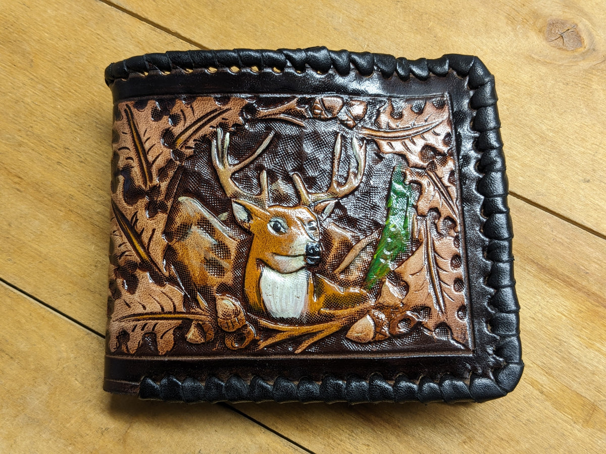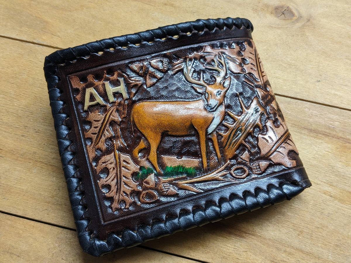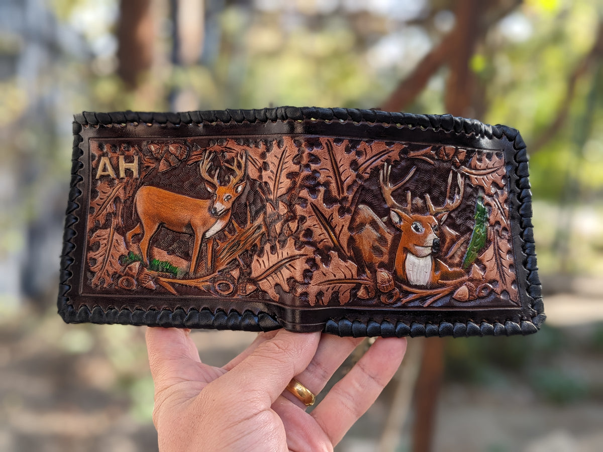 Celebrate the spirit of the wild with this handmade bifold leather wallet featuring embossed deer, elk, moose, and oakleaf designs—crafted in a rustic, hunting-inspired style. Meticulously hand-tooled and built with RFID protection, this wallet blends traditional craftsmanship with modern utility. A perfect gift for hunters, outdoorsmen, wildlife enthusiasts, and lovers of Western and nature-themed leather gear.
