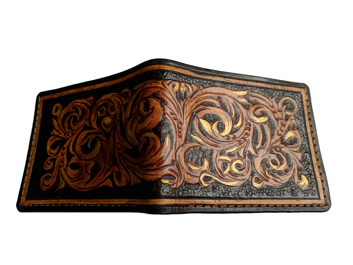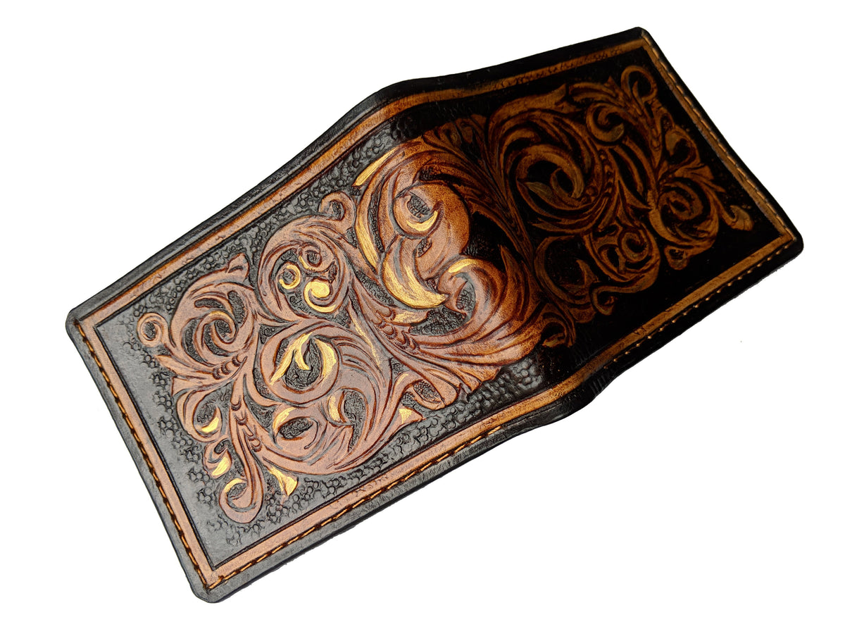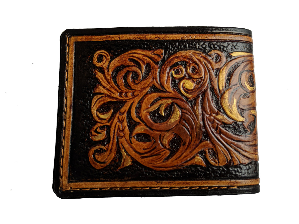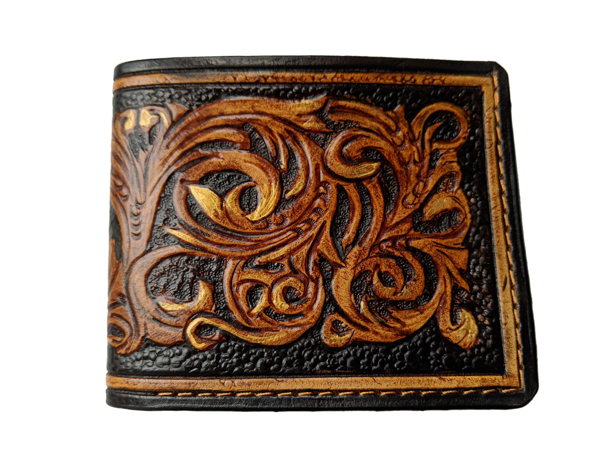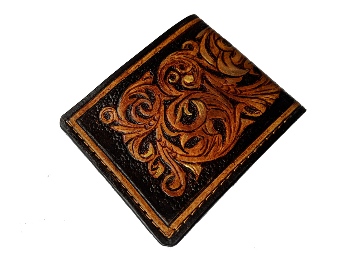 Our exquisite handmade leather wallet, crafted from high-quality vegetable-tanned leather. This unique wallet features stunning hand-tooled and hand-painted designs, making it a true work of art.